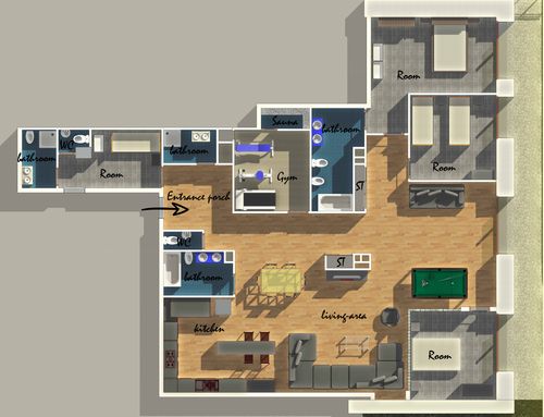 I would like to create a small gym, 3 bathrooms, one of which is in the master bedroom.