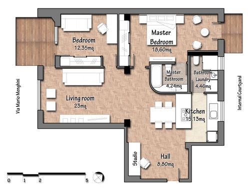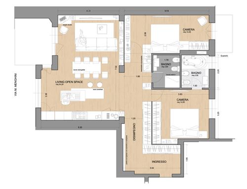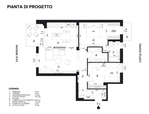 Luminoso appartamento collocato a Roma al secondo piano di un palazzo che affaccia a sinistra su via Menghini e a destra su una tranquilla chiostra interna. Gli scarichi sono collocati nella parete di separazione tra la cucina e il bagno. Sono inoltre presenti tre colonne portanti indicate in planimetria. Tutte le pareti interne, tranne quella con gli scarichi, possono essere abbattute per ridistribuire gli spazi. Il riscaldamento è centralizzato.