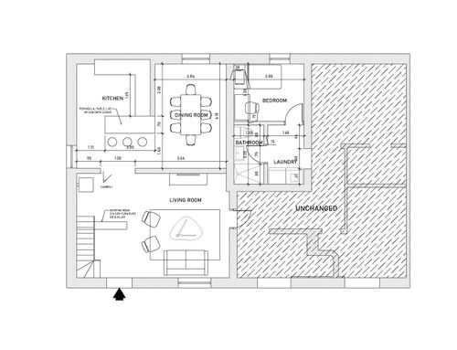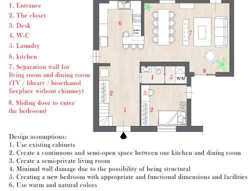 In our project, the extension of the Living area in particular is foreseen. We would like to add a peninsula or island with only a countertop or snack function, and a separate table (8 - 10 pax). The kitchen hob with relative connections (brown kitchen corner as in the attached photo) remains unchanged, as it has been recently renovated. Create a single bedroom with access from the sleeping area and a small laundry room or toilet only. You will have access to the upper floor from the existing staircase located next to the main entrance close to which we would like to create a hallway to screen the direct view of the cooking area with alternative solutions to the masonry works.
