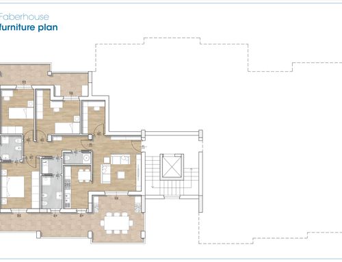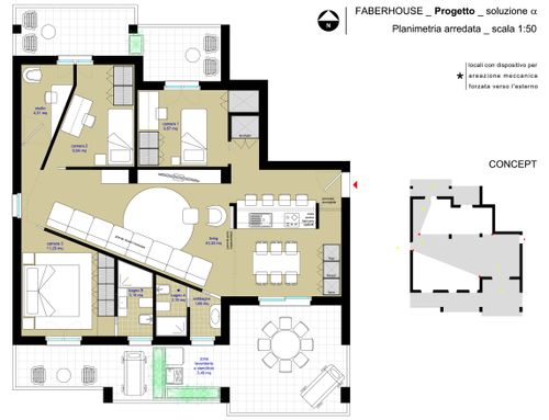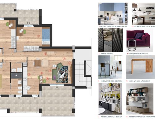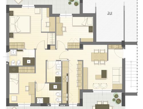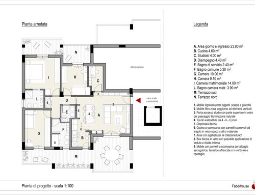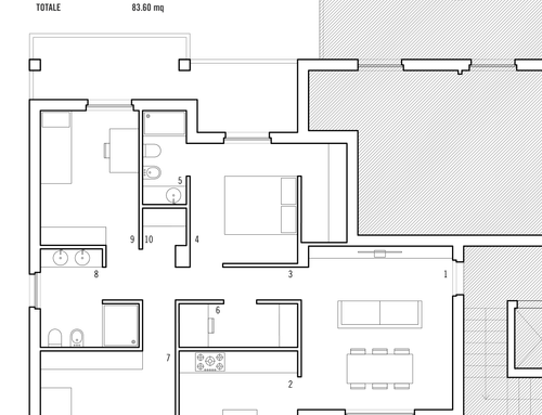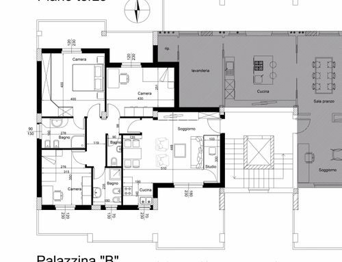 L'appartamento è in fase di realizzazione. Vorrei sfruttare al massimo i circa 100mq. + ampi terrazzi. La piantina indica la sala da pranzo sul lato sud e la cucina lato nord. Noi vorremmo la cucina contigua alla sala da pranzo. La cucina non deve essere grande ma funzionale con la possibilità con un piccolo tavolo o penisola di poterci mangiare.