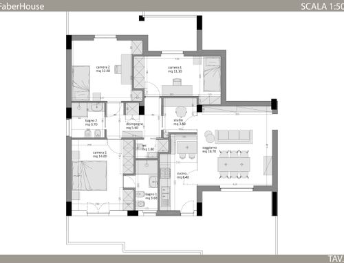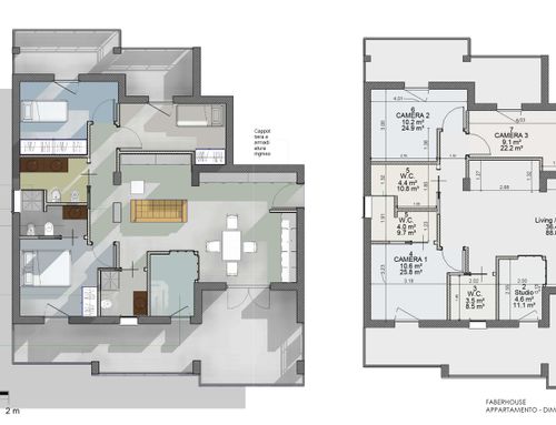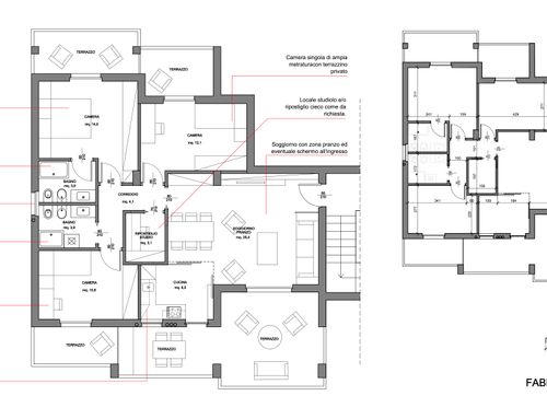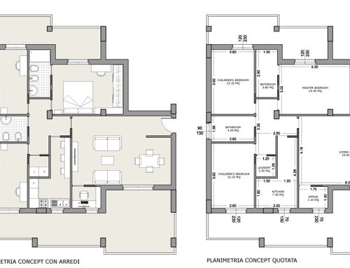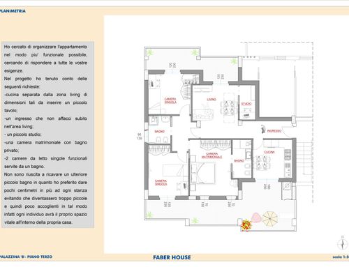 Se per le dimensioni questo non fosse possibile in alternativa potremmo valutare un open space magari con la possibilità di essere separato all'occorrenza con una porta scorrevole. Delle 3 camere, la matrimoniale non deve essere necessariamente la piu grande, anzi può essere anche la piu piccola purchè funzionale. Le due camerette per i bambini di dimensione normali e funzionali anch'esse.