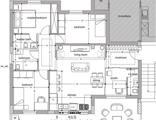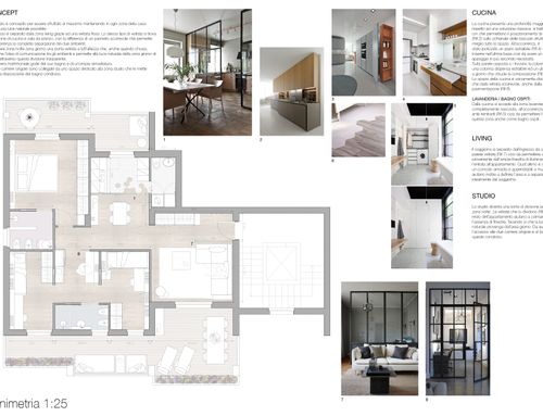 Vorrei vedere una sorta di divisorio per evitare che aprendo la porta di accesso all'appartamento chiunque si ritovi direttamente nel soggiorno. Vorrei sfruttare ogni spazio per eventuali ripostigli o armadi a muro.