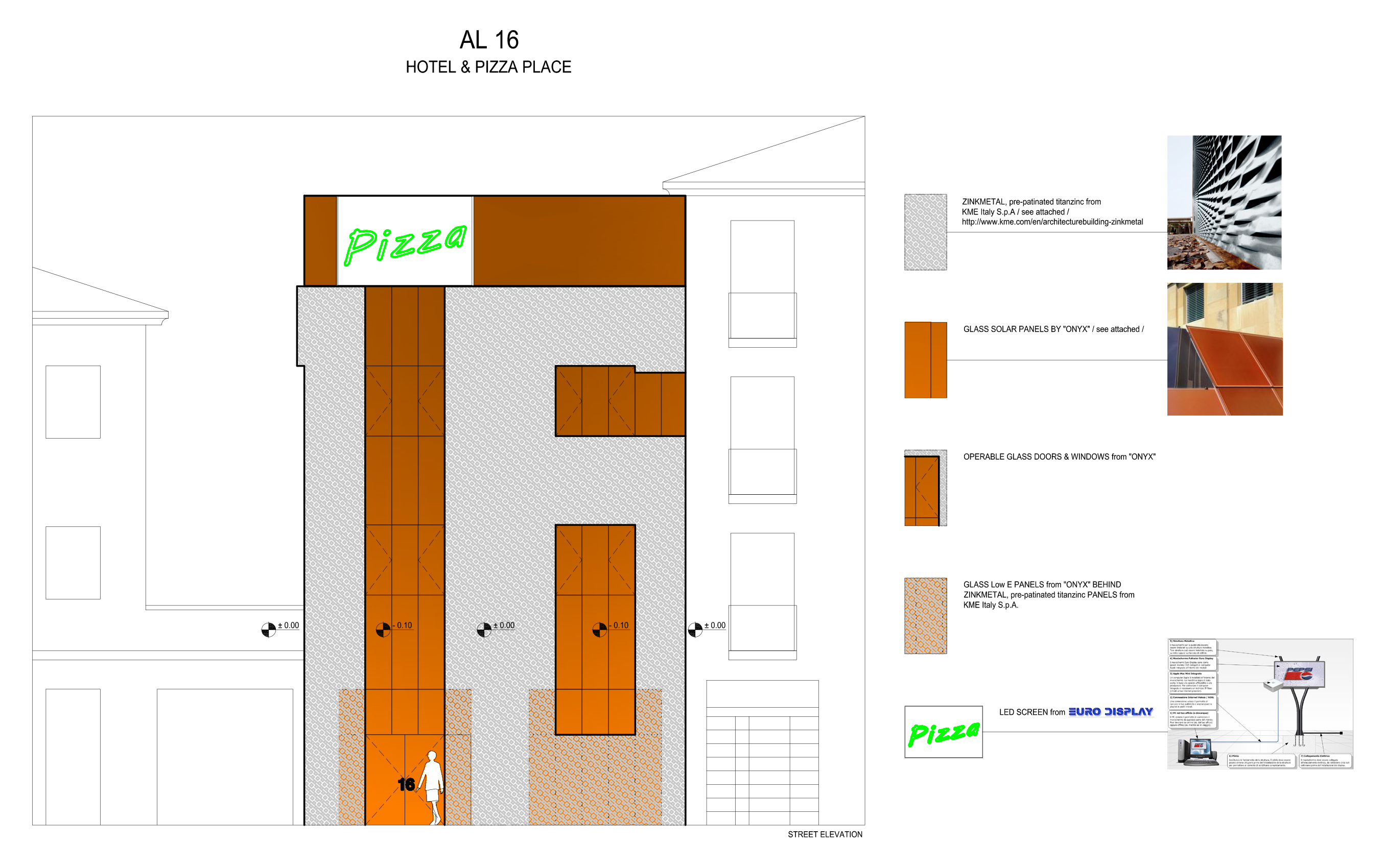 La facciata dovrà obbligatoriamente contenere un pannello pubblicitario a LED delle dimensioni di 3 mt di larghezza e 2 mt di altezza, inoltre la facciata dovrà contenere pannelli di solare termico per circa 5 mq in verticale e circa 10 mq di pannelli fotovoltaici in orizzontale sulla sommità della facciata.