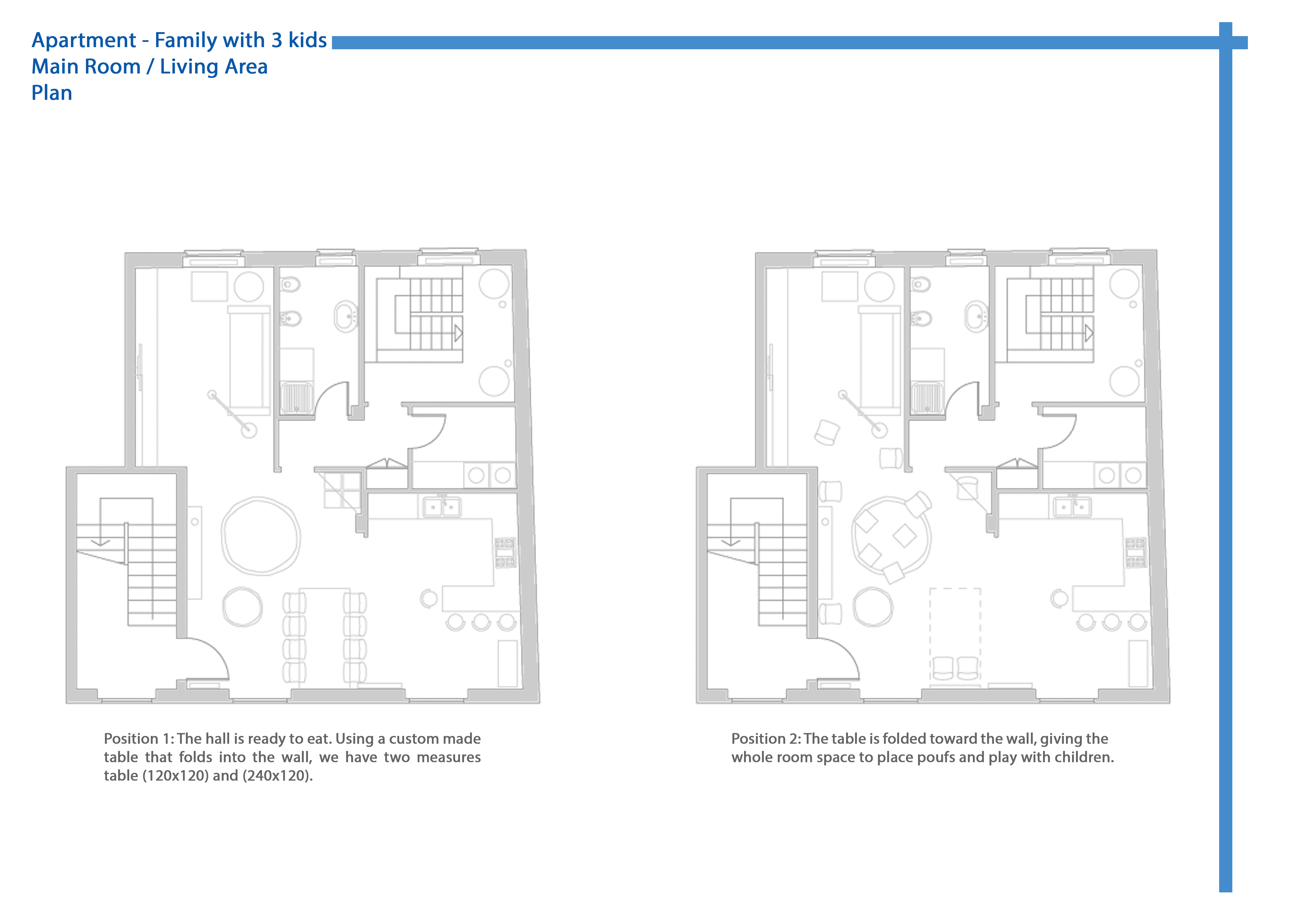 We are a family with 3 kids: 3 - 5 - 7 yo. We recently had the opportunity to expand the available space ve live in, by purchasing the apartment located on the lower level compared with our current one. This allows us to transform our current apartment in a sleeping area, and to have separate bedrooms for each of the three children, as they grow (this transformation is not the subject of this contest)