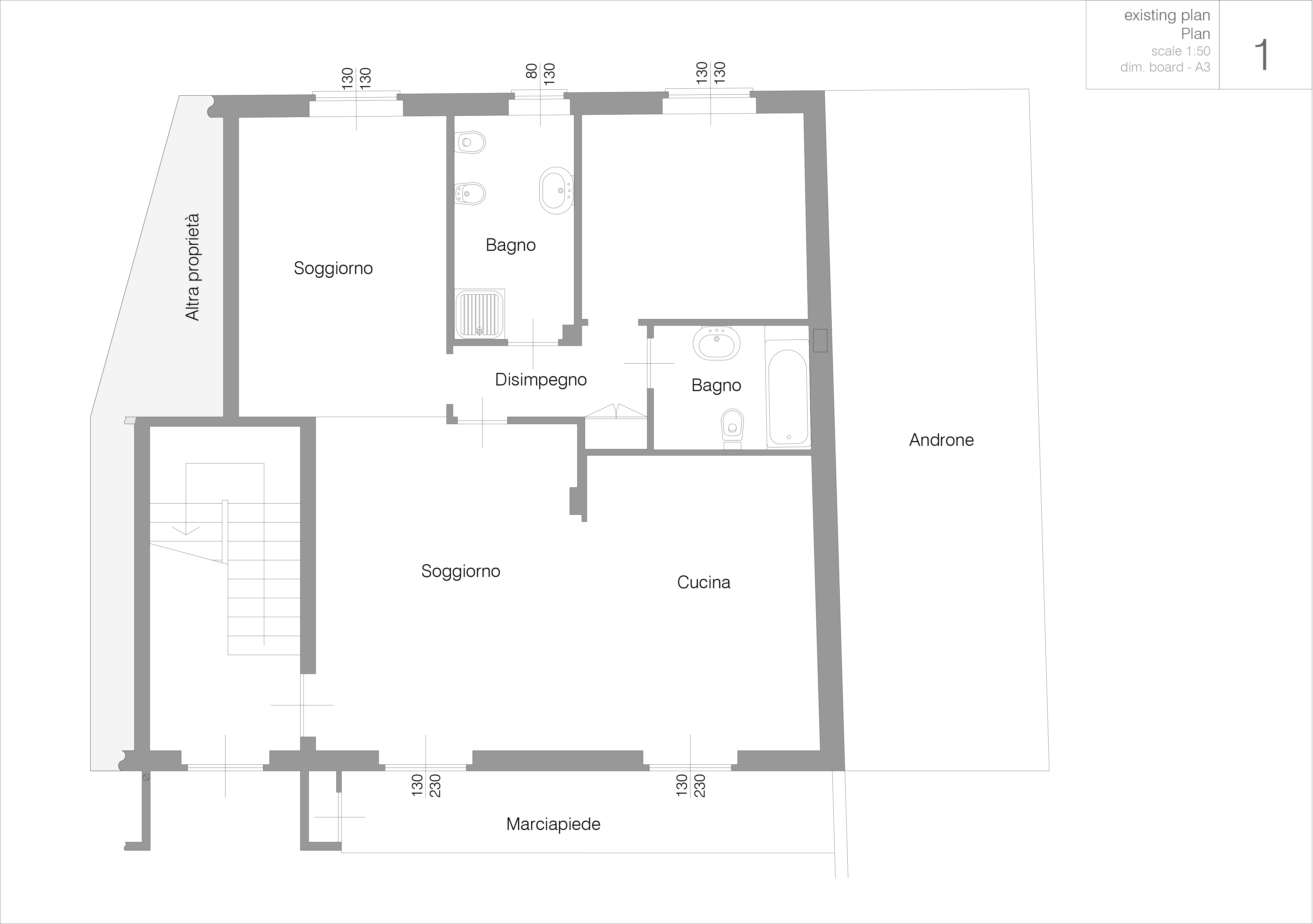 An important detail: we enclose both the plan of the current state and the one presented for the request of authorization to start work, where we have already declared the changes of masonry (of course the creation of the stair, and the inclusion of the old bedroom to the living room open space). Masonry work was not yet made, so different options can be considered (but we are trying to minimize the work, also to avoid too much impact on wiring and hydraulics)