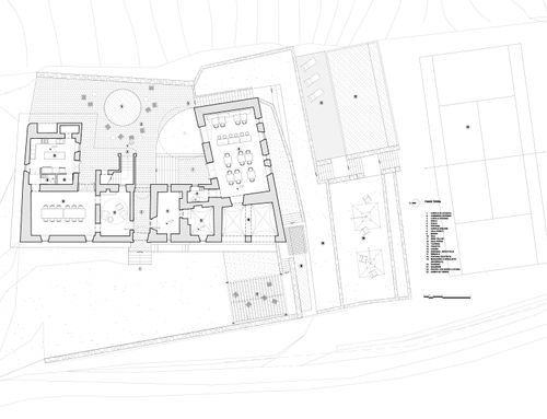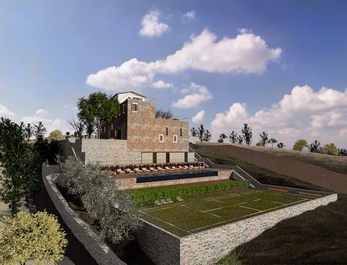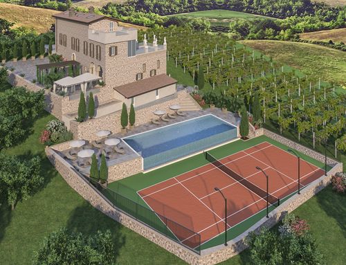 Recovery in compliance with functionality, axonometry is requested at a height other than 0 that allows the building and the surrounding area to be viewed from above. Check the possibility of: 1 creating a sleeping area in the attic, which will be raised during the renovation and eliminating the pitch of the roof to the west, and part of the roof to the south, to create a flat roof that serves as a terrace. In the outdoor areas I would like to provide the following. WEST area: garden for refreshments and pergola, SOUTH area starting from the villa: small warehouse and changing rooms, first pool terrace with south infinity edge, second sun terrace and tennis court, EAST area: entrance with connection function, to insert central fountain