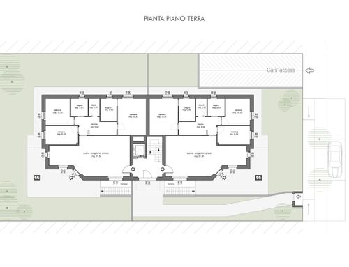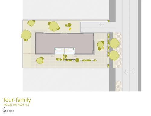 La quadrifamiliare sarà costruita su un lotto rettangolare con un solo accesso carraio e gli ingressi pedonali saranno dal marciapiede.