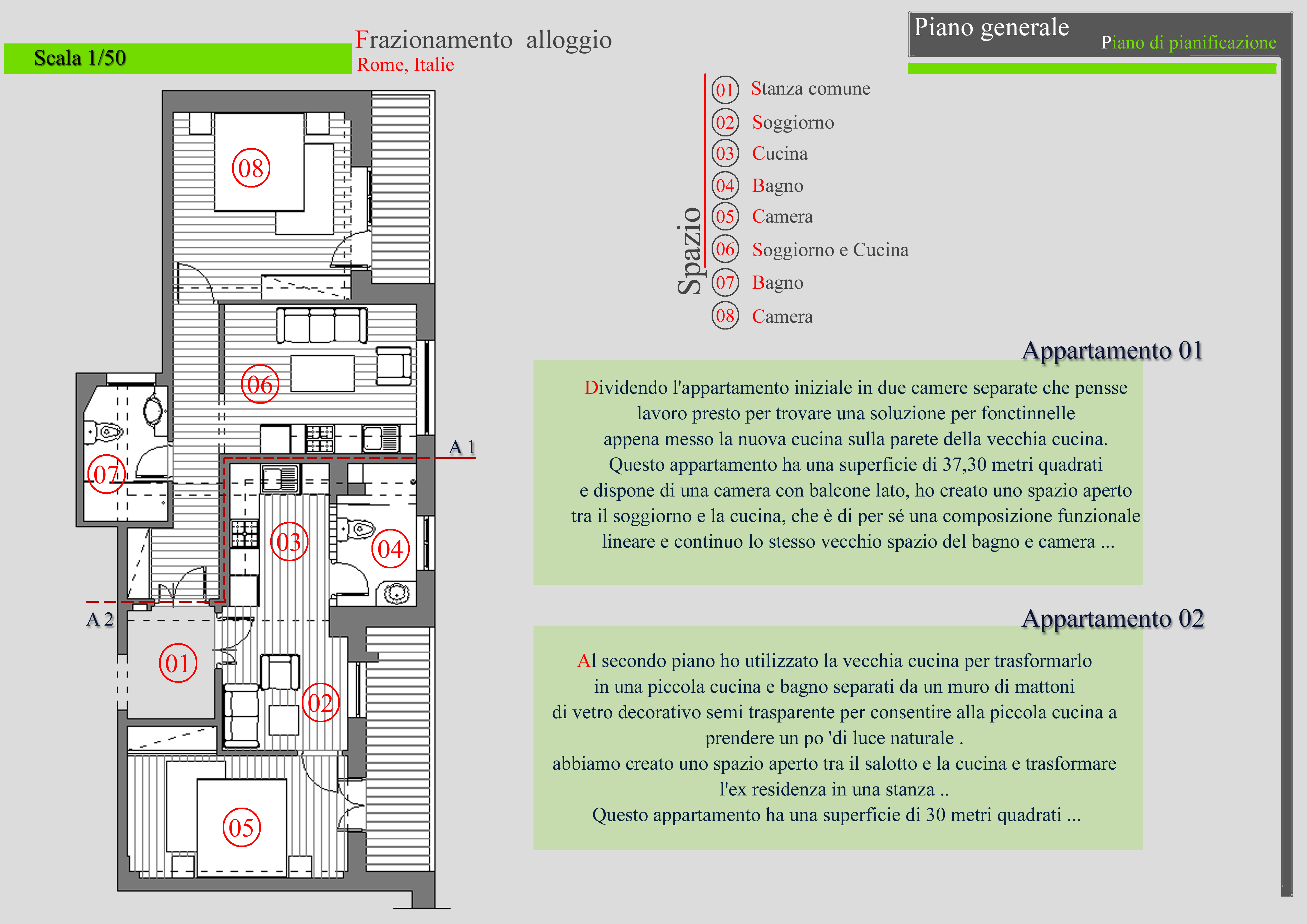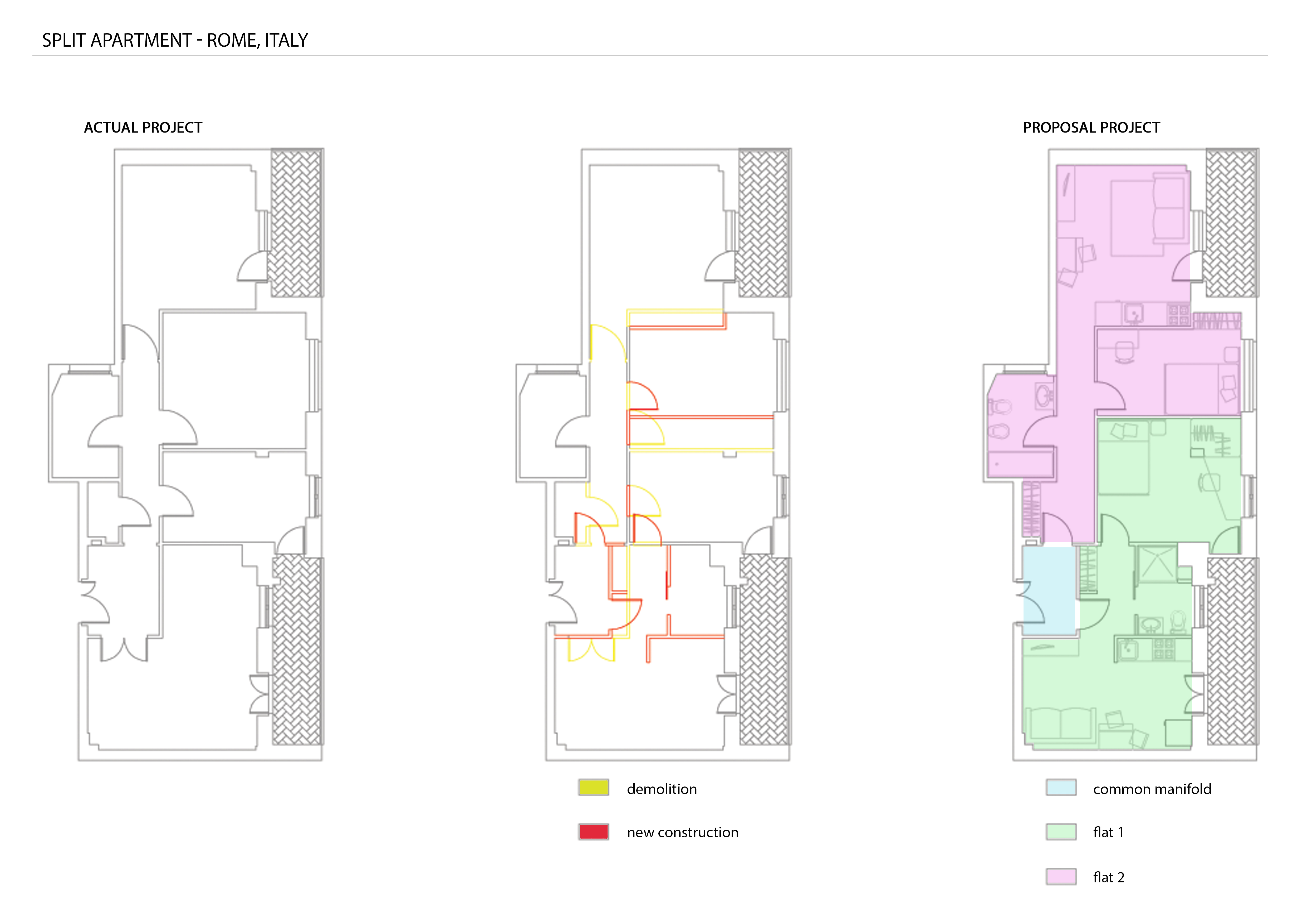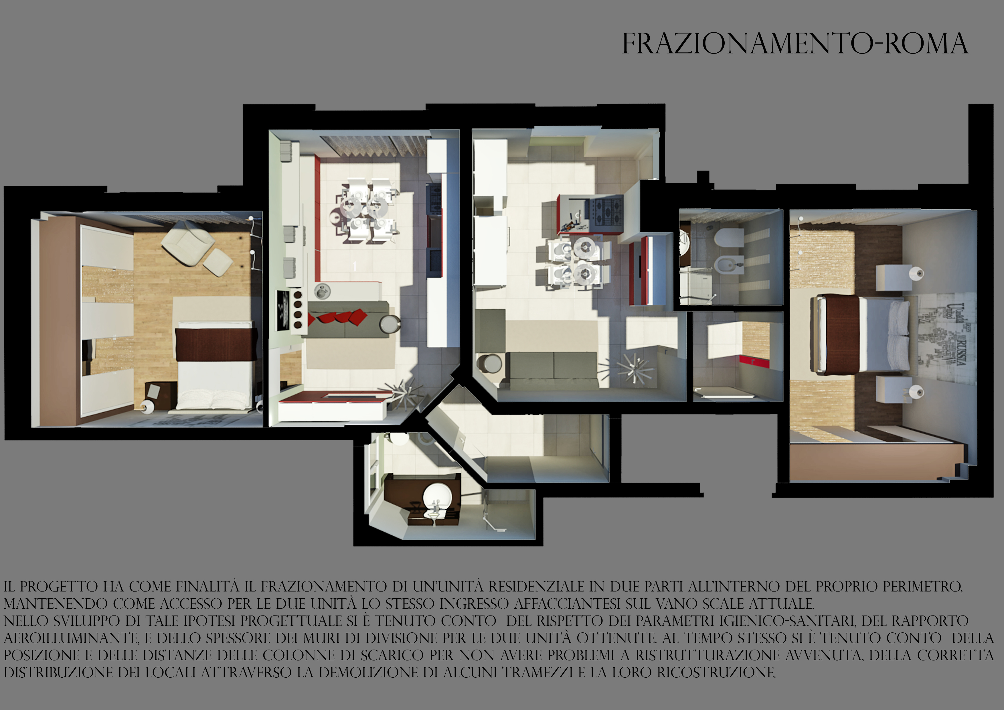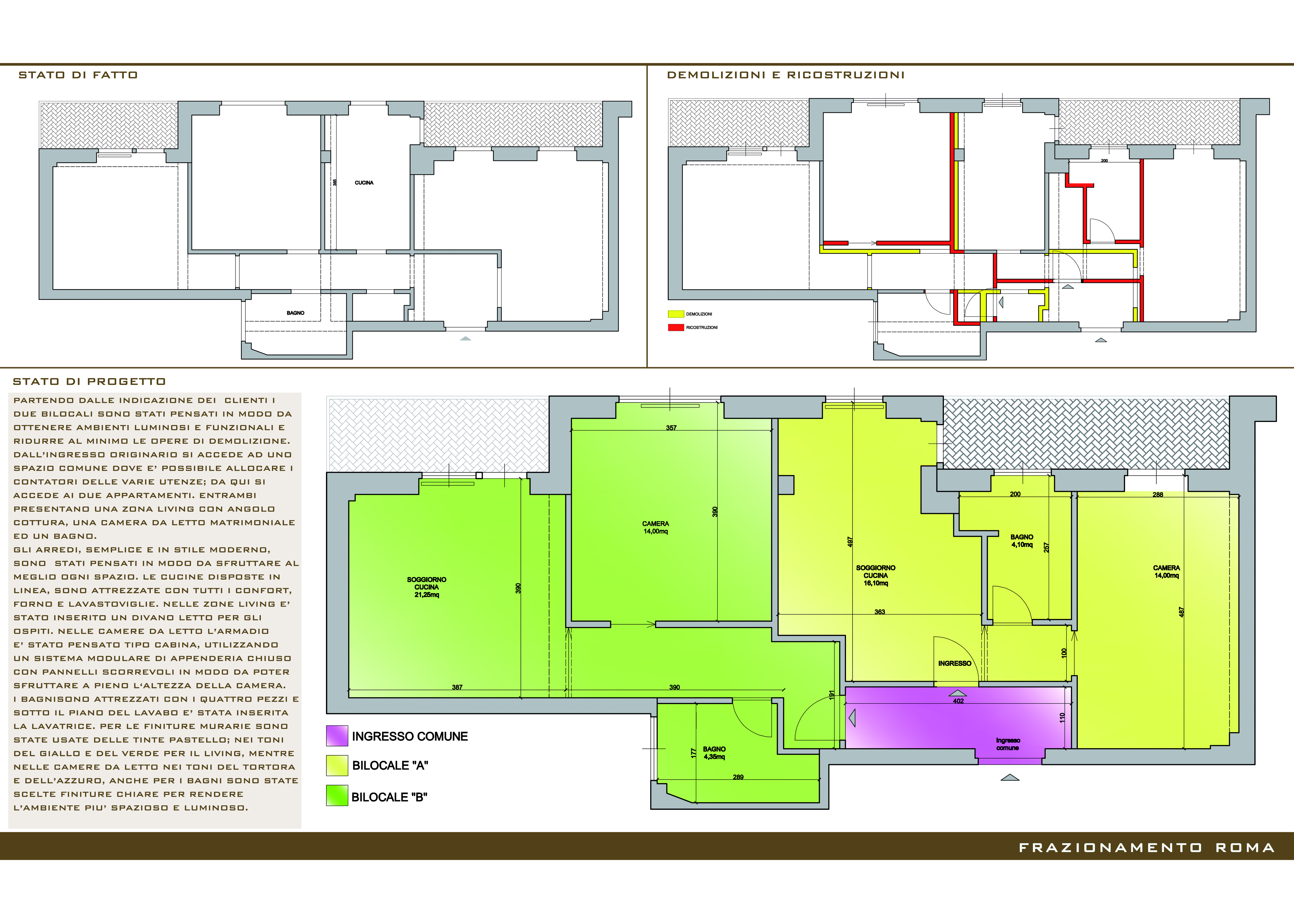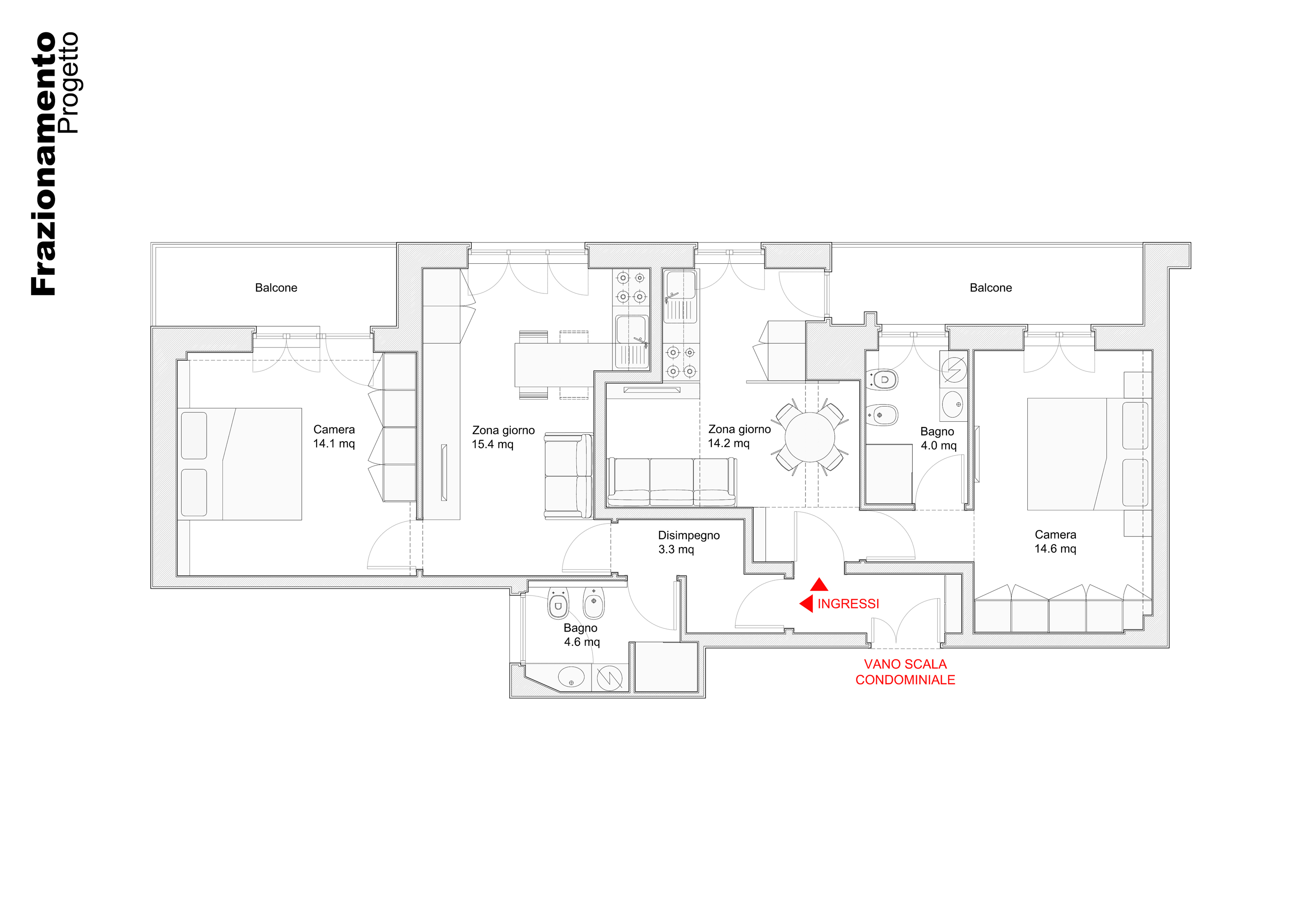 Questo appartamento deve essere frazionato in 2 bilocali ognuno dei quali sarà composto di soggiorno con angolo cottura, camera matrimoniale e bagno