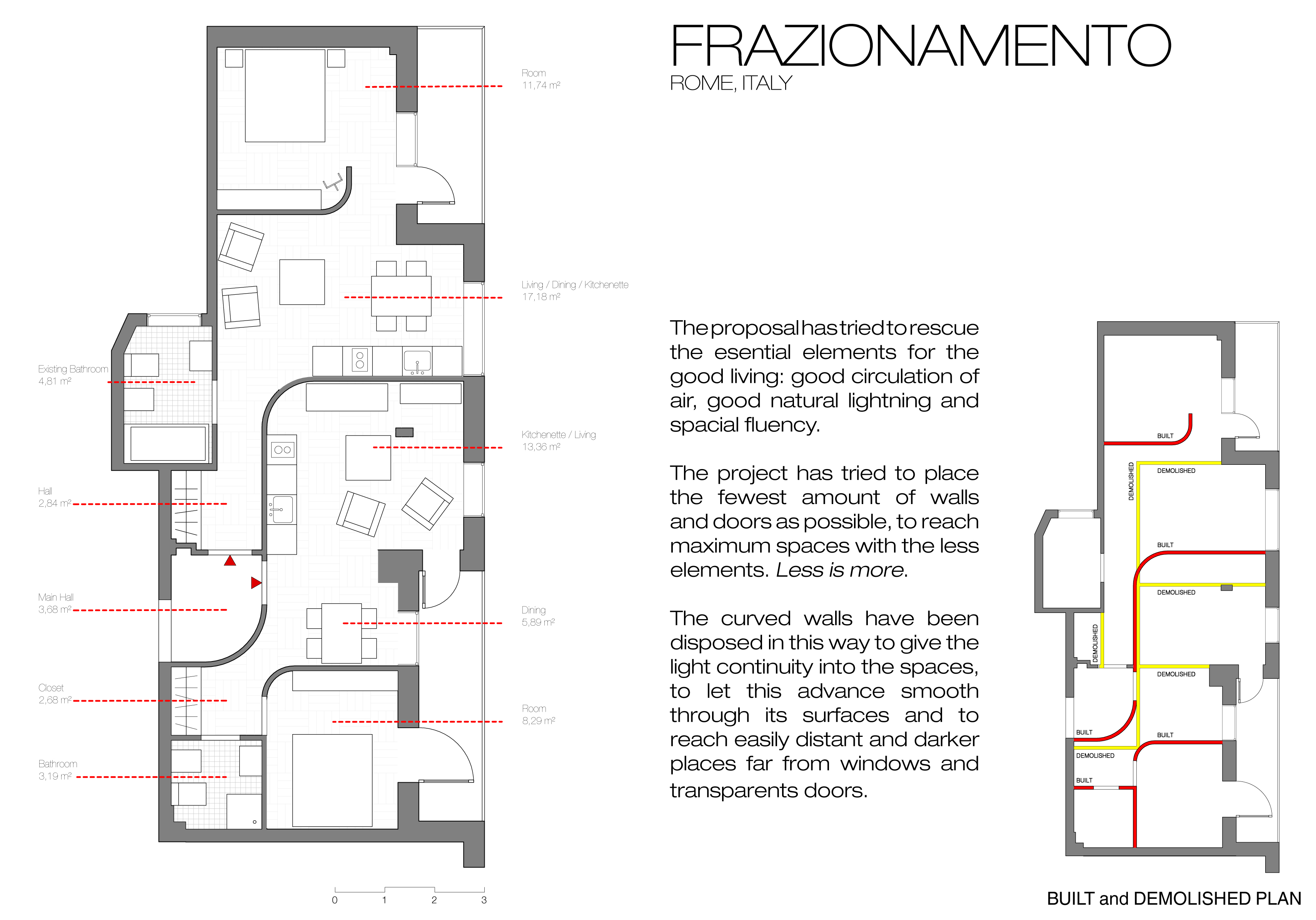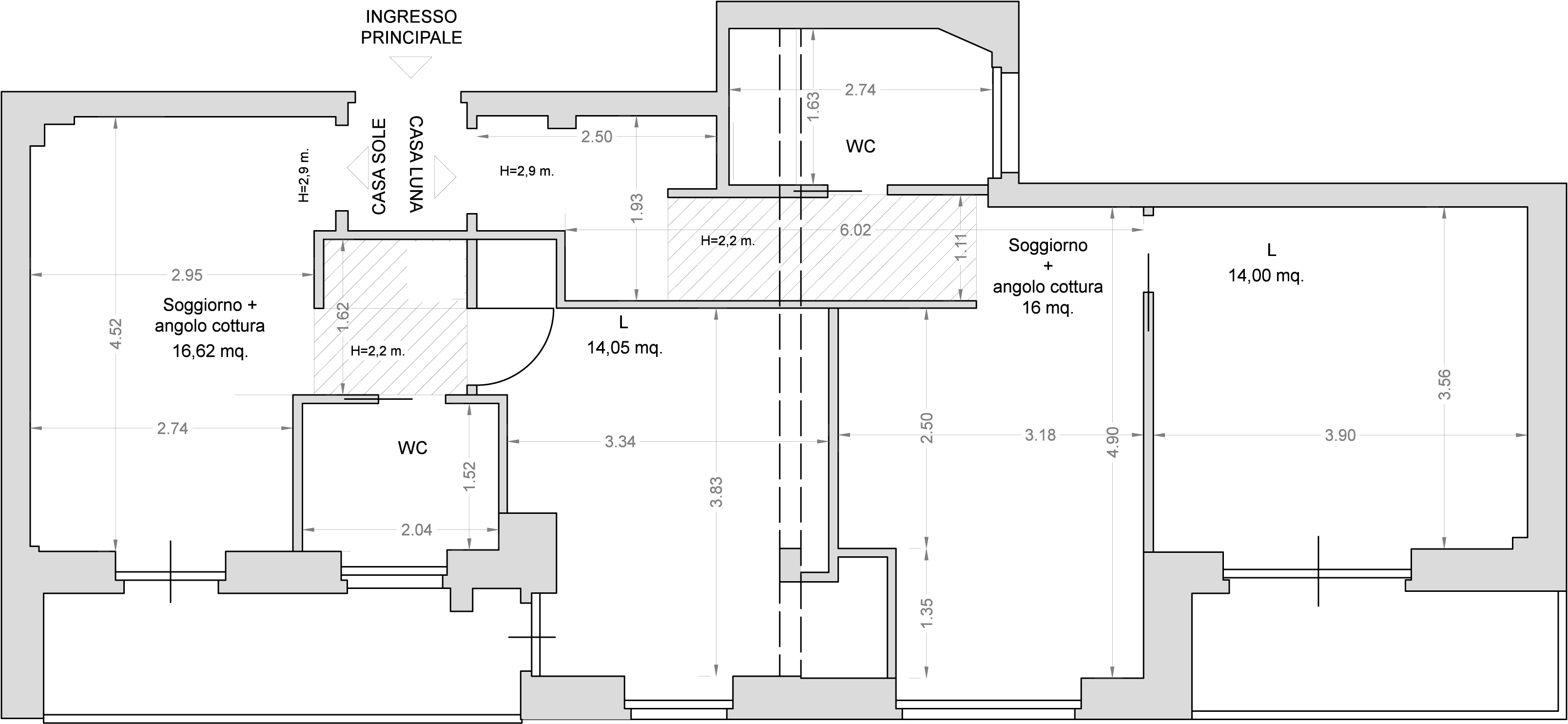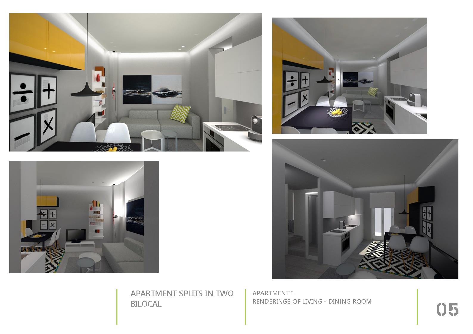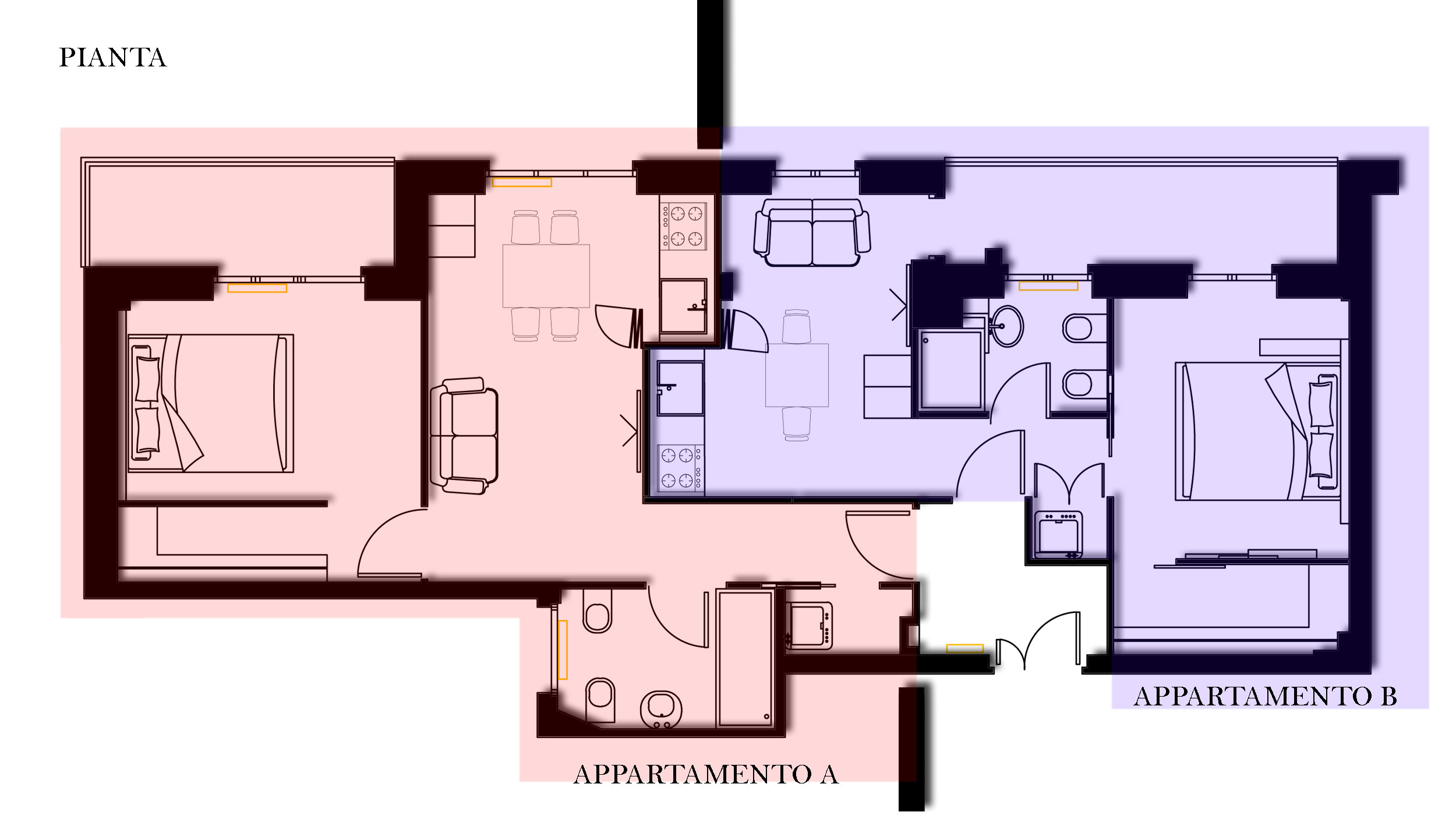 Questo appartamento deve essere frazionato in 2 bilocali ognuno dei quali sarà composto di soggiorno con angolo cottura, camera matrimoniale e bagno