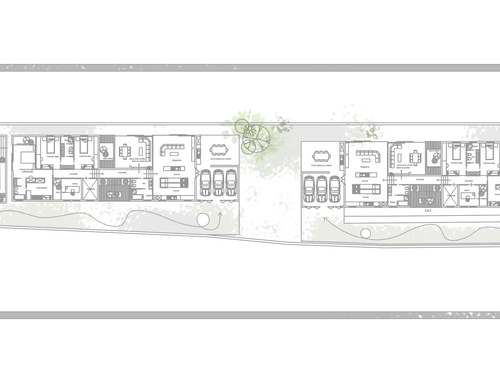 L’idea è di mantenere la viabilità d’accesso simile a quella del progetto approvato: una doppia curva per superare il dislivello e una strada che corre lungo il lato est del lotto, terminando a metà terreno con una rotonda che distribuisca l’accesso alle due proprietà.