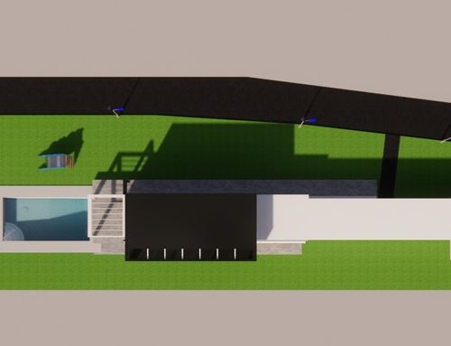 Soluzione con un’unica villa su tutto il terreno, prevedendo ~250 mq per il piano terra più la parte interrata. Modificherei l’accesso al terreno prevedendo uno scavo che permetta di realizzare 4 posti auto pubblici al piano strada, un portone per accesso carrabile alla proprietà che porterà tramite cunicolo interrato al garage della casa che formerà il piano interrato insieme ad un locale tecnico ed a una taverna ed un portoncino per accesso pedonale che tramite una scala porterà a livello del terreno e del piano terra della Villa. Porticato, piscina e parte esterna come da scenario 1.