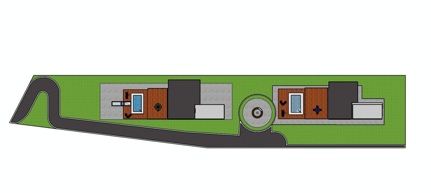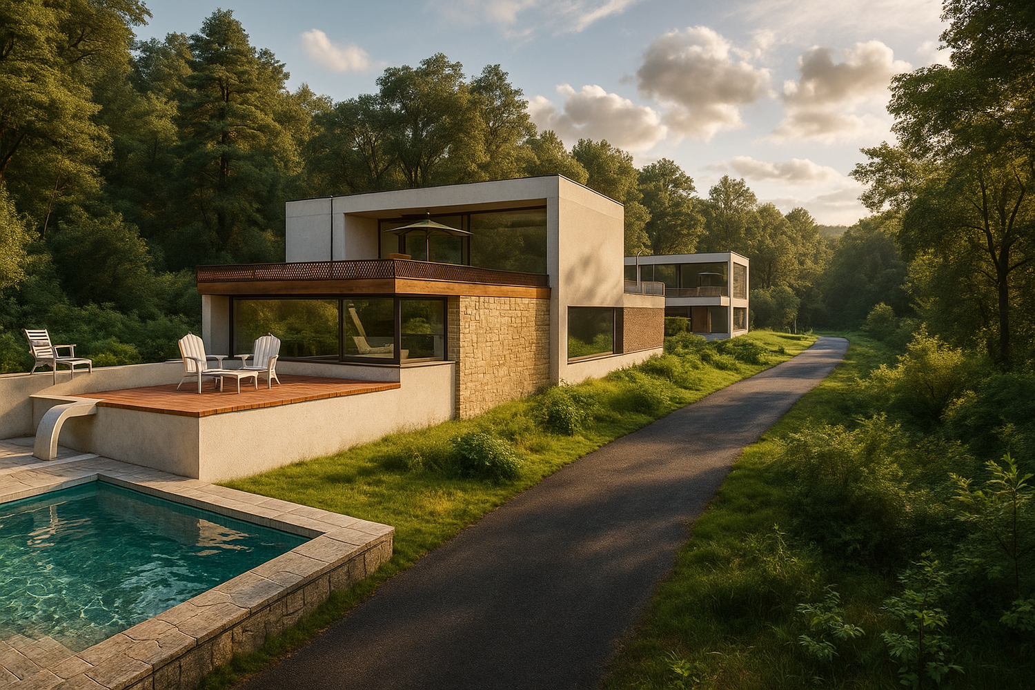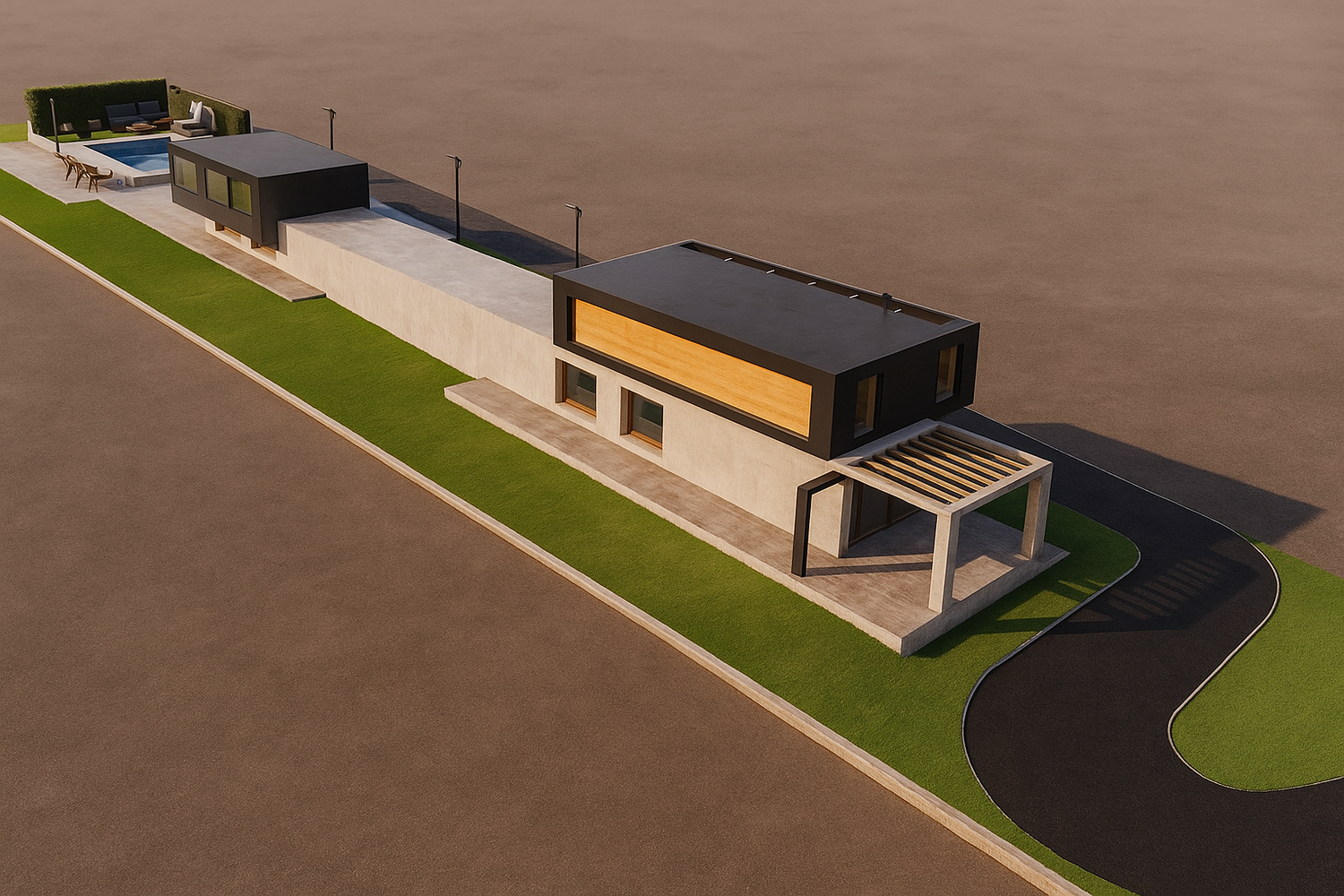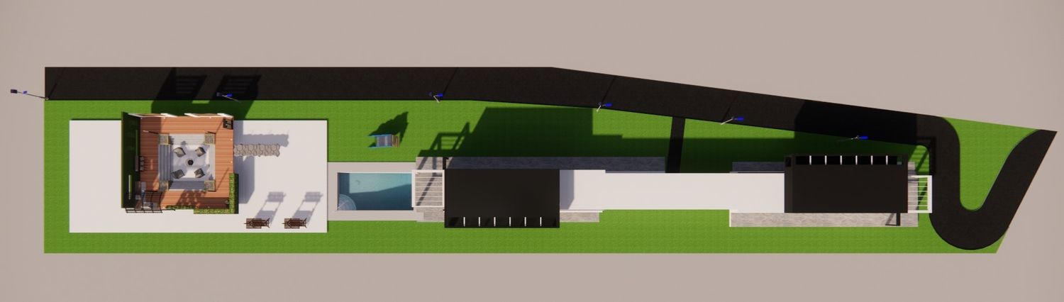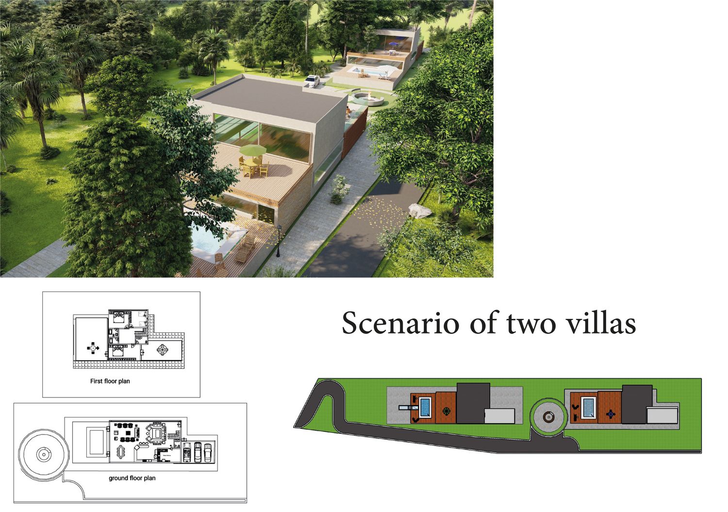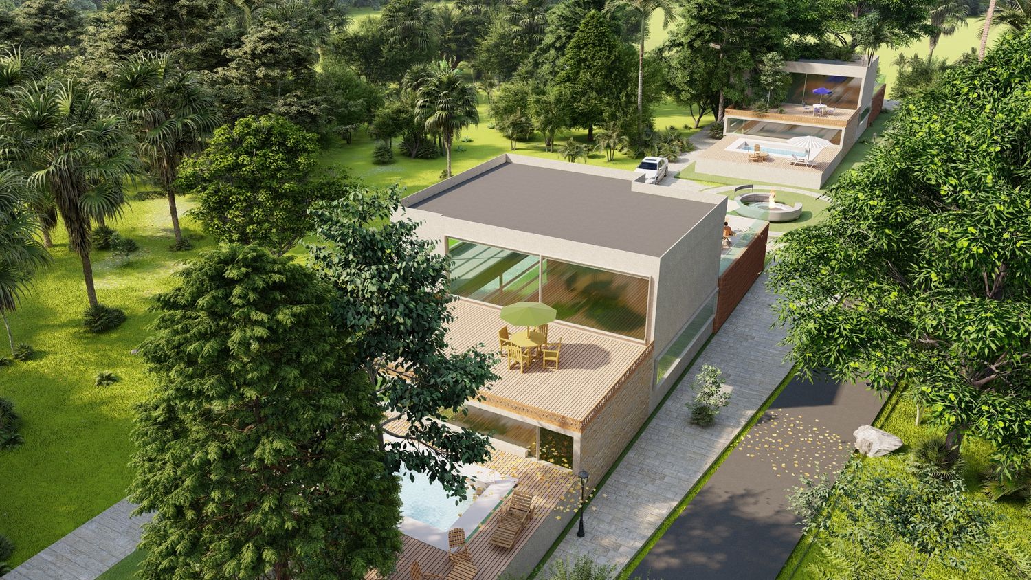 Two separate modern villas positioned within the same plot, each with its own private outdoor spaces, parking, and green areas. A shared central driveway organizes circulation, while the landscape design ensures privacy between units. A swimming pool and outdoor lounge act as focal points, enhancing the sense of luxury and community.