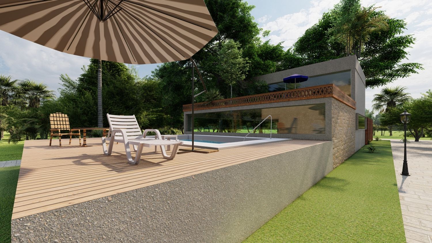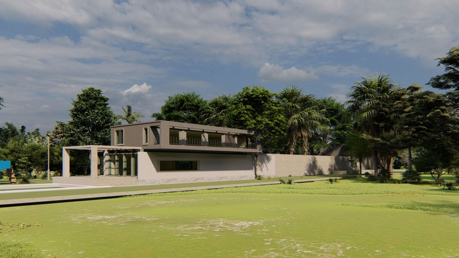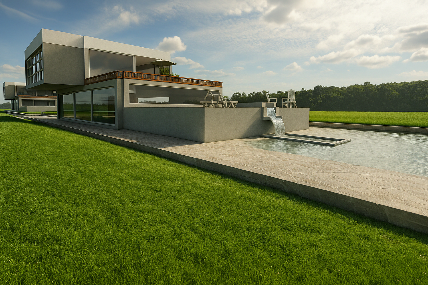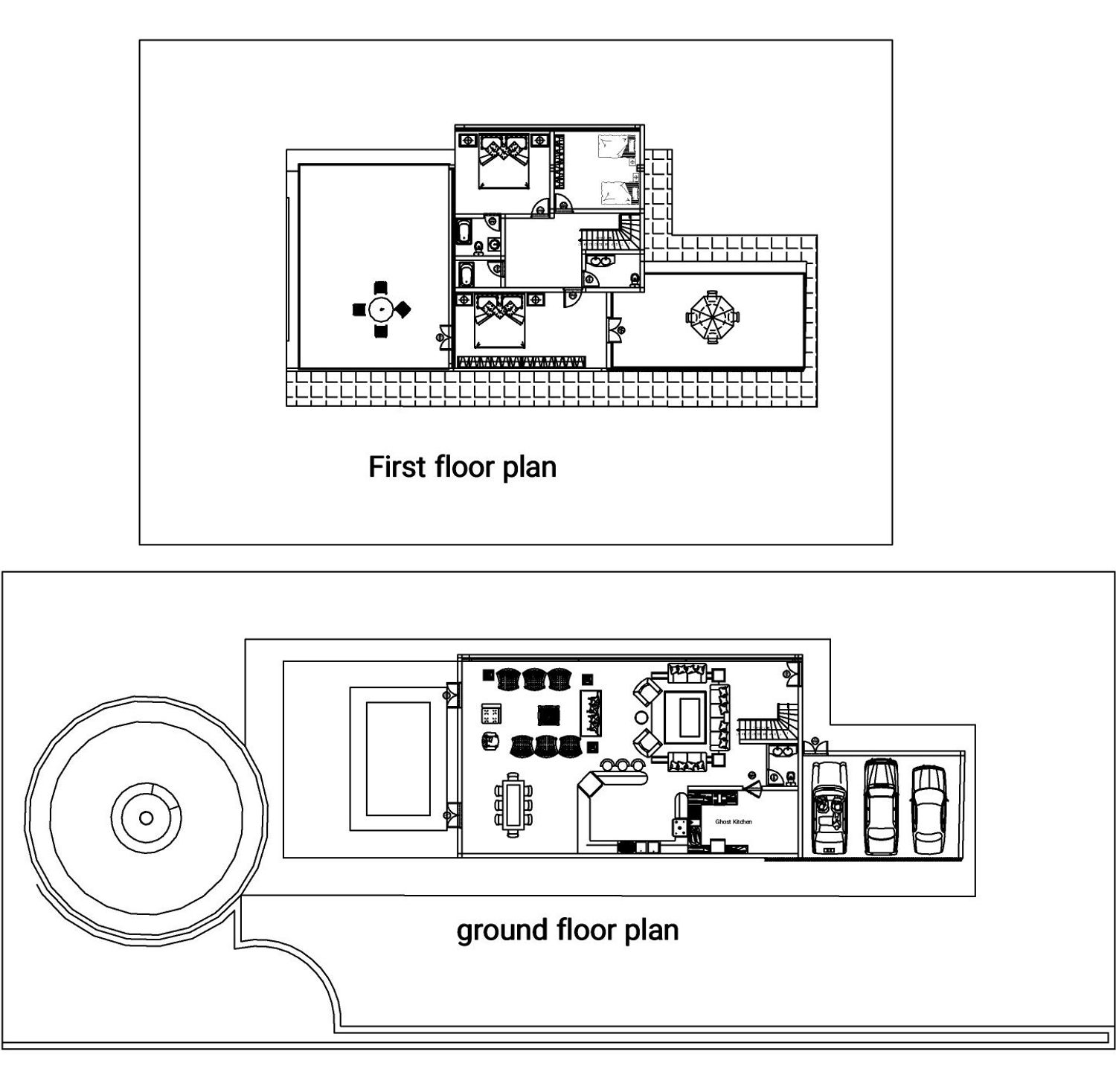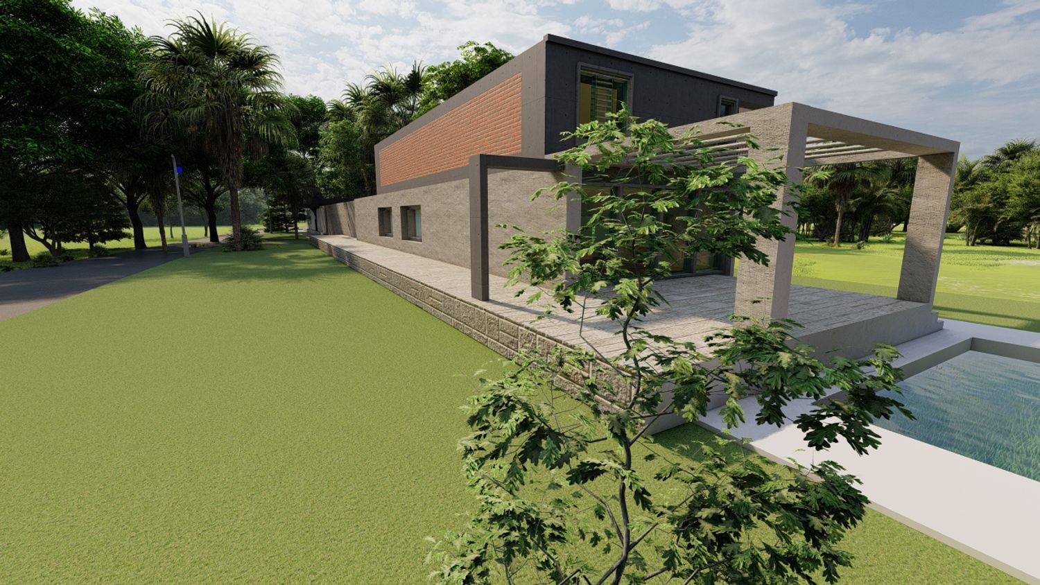 Two separate modern villas positioned within the same plot, each with its own private outdoor spaces, parking, and green areas. A shared central driveway organizes circulation, while the landscape design ensures privacy between units. A swimming pool and outdoor lounge act as focal points, enhancing the sense of luxury and community.