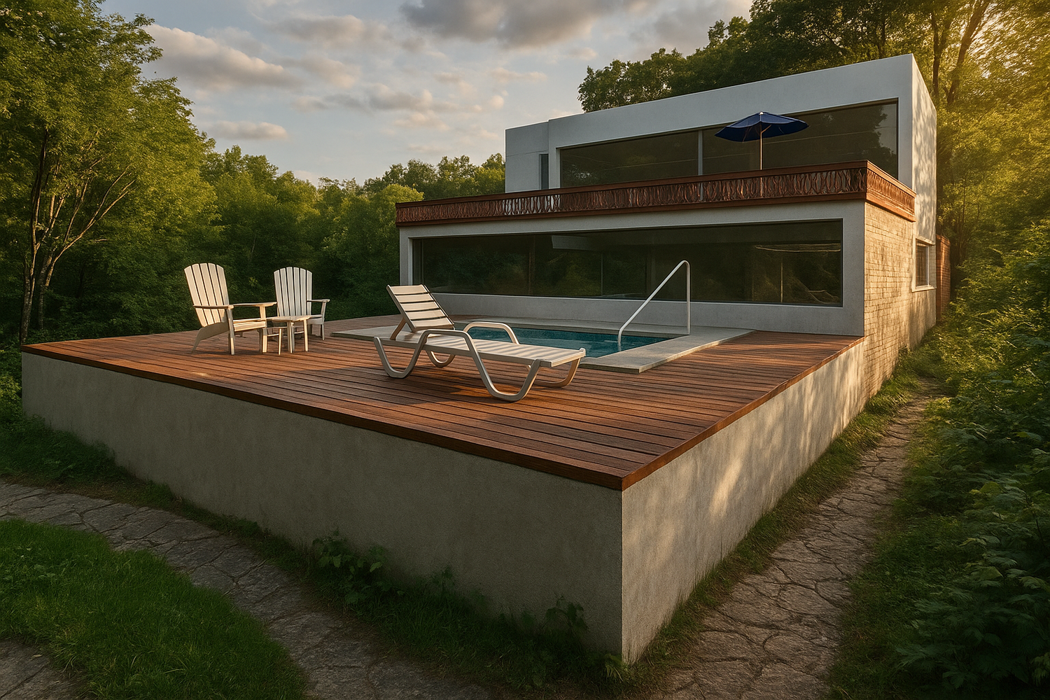 Both scenarios follow the same principles: minimal and contemporary architecture, strong indoor–outdoor connection, and a Mediterranean-inspired landscape with olive trees, cypresses, and stone pathways. The project highlights modern comfort while respecting the natural topography and enhancing outdoor living.