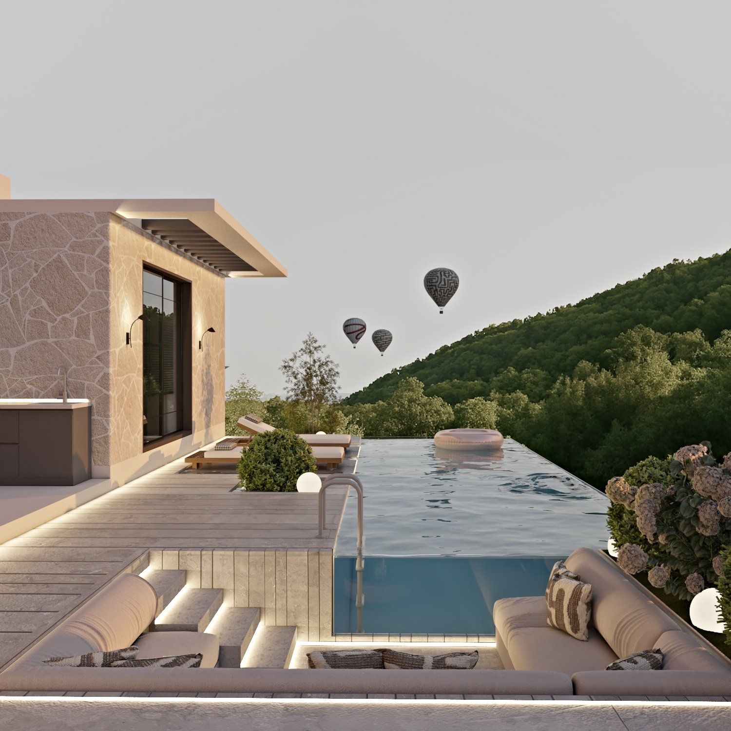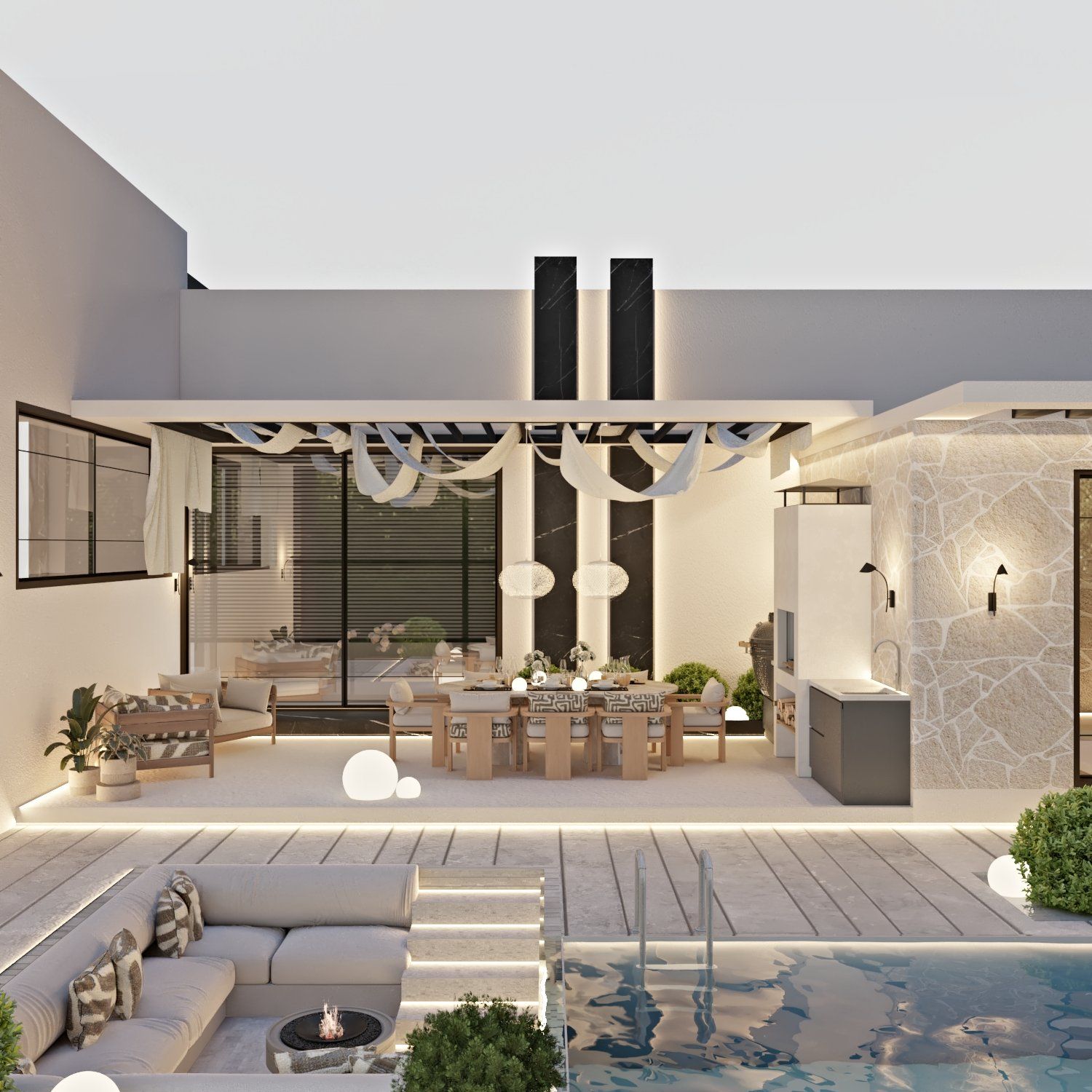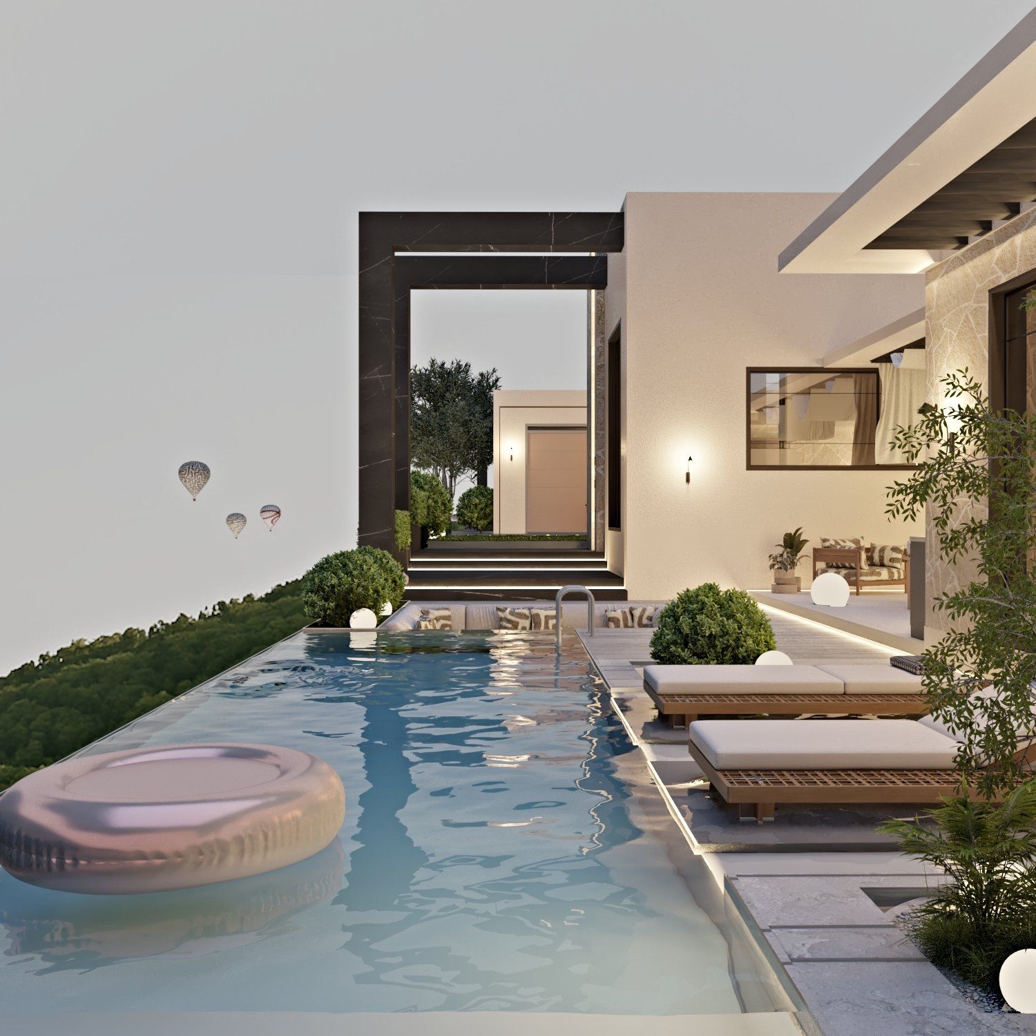 Situata nelle lussureggianti colline di Revigliasco vicino a Moncalieri, questa villa è stata progettata per celebrare sia l'eleganza moderna che la bellezza naturale del terreno inclinato. Il concetto abbraccia linee pulite, volumi aperti e una connessione senza soluzione di continuità tra vita interna ed esterna, creando una casa che si sente sia ispiratrice che profondamente radicata nel suo contesto. -Stile e Atmosfera Architettura contemporanea con tetti piani, ampie aperture in vetro e dettagli minimalisti. Abbiamo utilizzato pietra naturale, legno caldo e colori morbidi e leggeri per creare uno spazio che si percepisce come pacifico ed elegante. La luce soffusa mette in risalto le caratteristiche architettoniche e migliora l'atmosfera, specialmente al crepuscolo. - Topografia e Posizionamento della Piscina Il terreno inclinato è stato un elemento chiave: abbiamo posizionato la piscina a sfioro al bordo della vista in discesa, trasformando il naturale declivio in un'esperienza visiva drammatica. I bordi in vetro della piscina amplificano il panorama, dissolvendo i confini tra acqua e paesaggio.