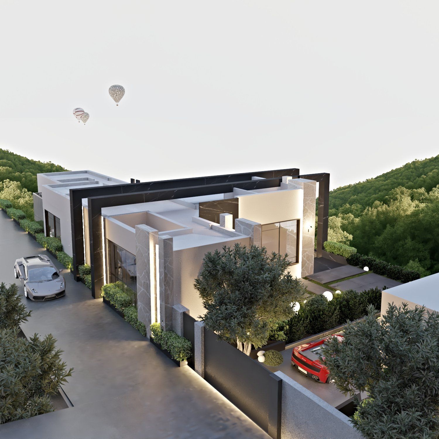Un salotto affondato adiacente alla piscina—con posti a sedere incorporati e un focolare centrale—sfrutta i livelli del terreno per creare uno spazio di incontro intimo e riparato.- Distribuzione Spaziale e FluiditàLe ville sono state disposte con attenzione per ottimizzare la luce solare, la privacy e il movimento attraverso il sito.La continuità interno-esterno è stata prioritizzata, con terrazze coperte, cucine all'aperto e aree pranzo che estendono lo spazio abitativo.La circolazione fluisce naturalmente dall'ingresso fino al cuore della casa, con transizioni ponderate e senza angoli sprecati.I materiali sono stati selezionati per riflettere modernità e calore, mantenendo durabilità e armonia con il paesaggio.- Scenari di DesignIl progetto esplora due opzioni intriganti:Due ville unifamiliari (Villa A e Villa B), ciascuna di circa 183 m², che condividono l'area edificabile mantenendo indipendenza e privacy.Una villa più grande con un livello interrato, massimizzando il potenziale del lotto e permettendo accessi sotterranei e servizi ampliati.