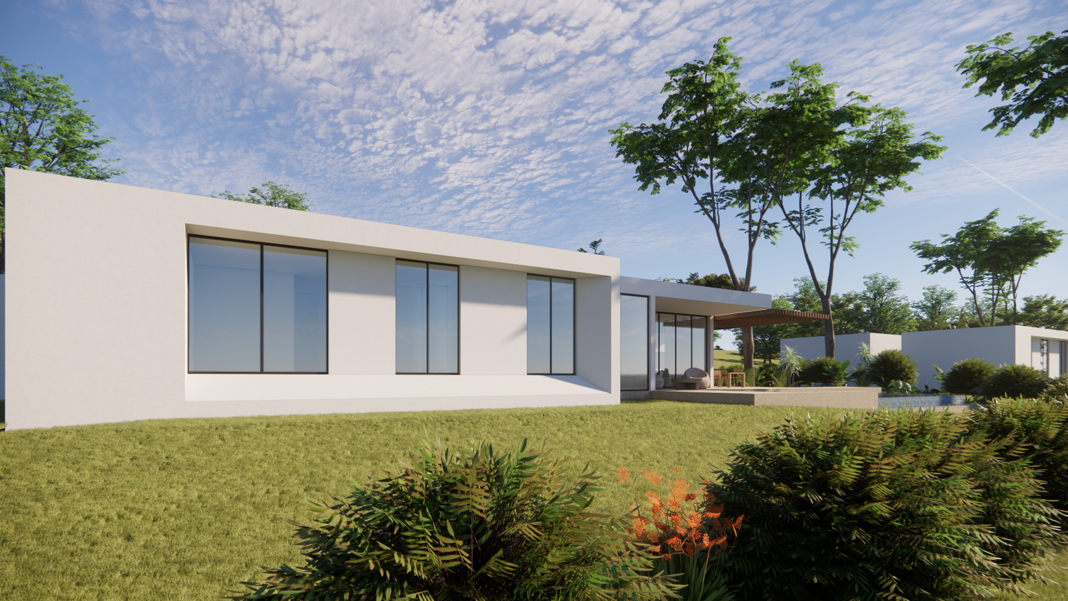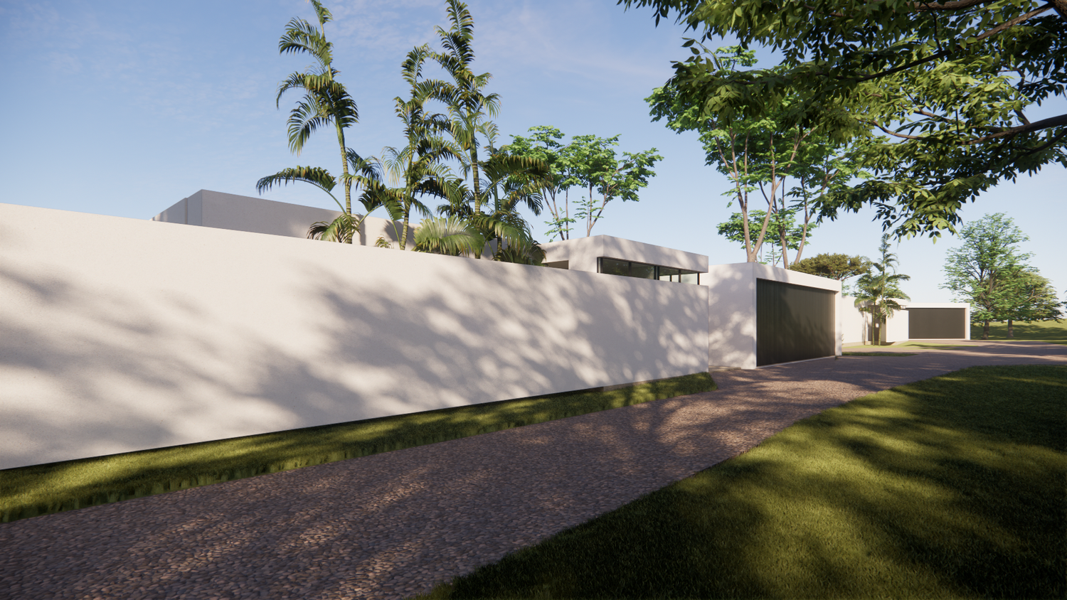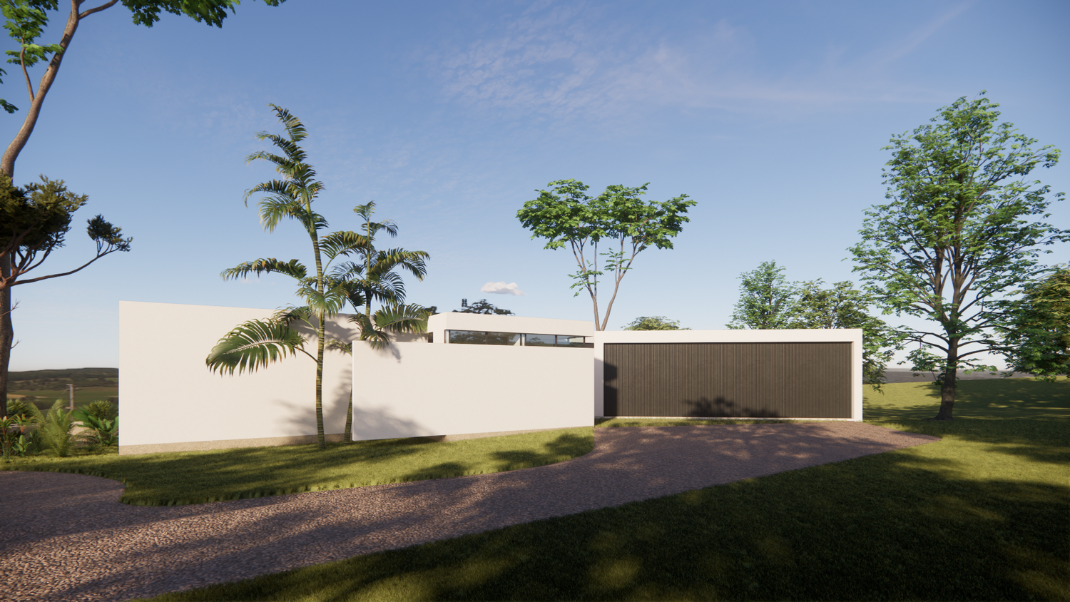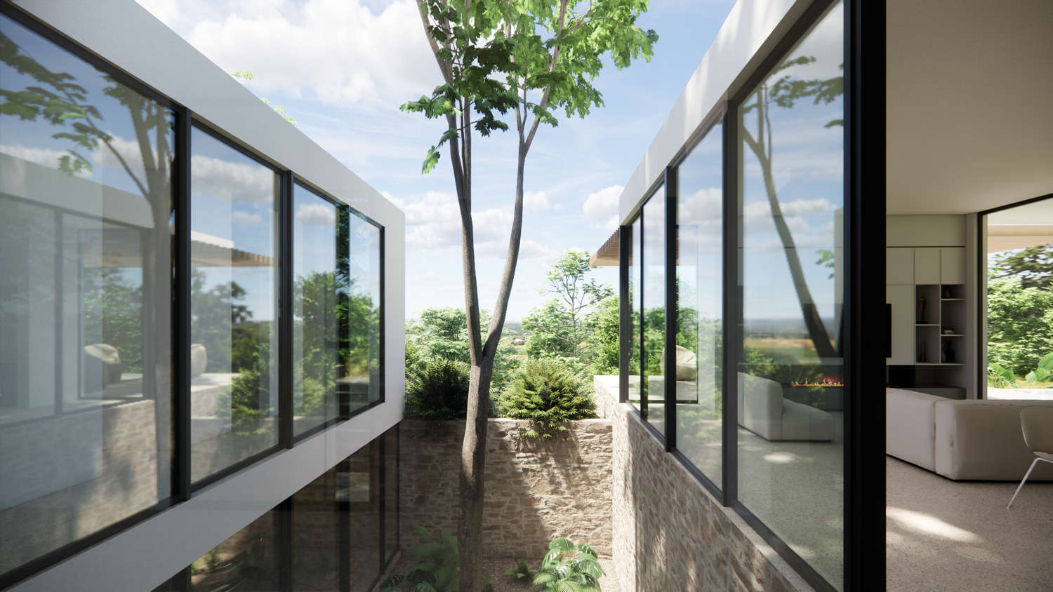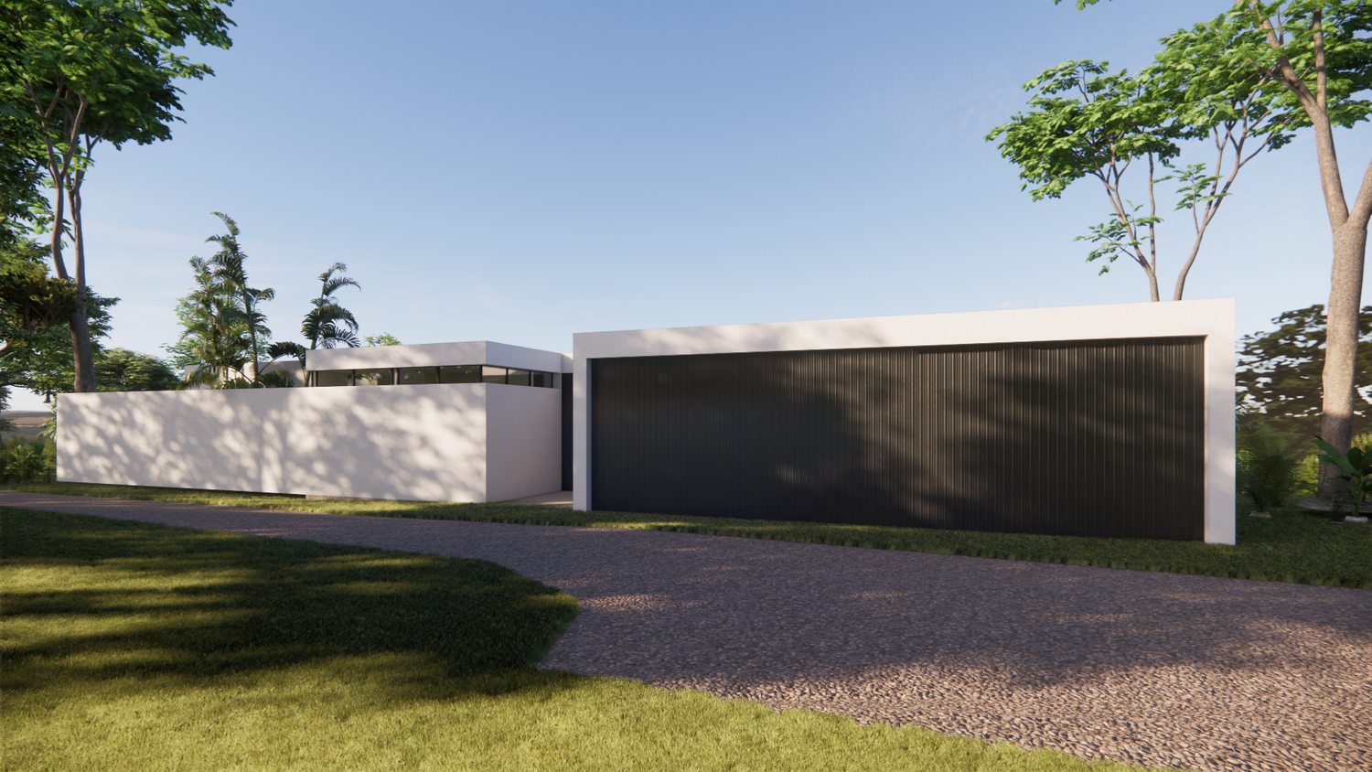 Tra i due blocchi c'è un cortile che, oltre a illuminare e ventilare il blocco nord con finestre esposte a sud, funge da doppio punto di riferimento visivo, sia dall'ingresso del garage che dall'ingresso principale della casa.