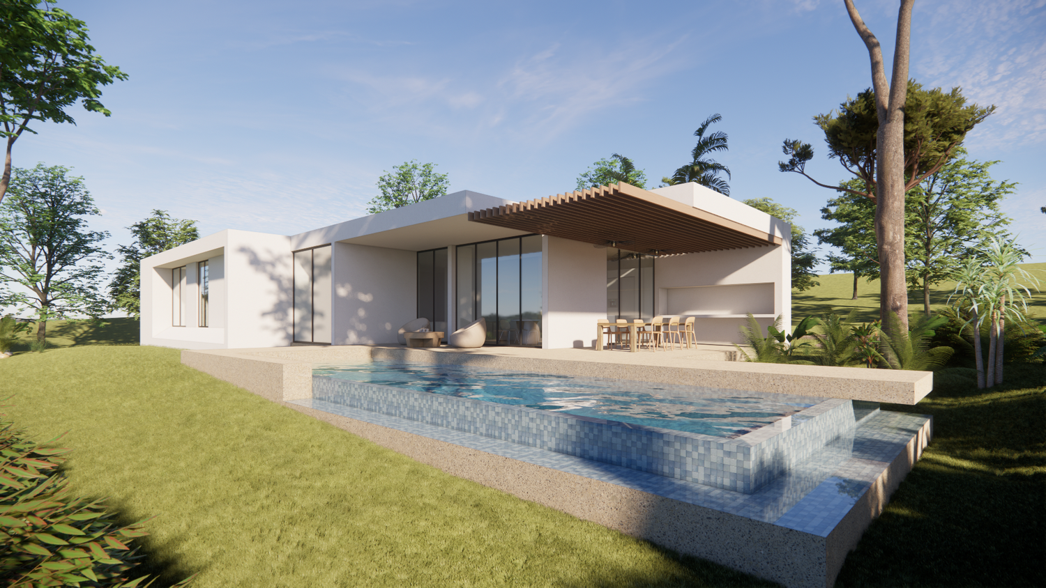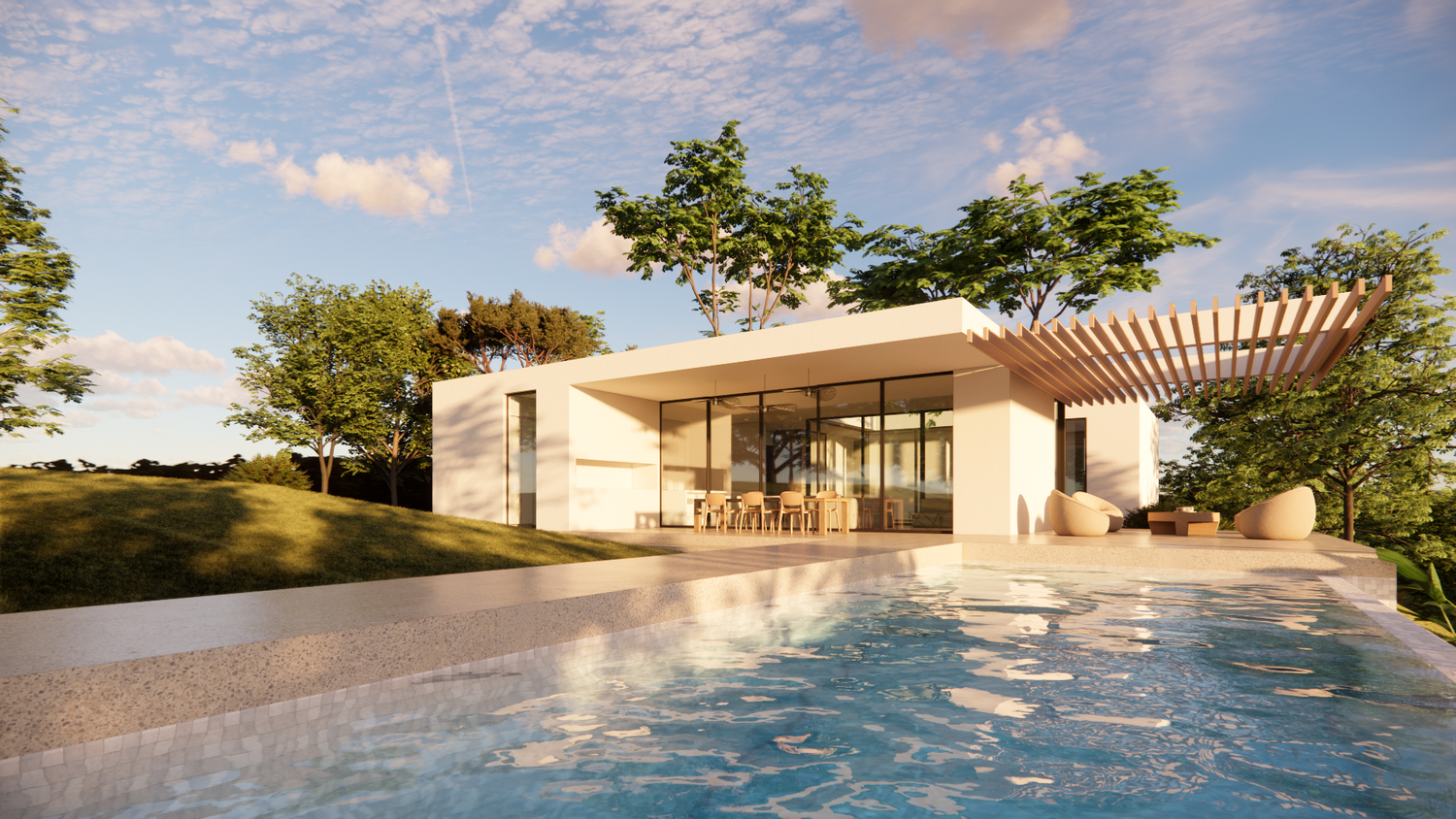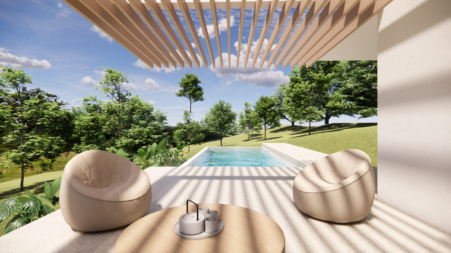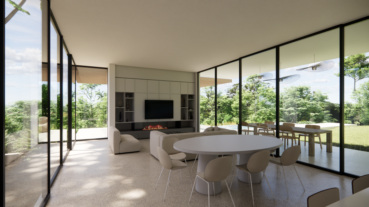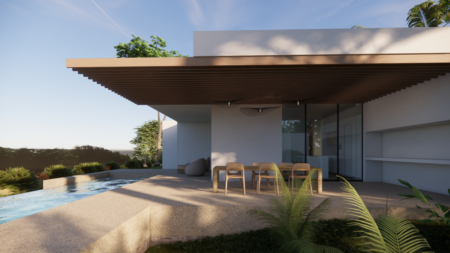 Tra i due blocchi c'è un cortile che, oltre a illuminare e ventilare il blocco nord con finestre esposte a sud, funge da doppio punto di riferimento visivo, sia dall'ingresso del garage che dall'ingresso principale della casa.