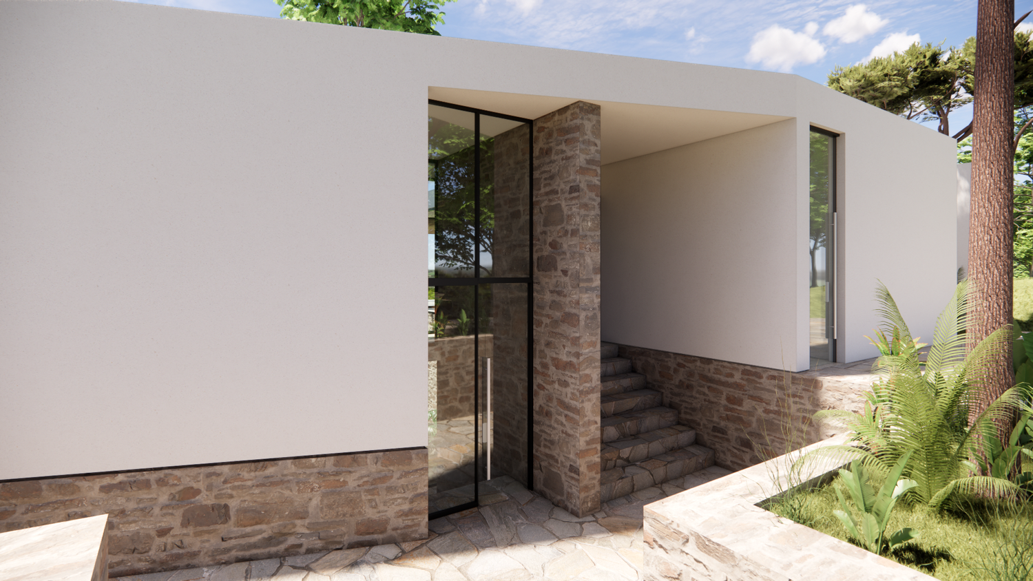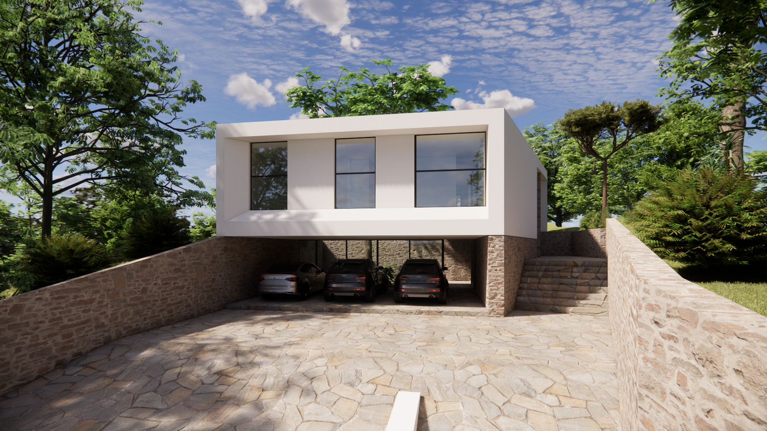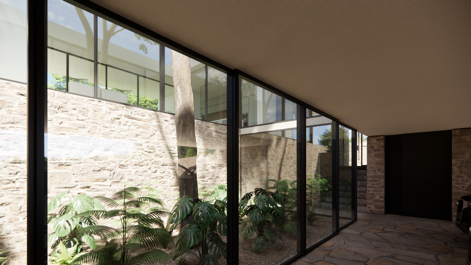 La sottrazione di terreno necessaria per realizzare il garage include un cortile interno e ha una forma geometrica semplice. Si è deciso di aggiungere sulla destra l'ingresso pedonale per sfruttare la topografia naturale del terreno, generando una rottura nell'ortogonalità