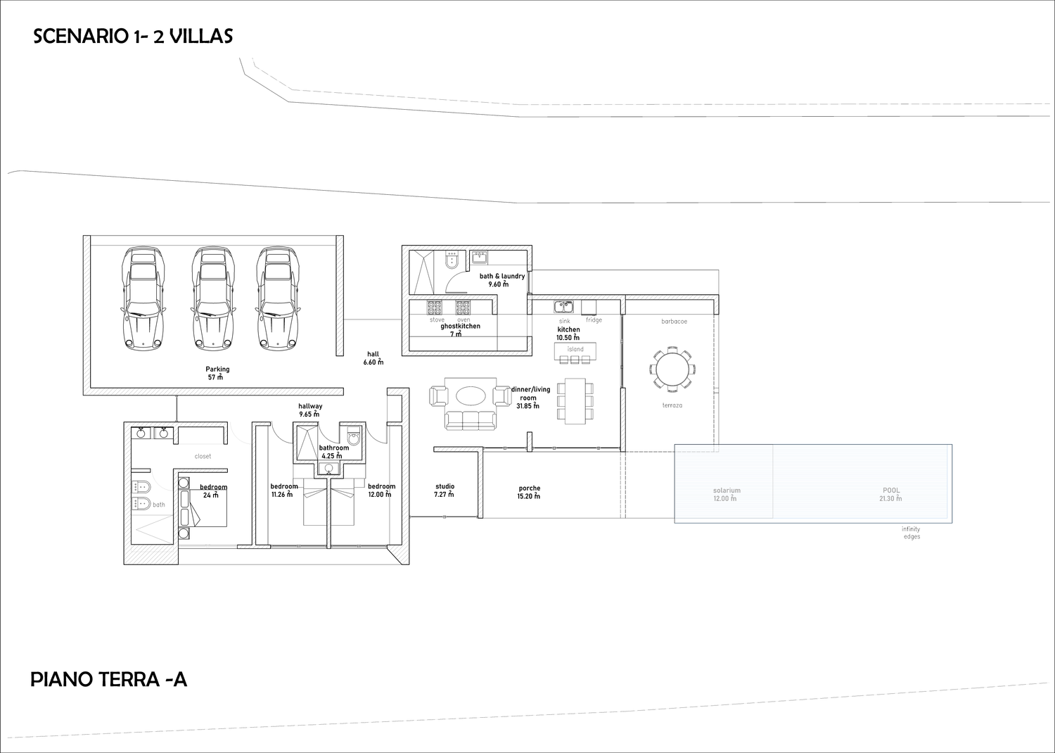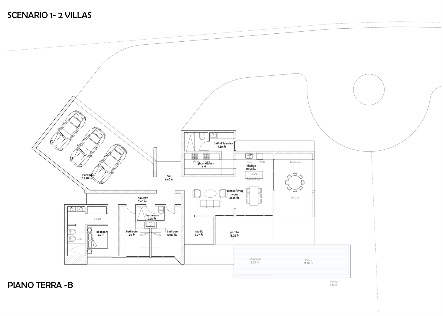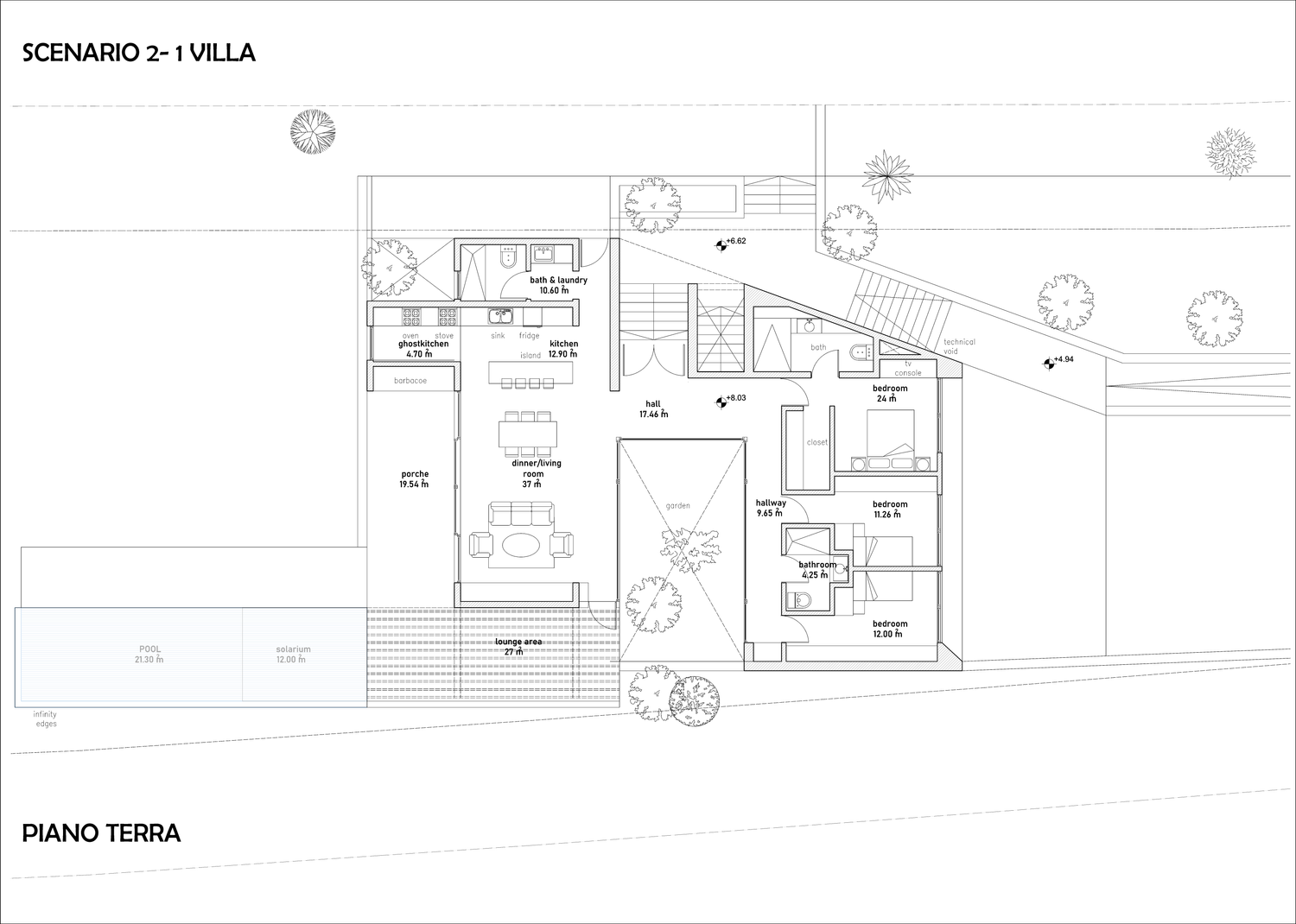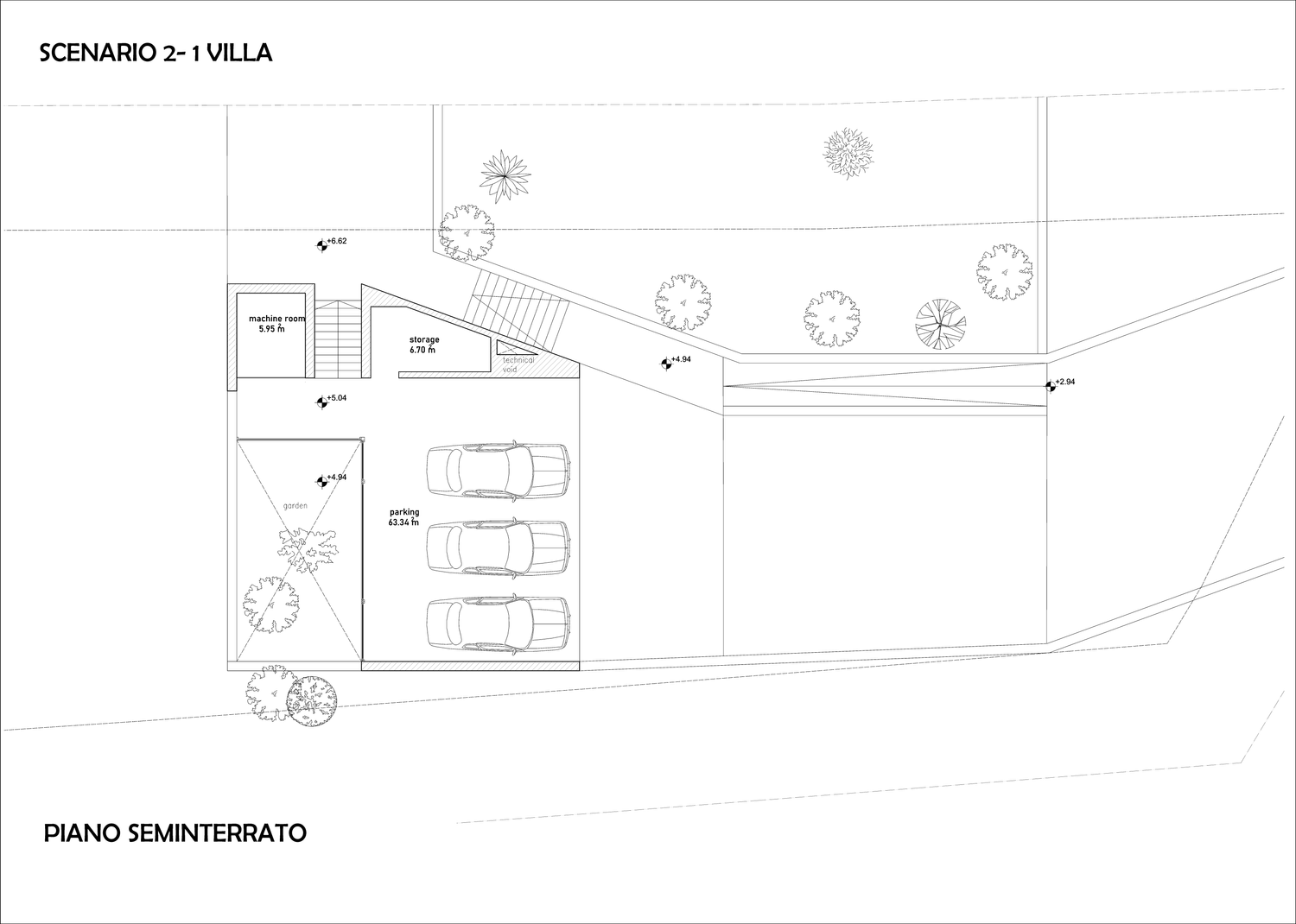 Progettando una tipologia in cui il piano del garage è seminterrato, si è deciso di ritirare poco più di 25 m di fronte, per questioni di pendenza e per raggiungere l'altezza necessaria affinché il piano sociale fosse allo stesso livello del piano naturale.