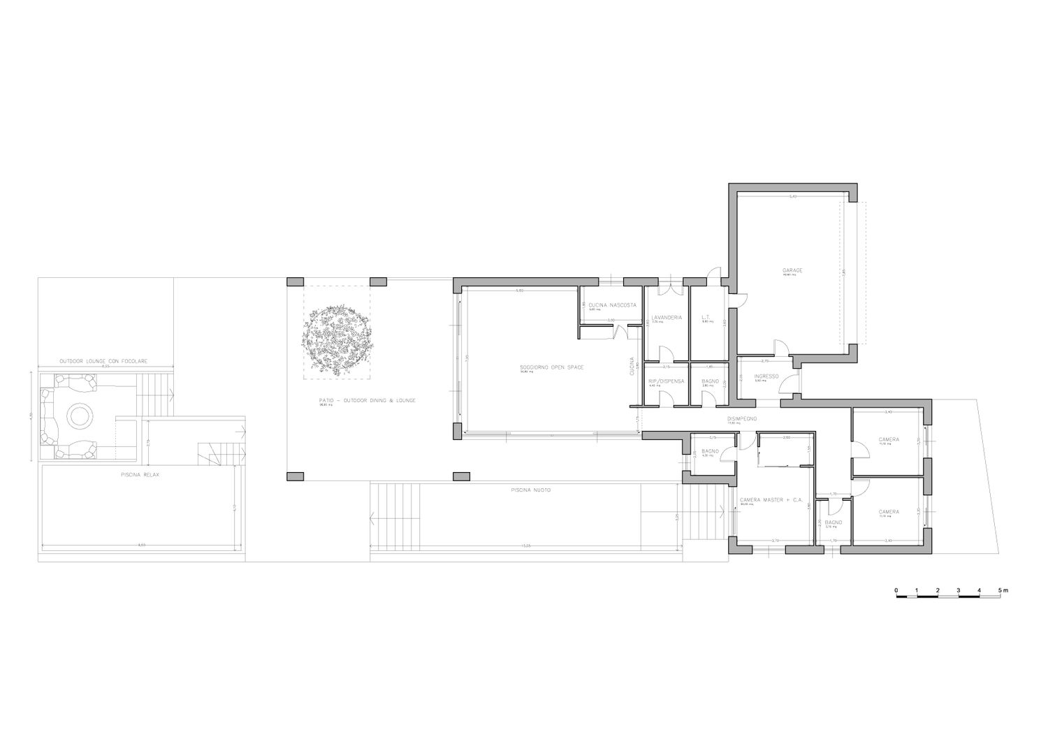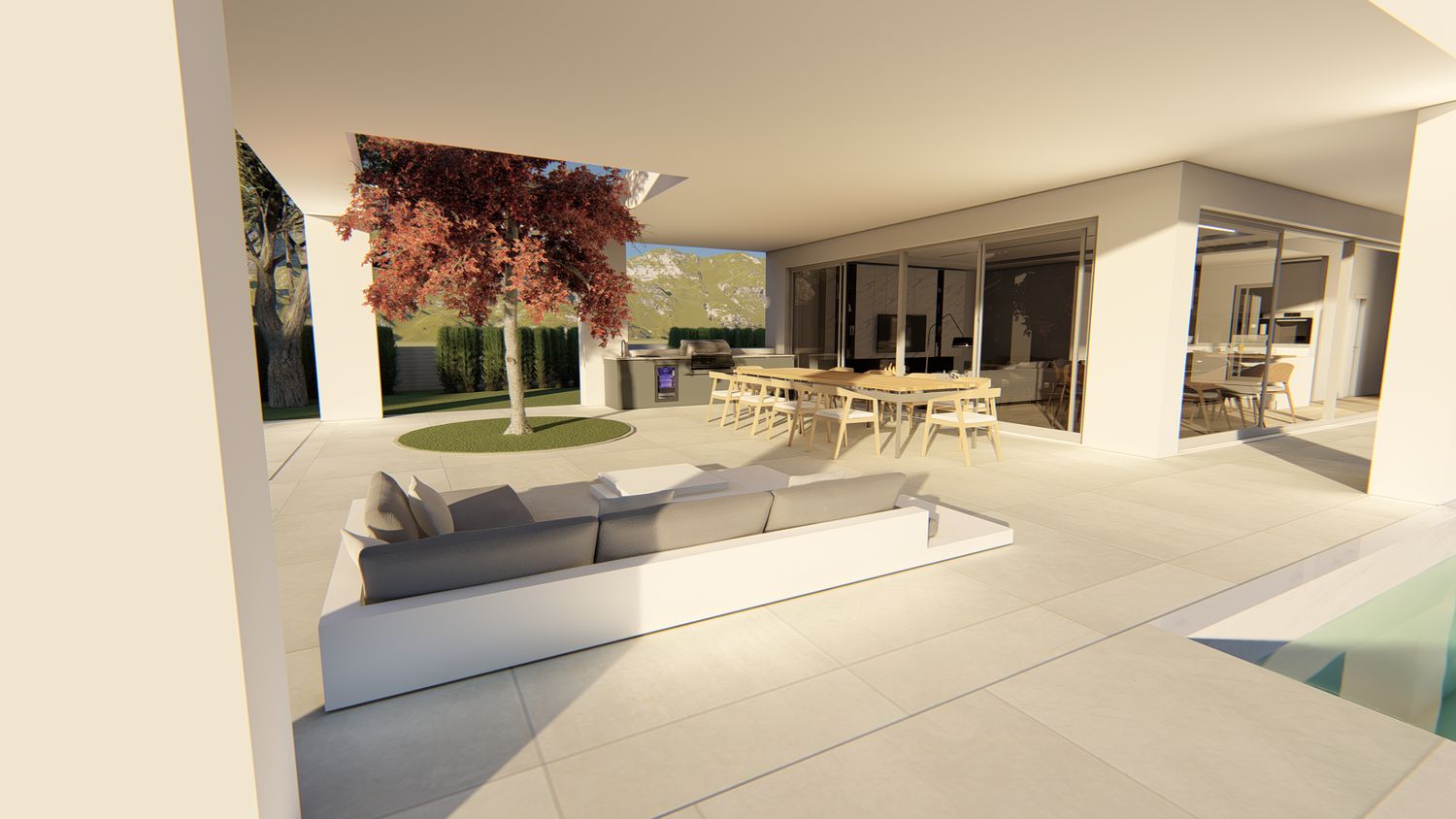 ⦁ ampio patio esterno, posizionato in prossimità della zona giorno e suo ideale prolungamento verso il giardino, dotato di: cucina outdoor con BBQ ed eventuale fornetto pizze, tavolo da pranzo, zona lounge con divani;