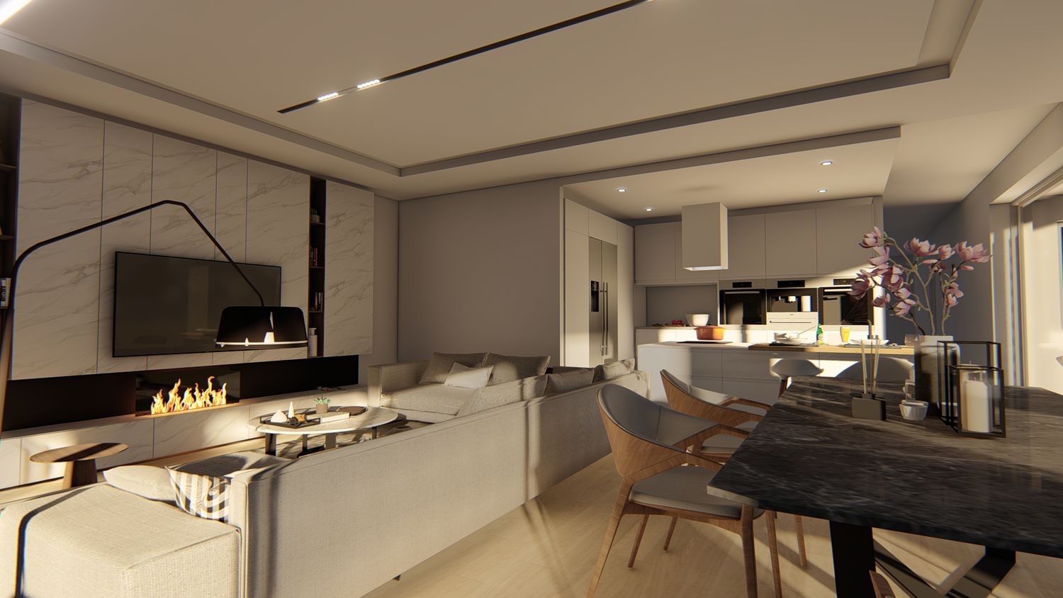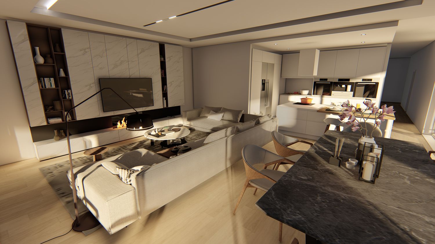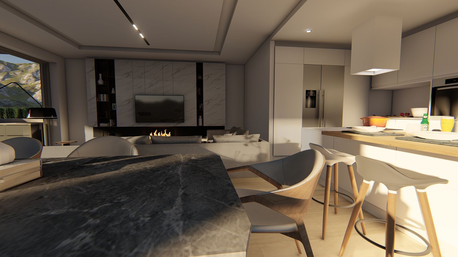 ⦁ soggiorno open space, con cucina ad isola che maschera, nell'arredo, l'accesso ad una seconda cucina "nascosta" e dedicata alle cotture più invasive;