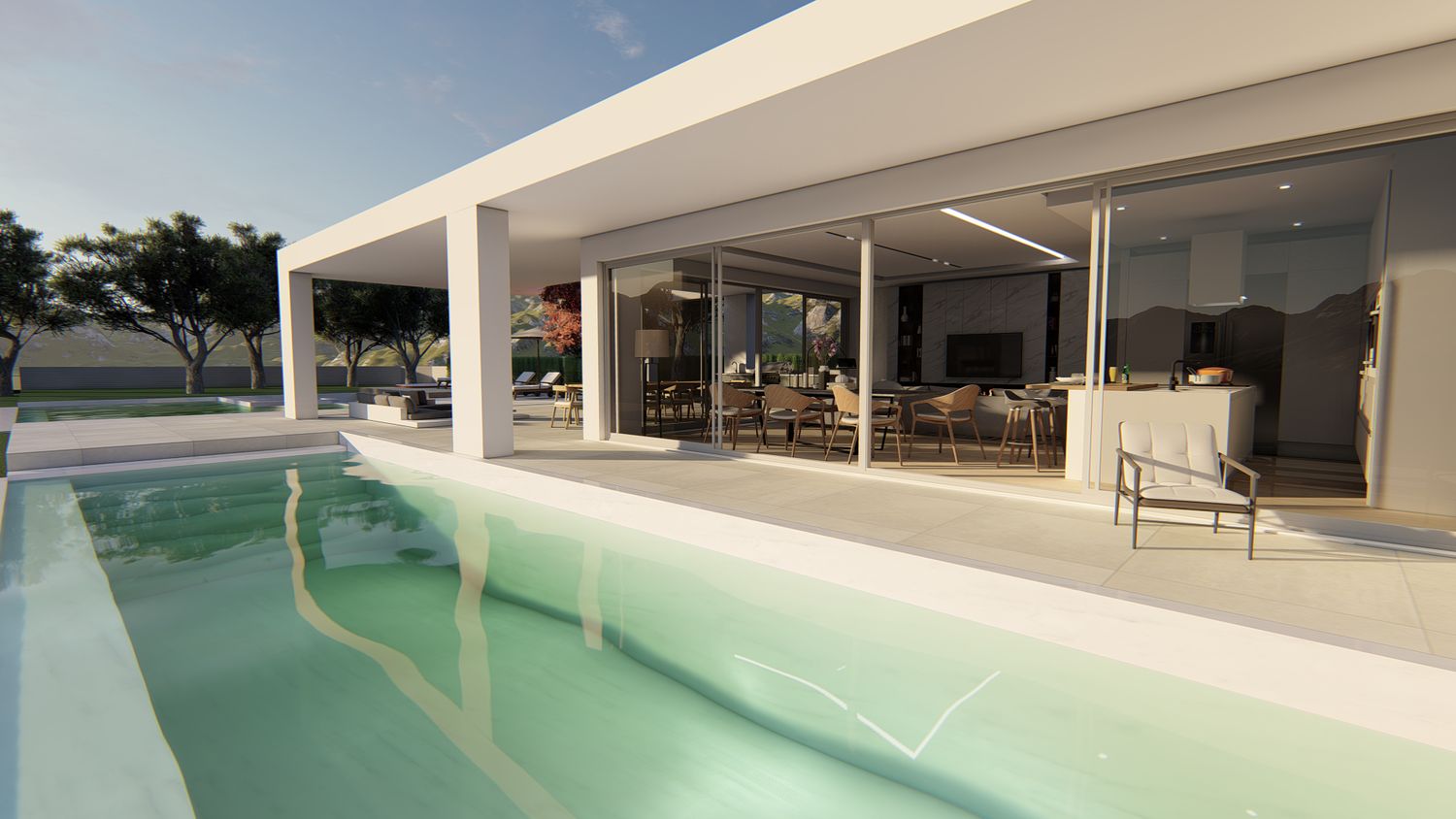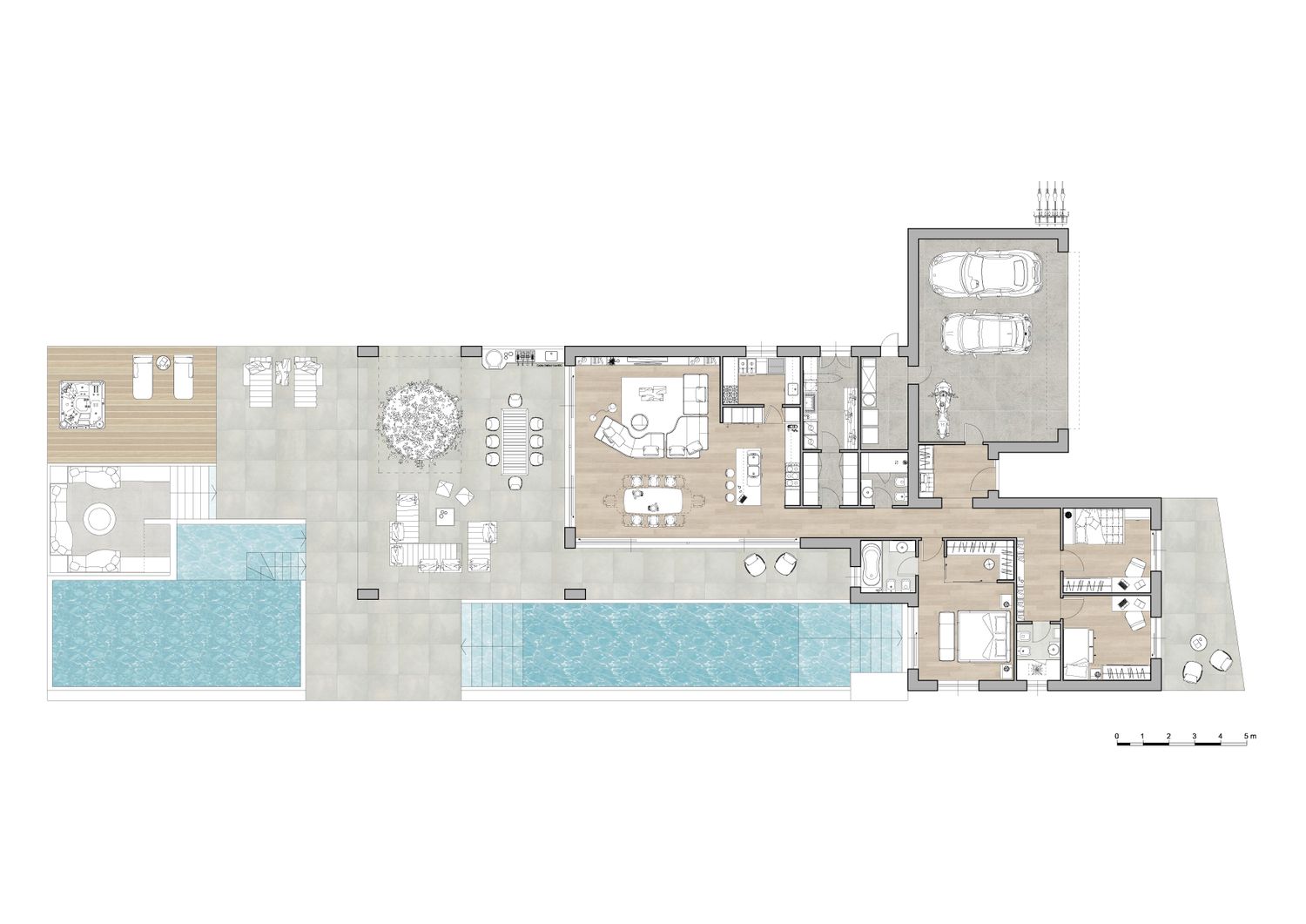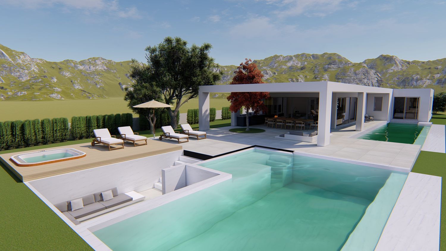 ⦁ piscina luxury a doppia vasca, con area nuoto parallela all'edificio (a cui si può accedere anche direttamente dalla master suite) e area relax più esterna, dotata di zona solarium con lettini e spazio sunken lounge con divani e focolare.