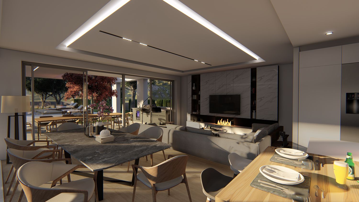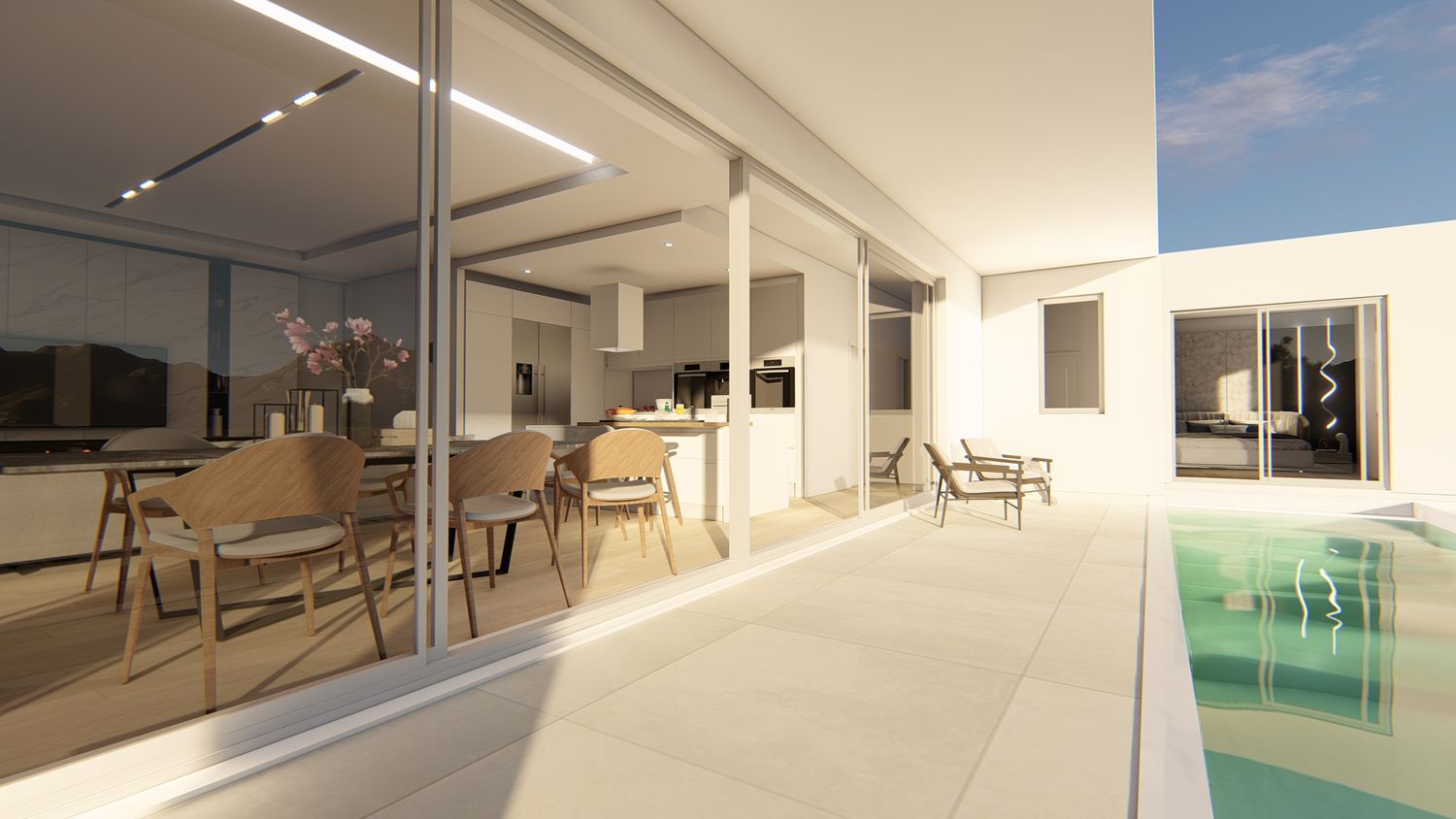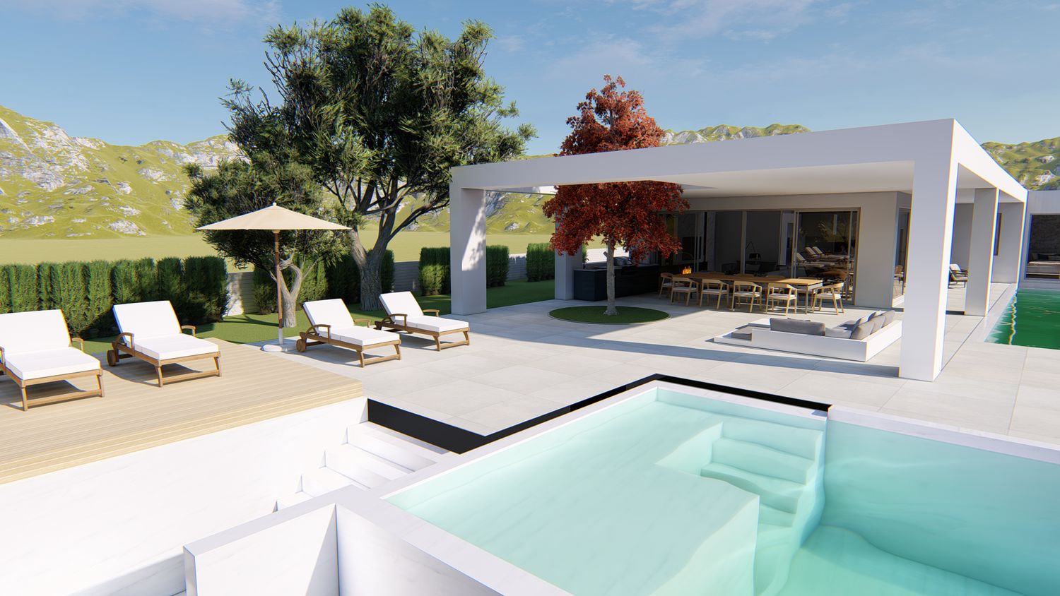 ⦁ piscina luxury a doppia vasca, con area nuoto parallela all'edificio (a cui si può accedere anche direttamente dalla master suite) e area relax più esterna, dotata di zona solarium con lettini e spazio sunken lounge con divani e focolare.