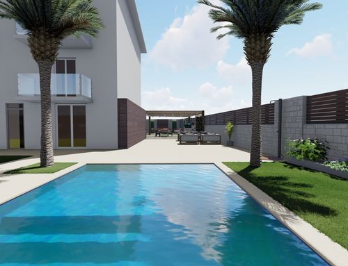 Hi everyone, I have a small garden around the house where I would like to have a swimming pool in front or behind the building (my idea is to do it where there is the earth), I would like to have it furnished with sun loungers. If the swimming pool is designed in the front, in the back I would like to have a bbq area and flora for the garden. I would like to create led lighting around the garden and of course the pool to make the exterior more elegant. Around the car roofing gazebo I would like to create a sort of boxing that can "close it". I would like to replace the mesh of the fence with one that can provide more privacy. At the flora level I am open to new proposals (Mediterranean), current plants can be moved.
