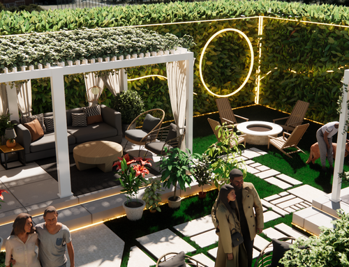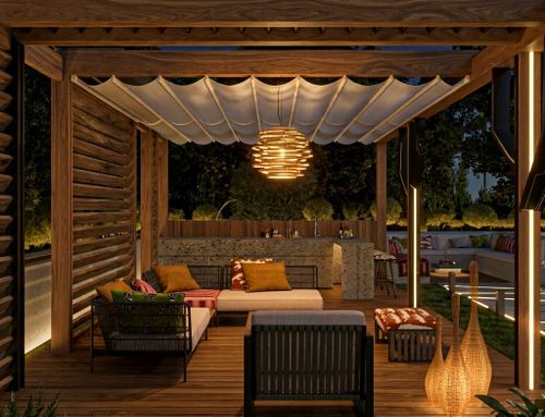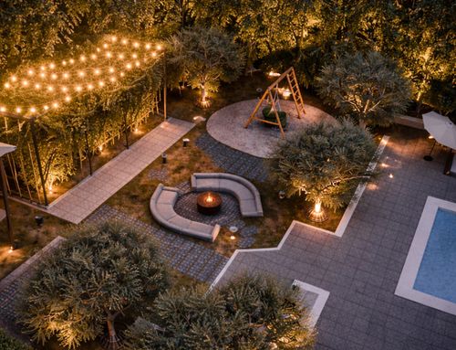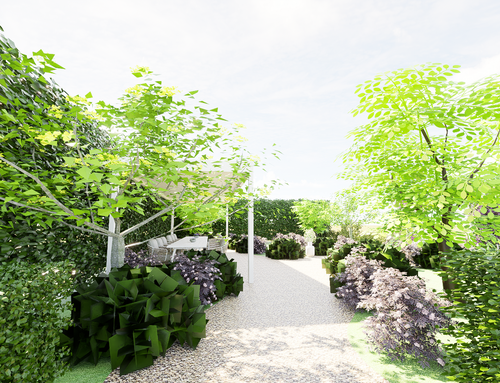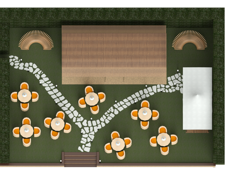 We need to complete this outdoor area, which currently consists of a green lawn, trees, and a 30 sqm gazebo.
