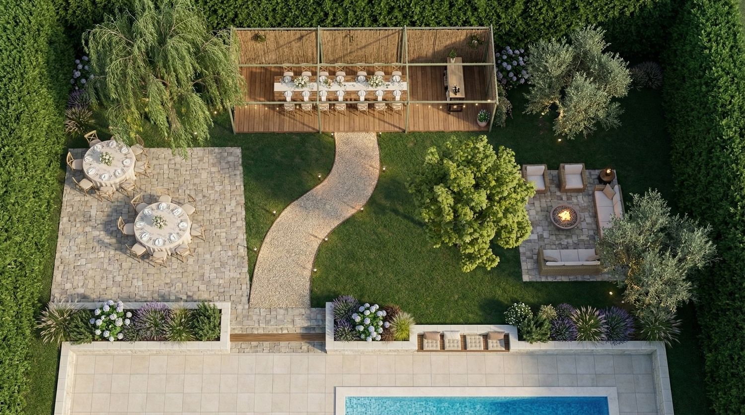 This landscaping project features a structured yet fluid backyard design that prioritizes distinct zones for dining, lounging, and movement. The layout balances hardscaping with lush greenery to create a multi-functional outdoor living space.