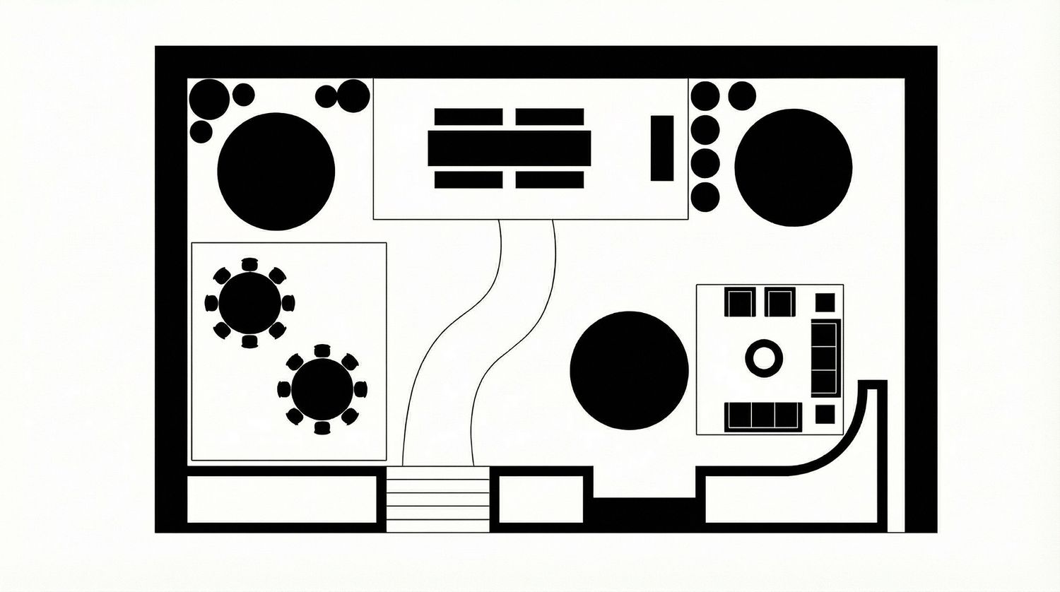 Intimate Seating: A small, tucked-away bench near the bottom planters offers a quiet spot for reflection away from the main social areas.