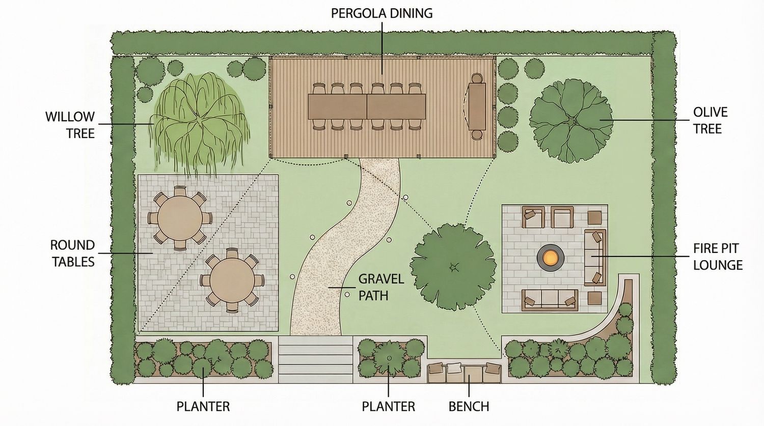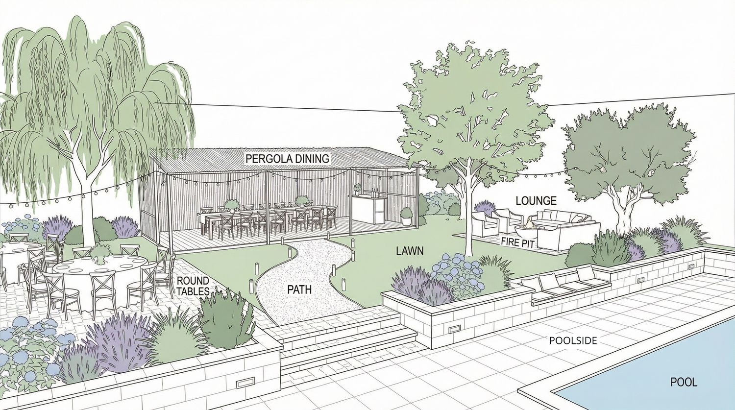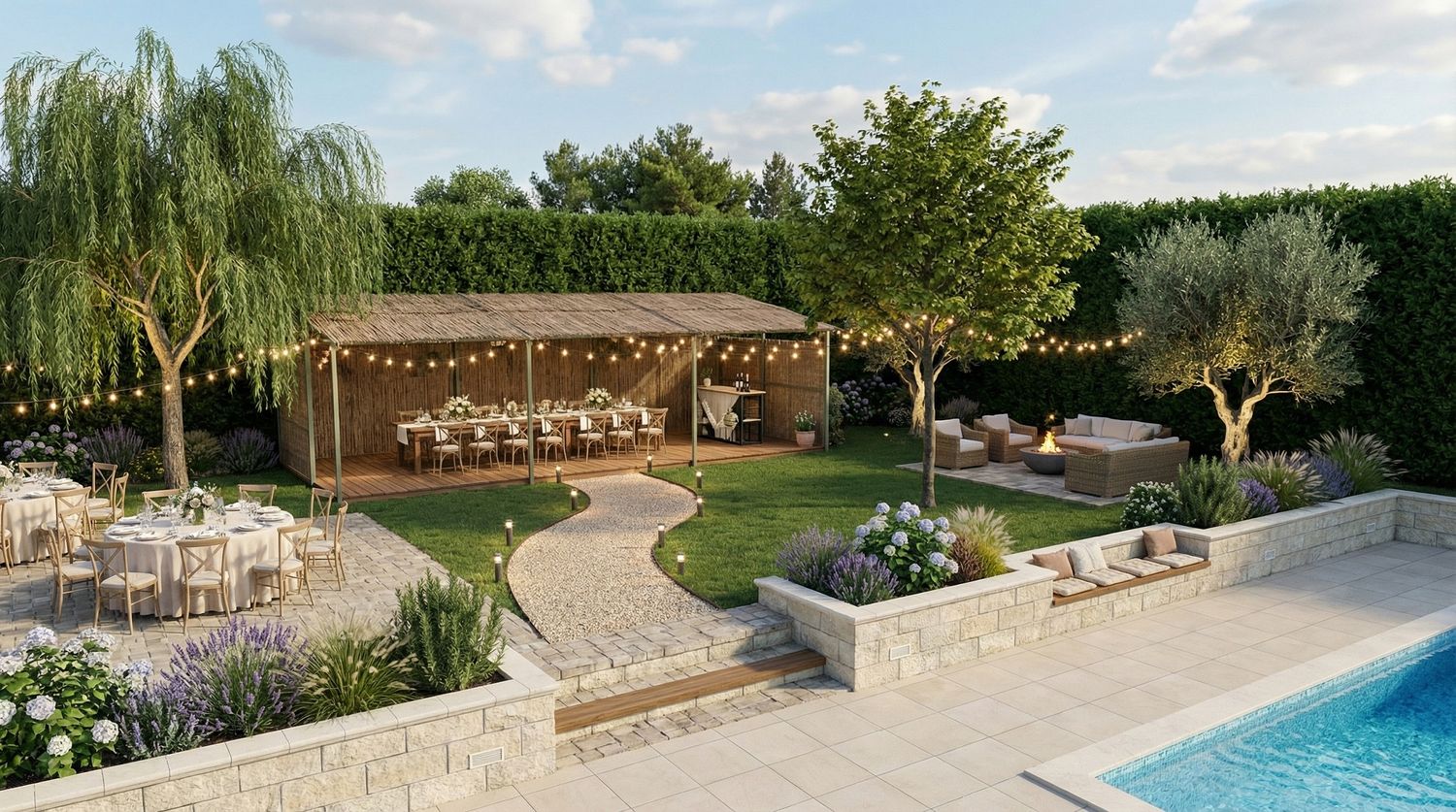 Diverse Foliage: Large specimen trees, including a Willow for texture and an Olive tree for a Mediterranean touch, provide shade and focal points.