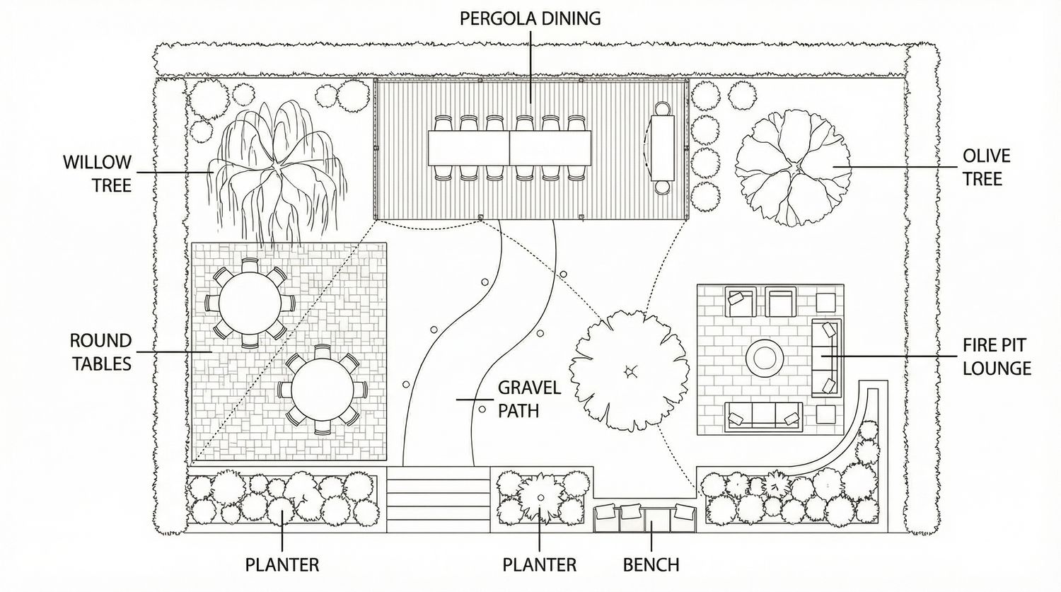 Gravel Path: A curved walkway of light-colored gravel provides a soft, organic flow through the center of the garden, connecting the different zones.