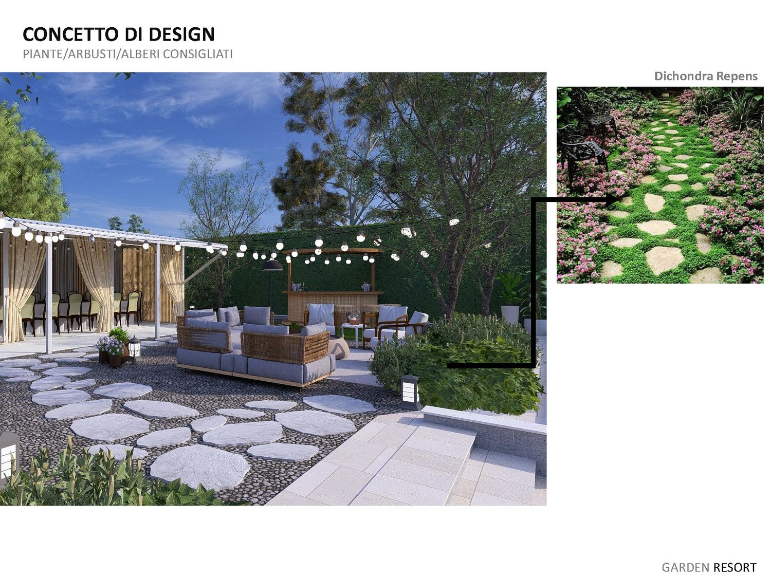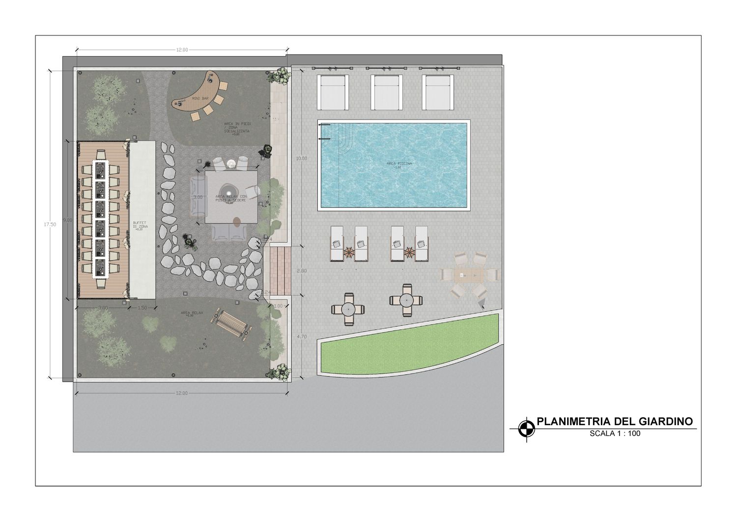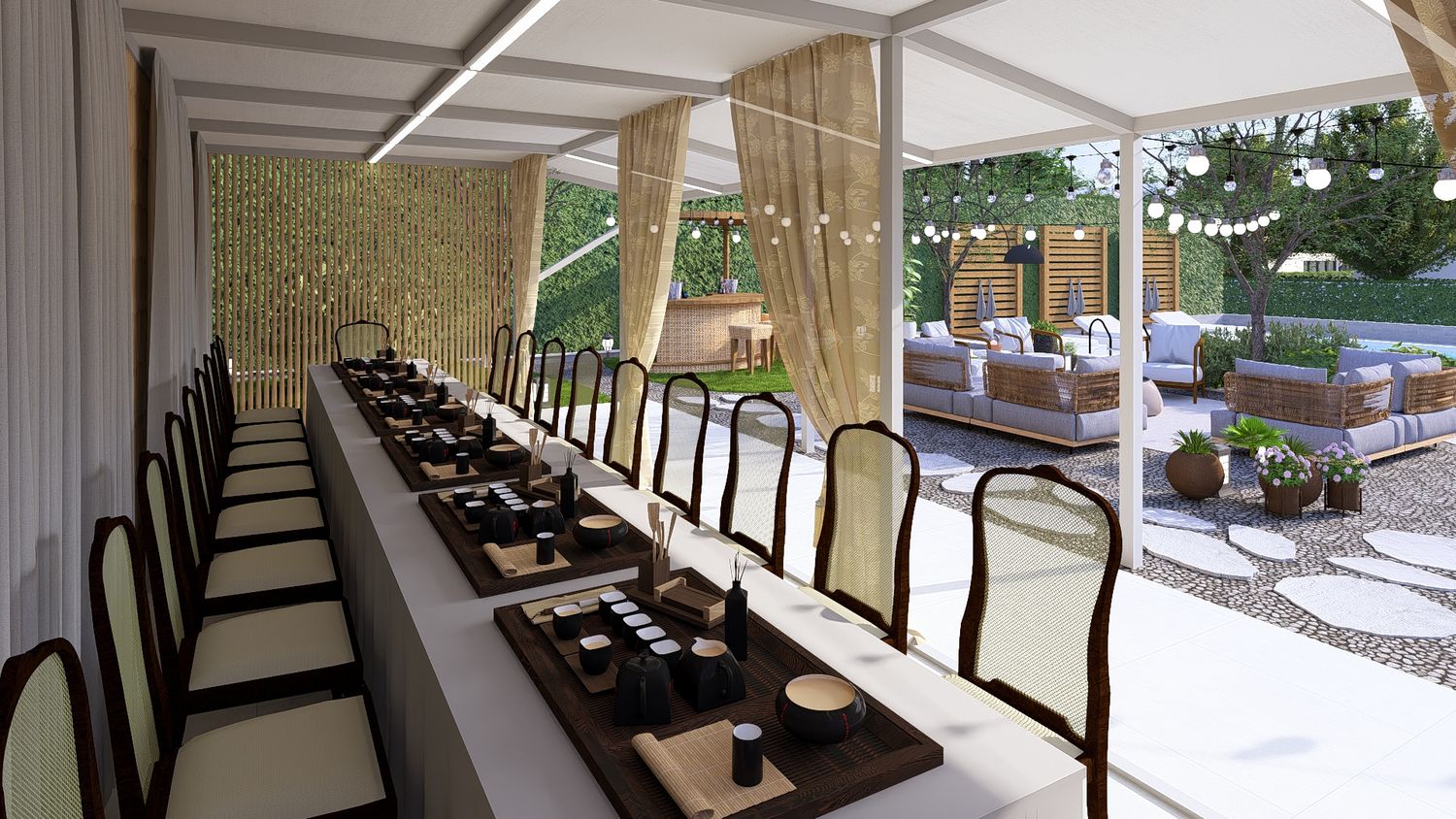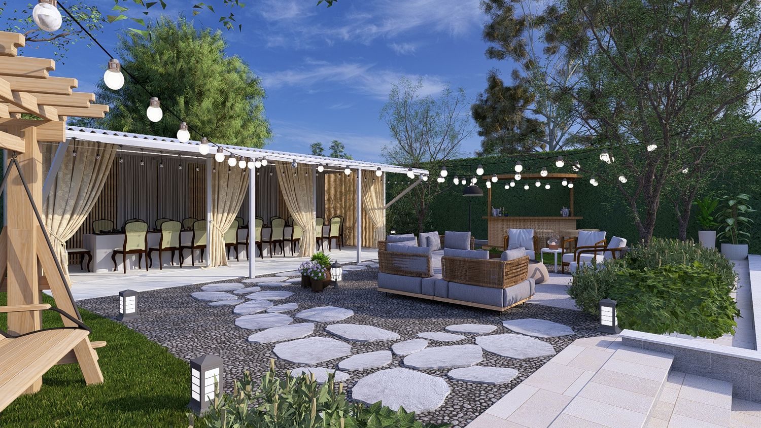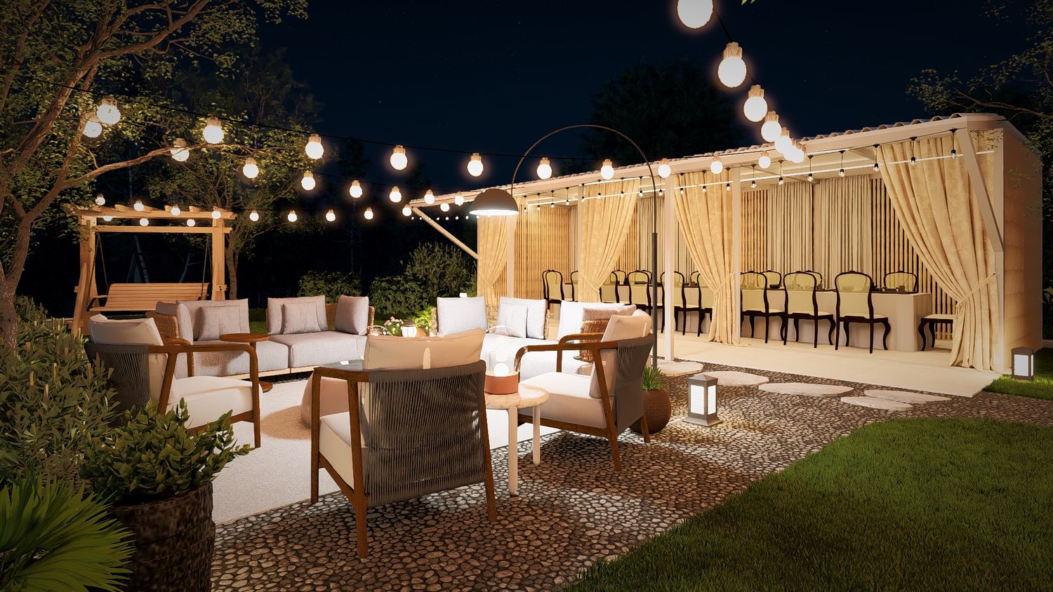 Questa proposta valorizza il giardino esistente trasformandolo in uno spazio per eventi all'aperto funzionale ed elegante, nel pieno rispetto delle strutture esistenti e del budget a disposizione.