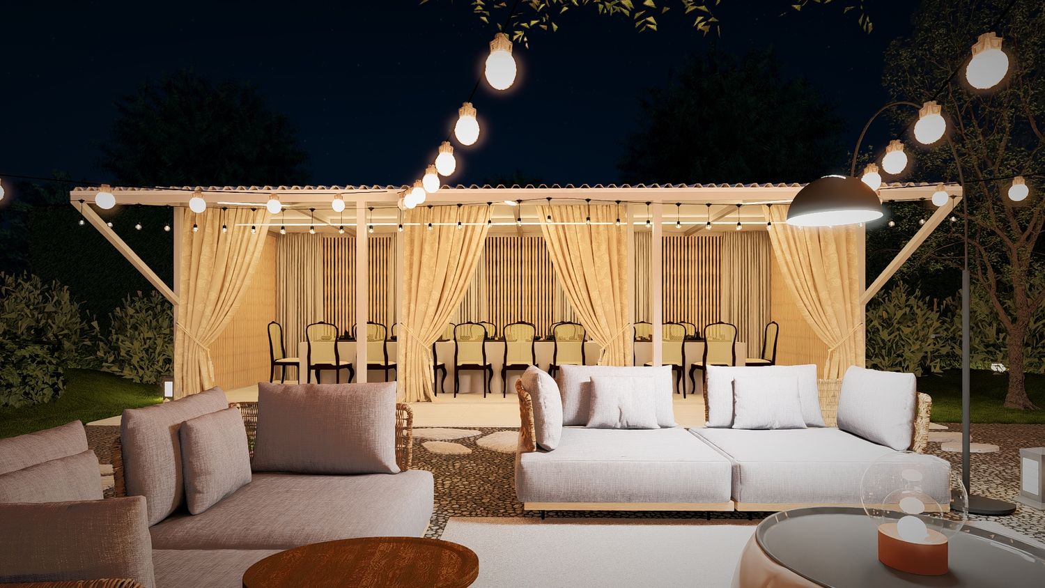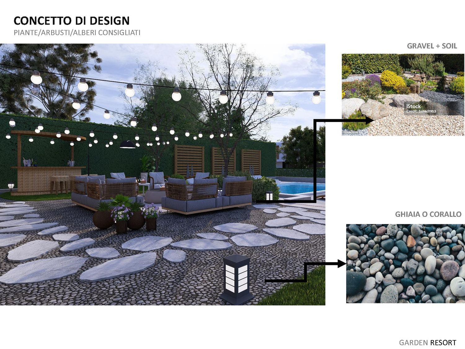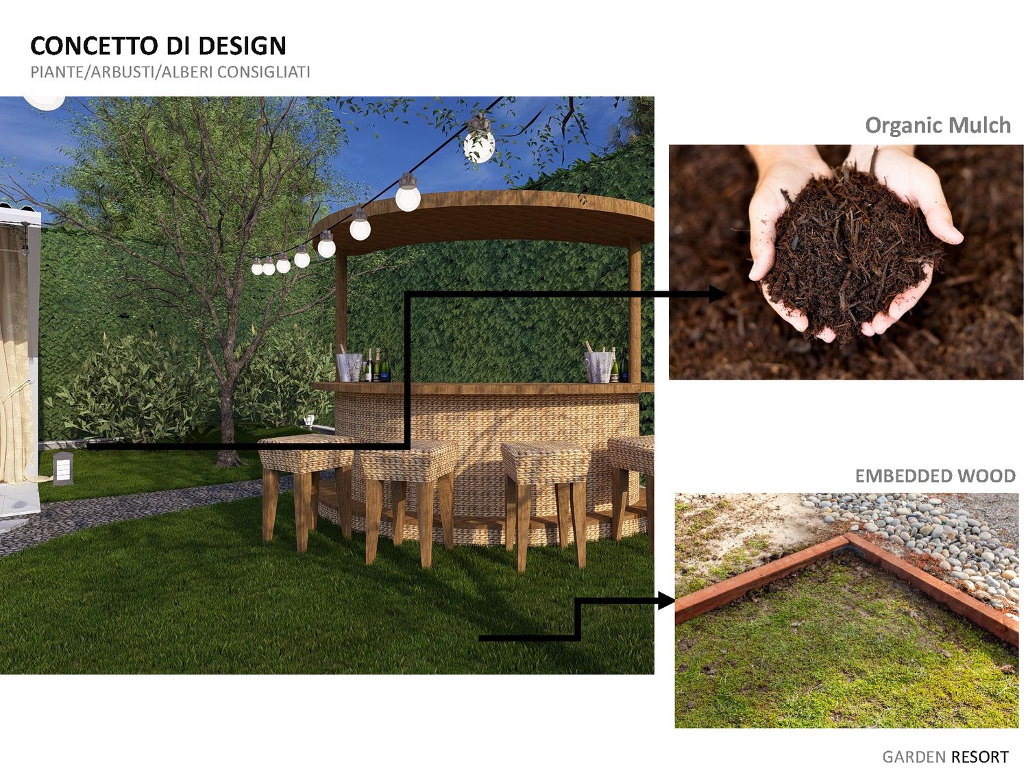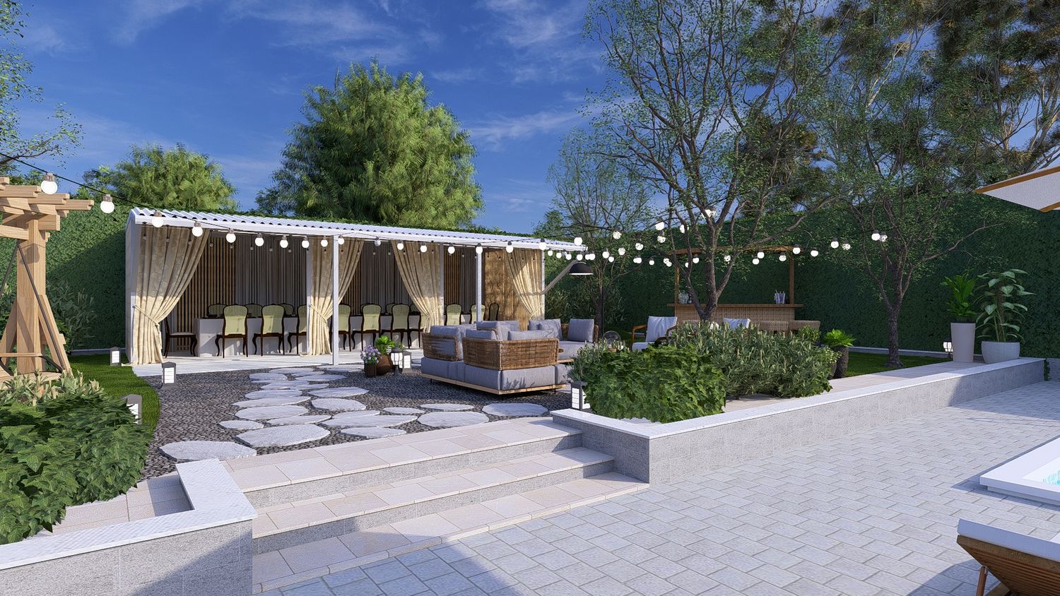 Questa proposta valorizza il giardino esistente trasformandolo in uno spazio per eventi all'aperto funzionale ed elegante, nel pieno rispetto delle strutture esistenti e del budget a disposizione.
