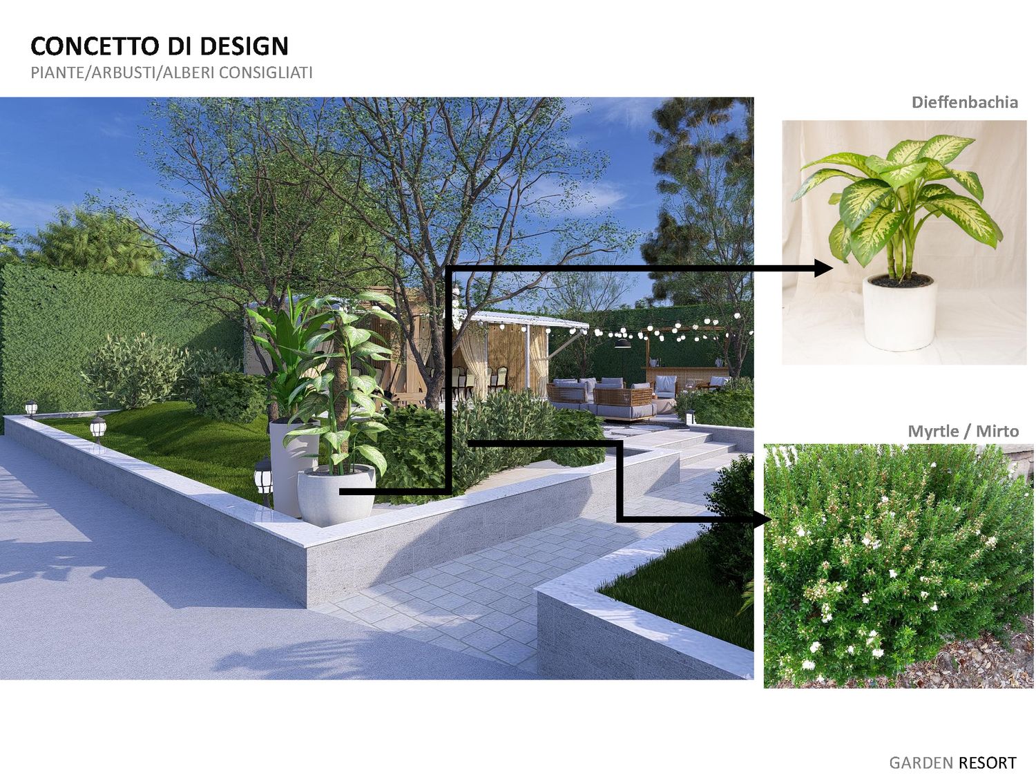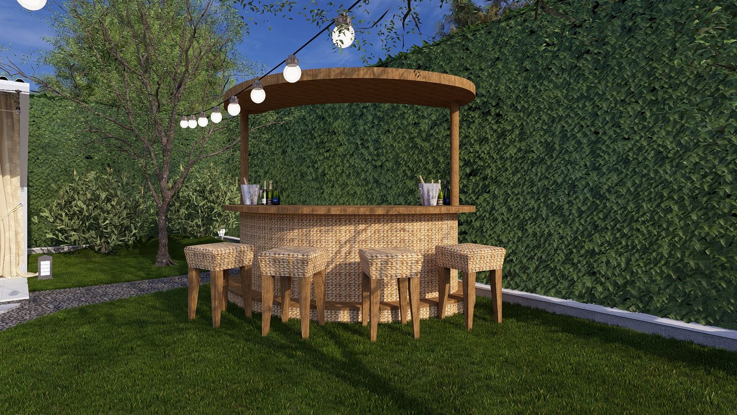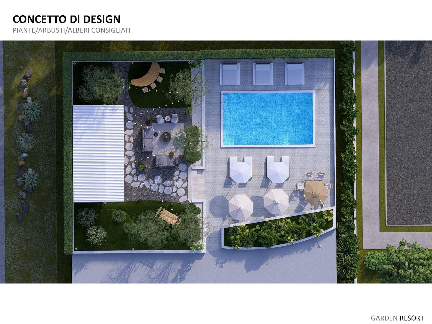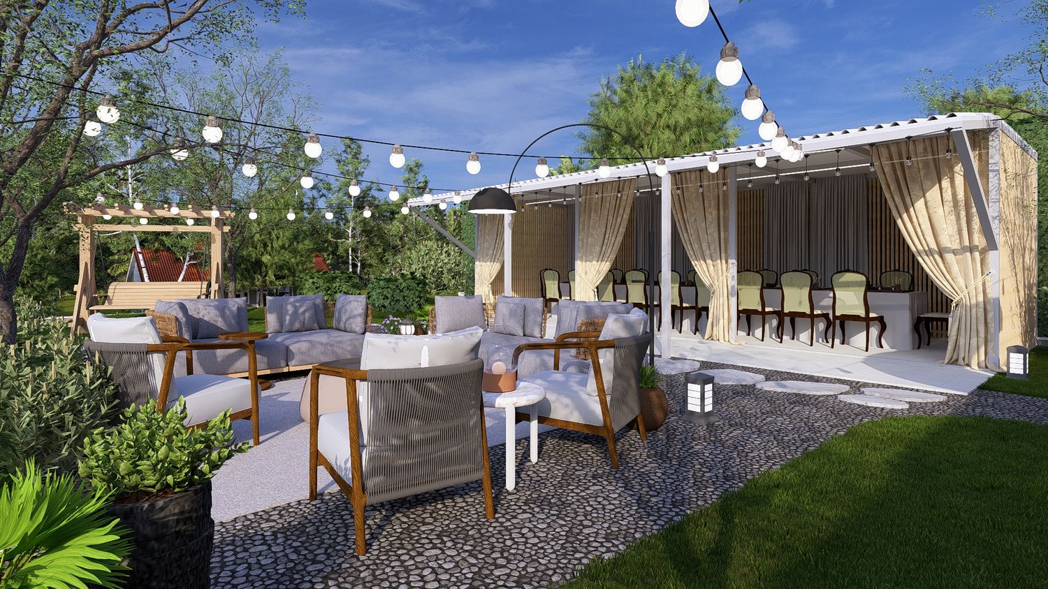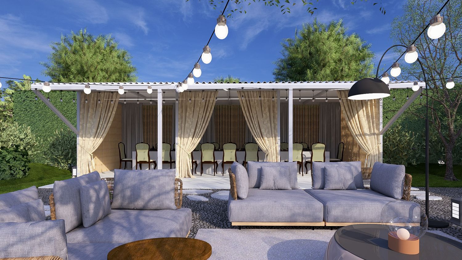 Questa proposta valorizza il giardino esistente trasformandolo in uno spazio per eventi all'aperto funzionale ed elegante, nel pieno rispetto delle strutture esistenti e del budget a disposizione.