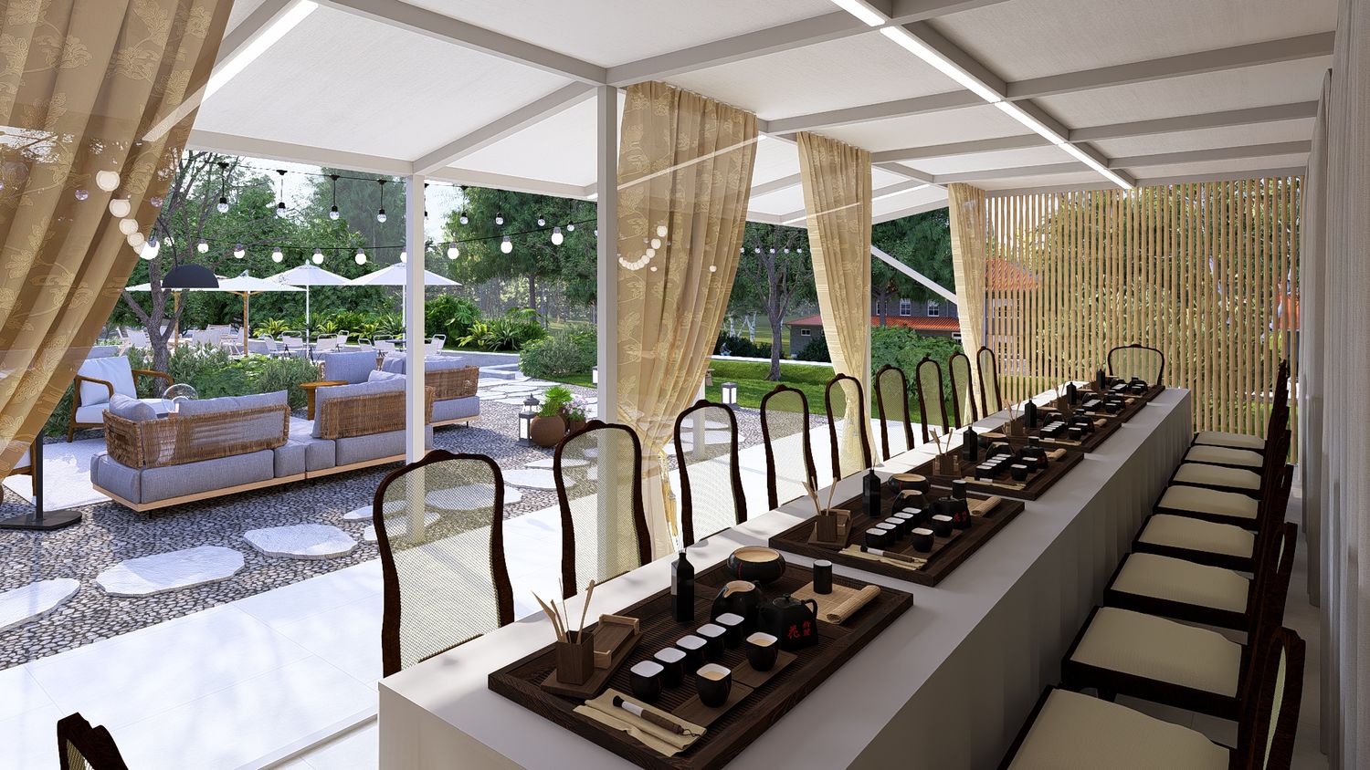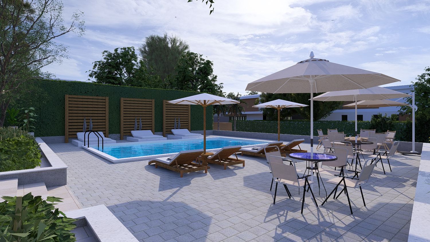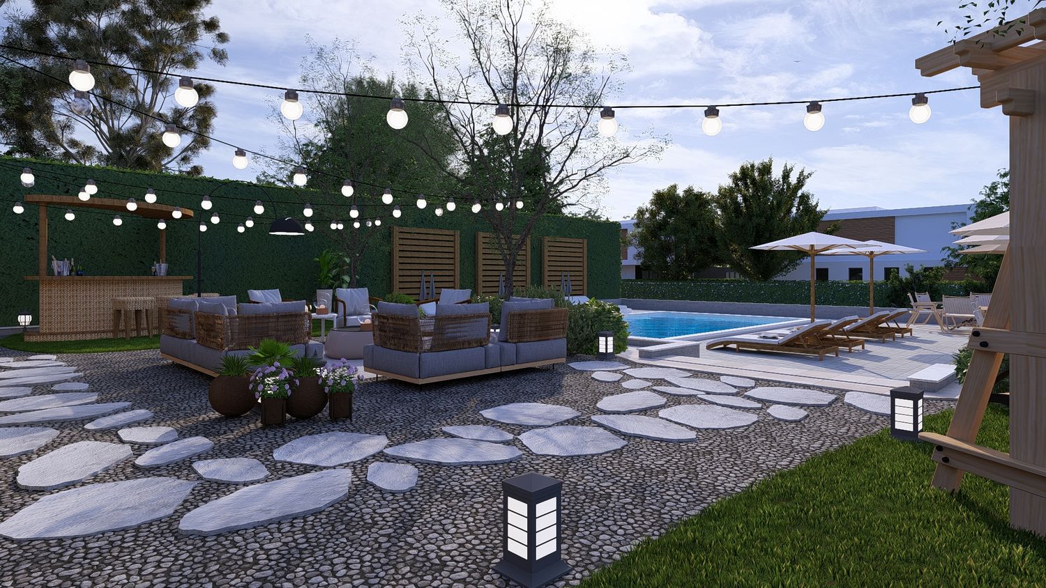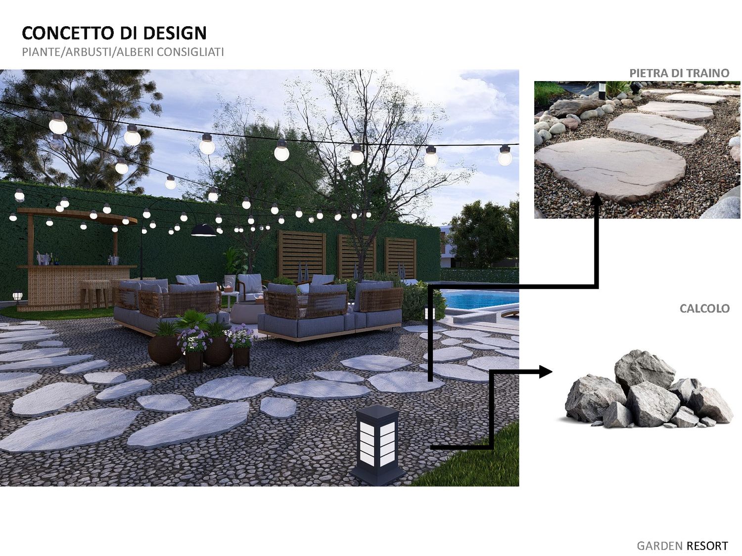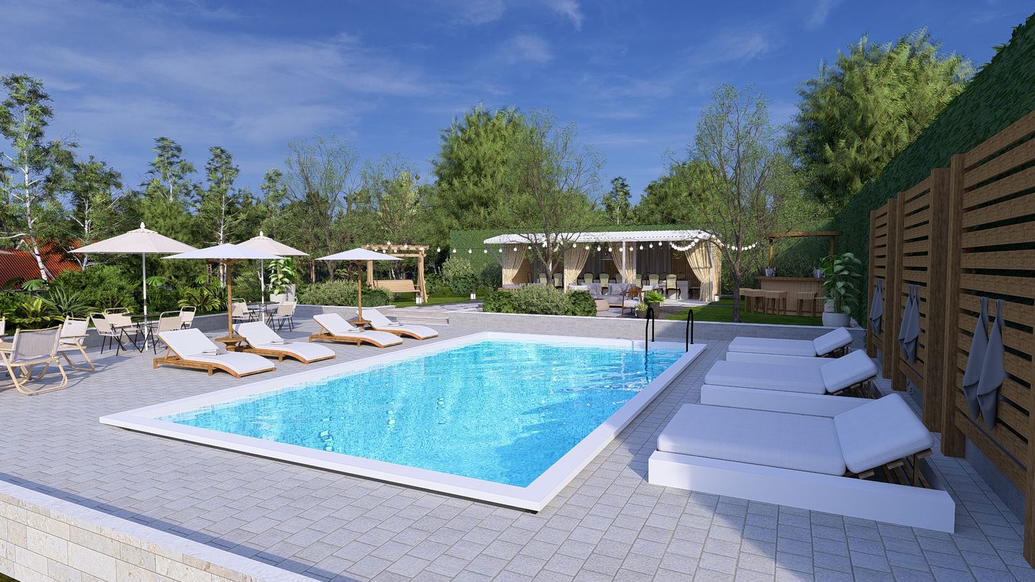 Questa proposta valorizza il giardino esistente trasformandolo in uno spazio per eventi all'aperto funzionale ed elegante, nel pieno rispetto delle strutture esistenti e del budget a disposizione.