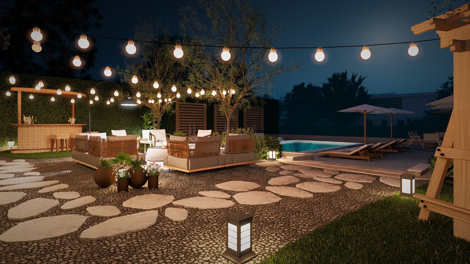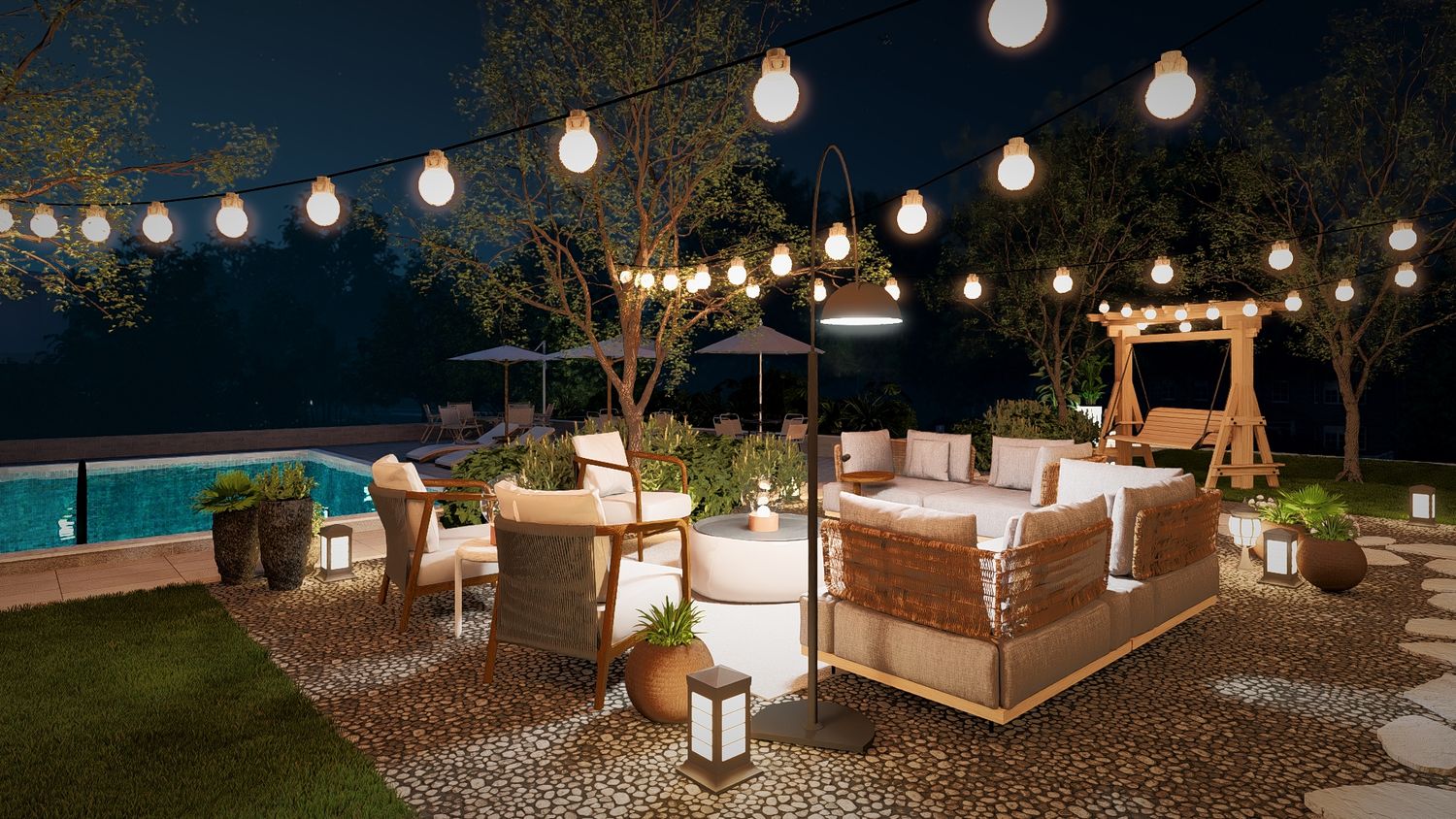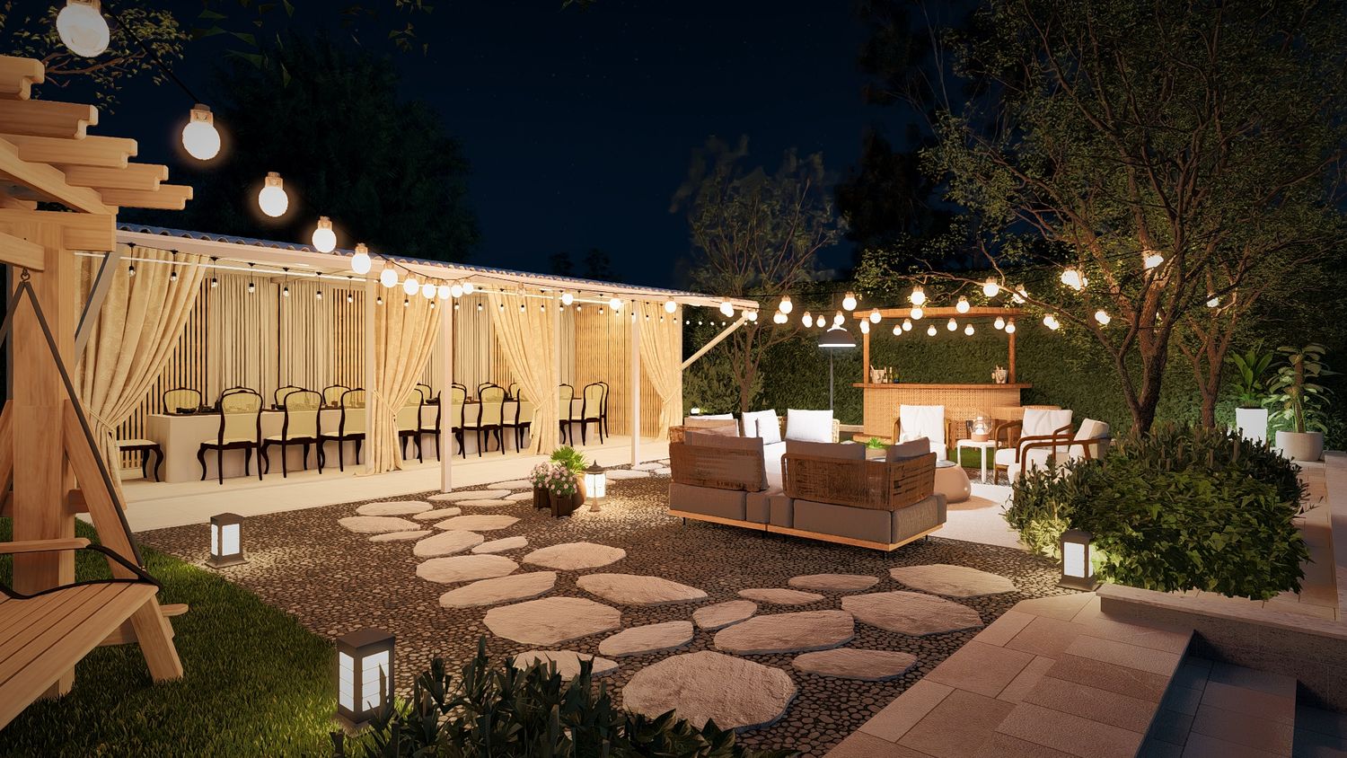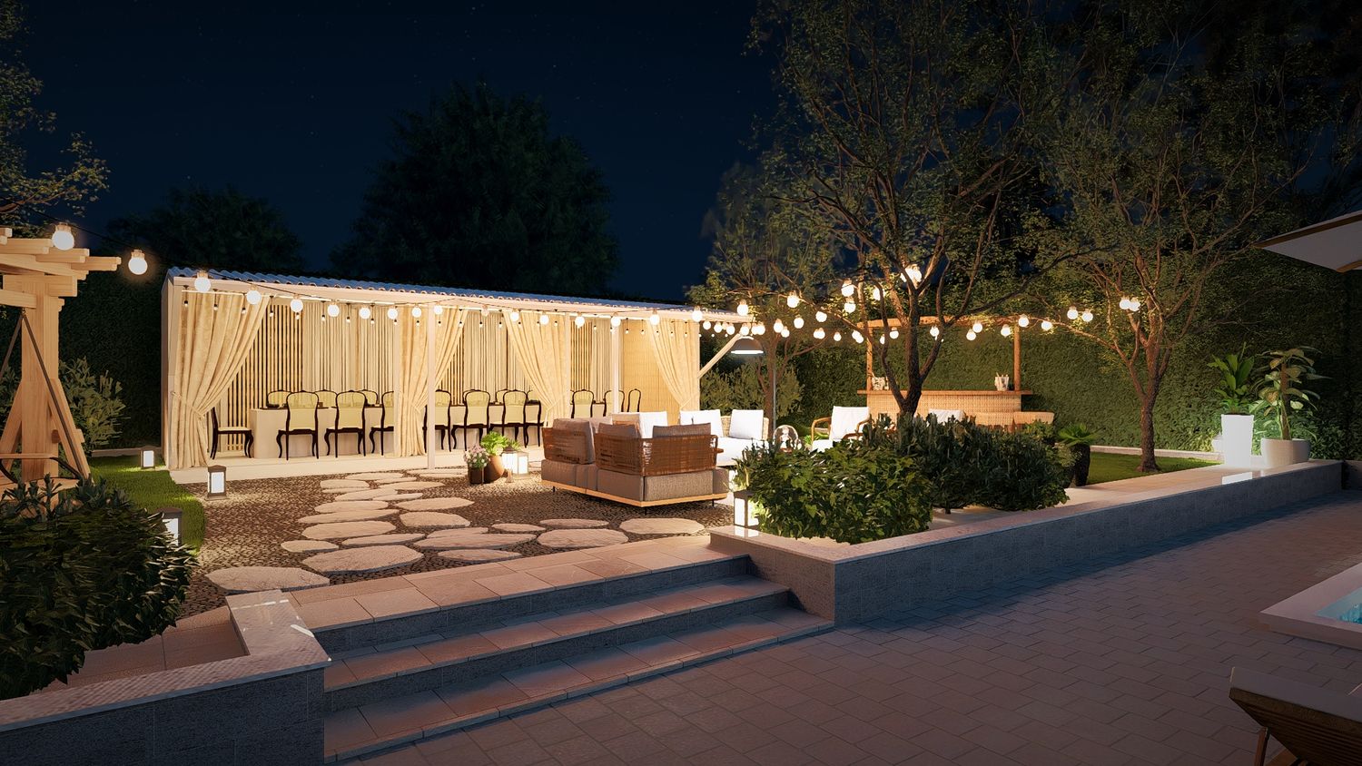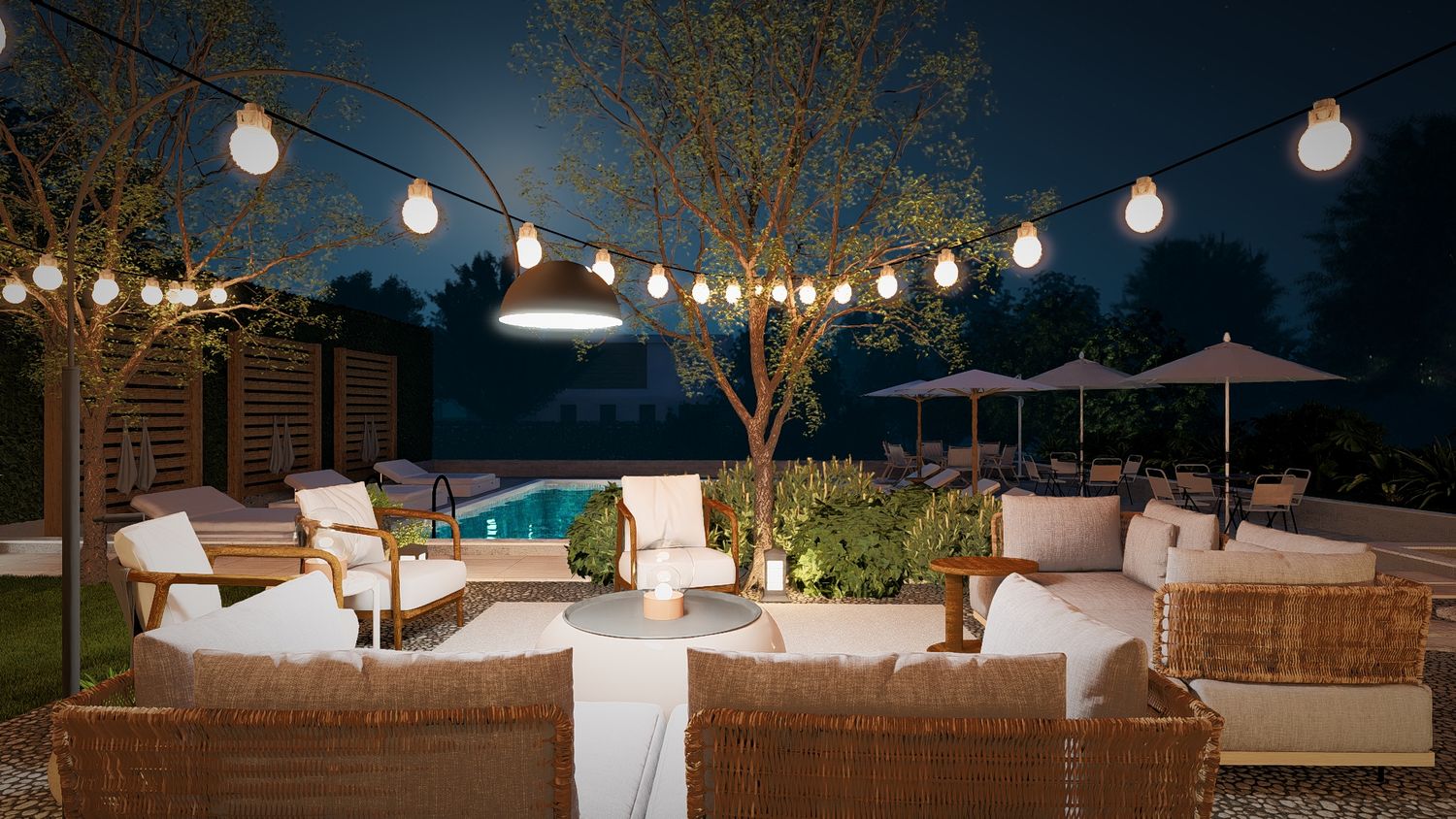 Elementi paesaggistici delicati, materiali naturali e arredi versatili creano un ambiente caldo e accogliente, mentre l'illuminazione integrata (luci a catena, luci d'ambiente e accenti sugli alberi) valorizza lo spazio di notte, rendendolo ideale per eventi.