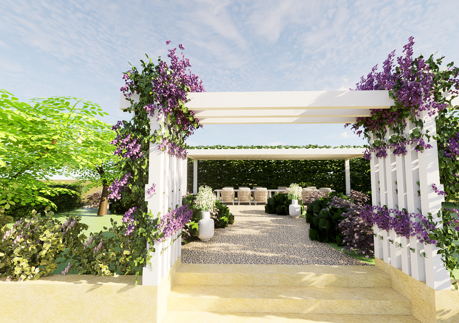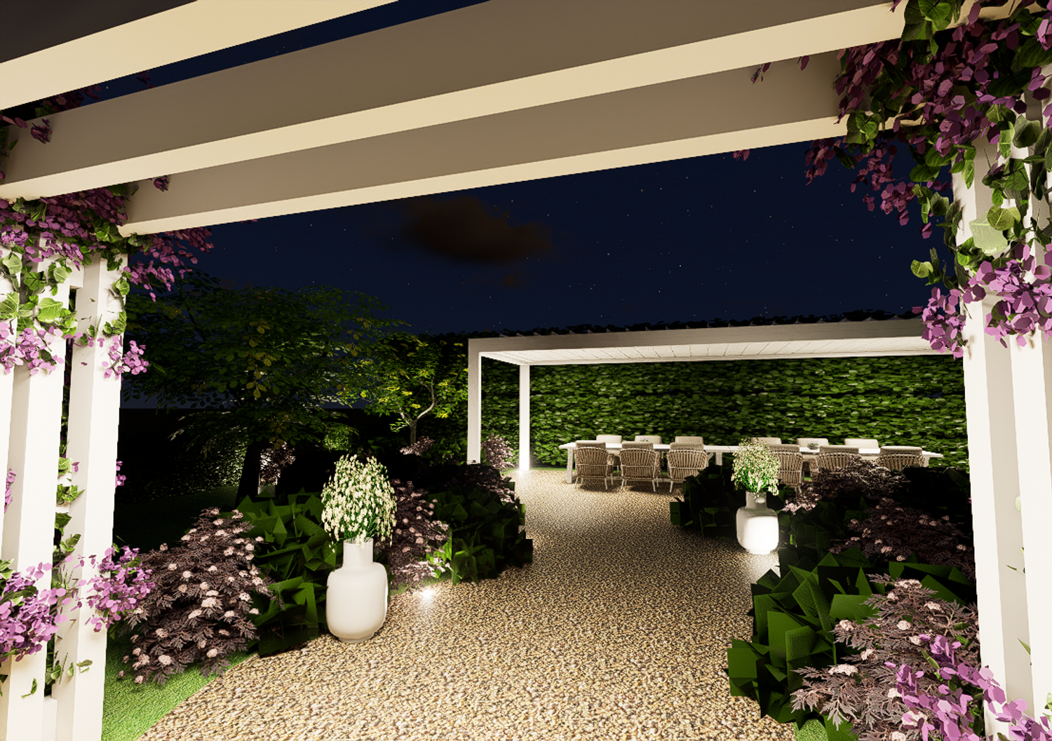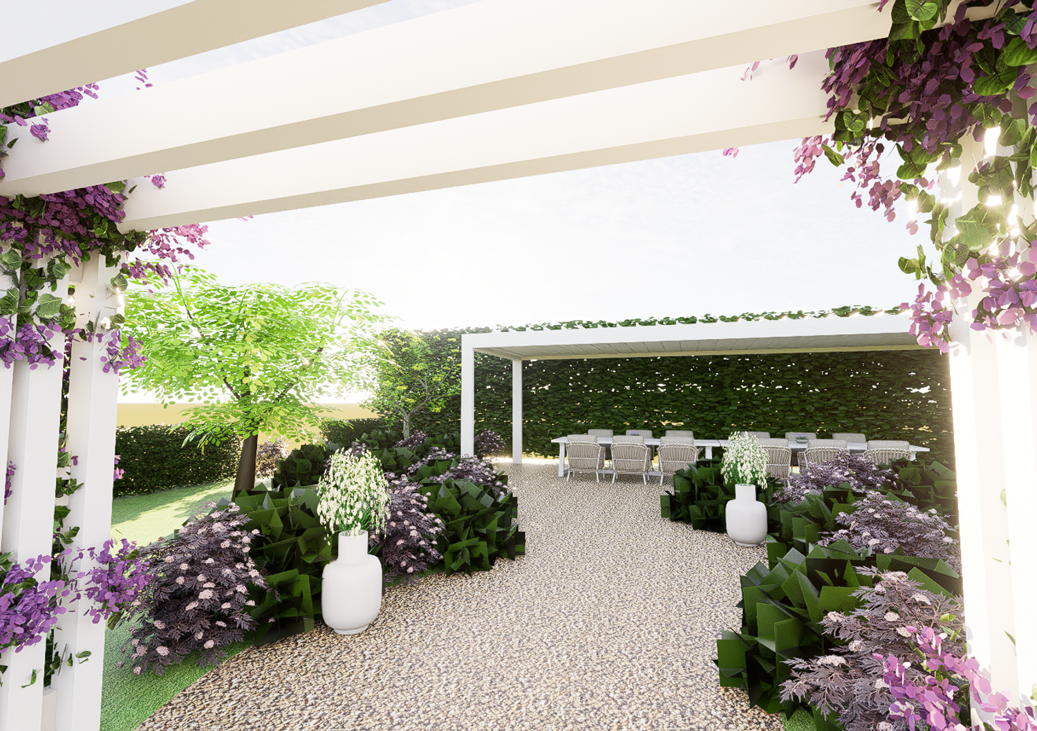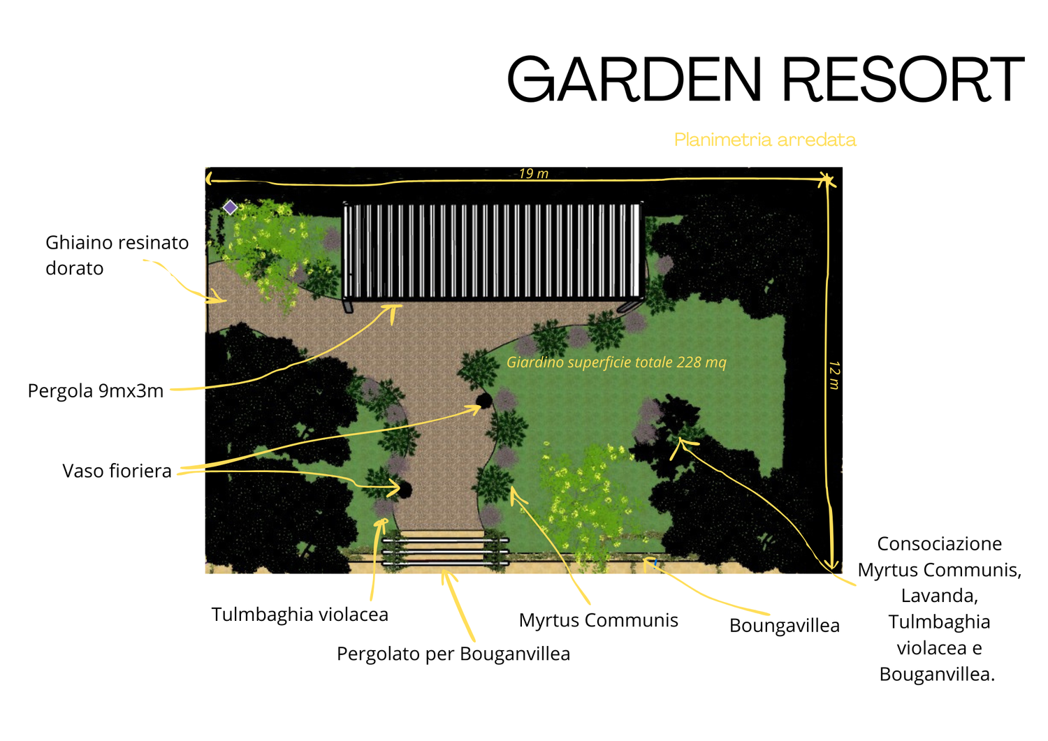 Il progetto rispetta le richieste della committenza. La scelta dello stile e delle piante arbore ha come punto cardine il contesto circostante. Infatti, il prato (tipologia Festuca), le piante, gli arbusti, i cespugli e i fiori sono stati scelti per essere in armonia con la campagna iblea. In questo giardino mediterraneo troviamo piante che si adattano bene ad una location rustica ma ricercata come ad esempio la Tulmbaghia violacea, la Bougaville, il Myrtus Communis e la Lavanda. Il ghiaino resinato dorato e il percorso con linee curve vogliono richiamare il barocco ibleo. Inoltre il nuovo percorso pavimentato sinuoso e decorato crea un effetto ottico di ampiezza. Le strutture, quali la pergola e il gazebo, sono eleganti e in armonia con la struttura già esistente accanto alla piscina.