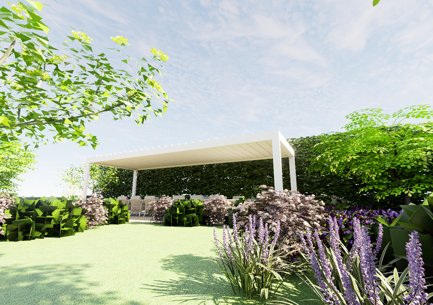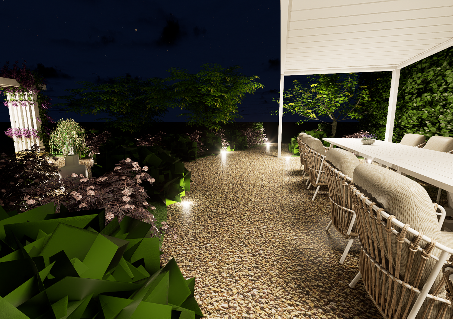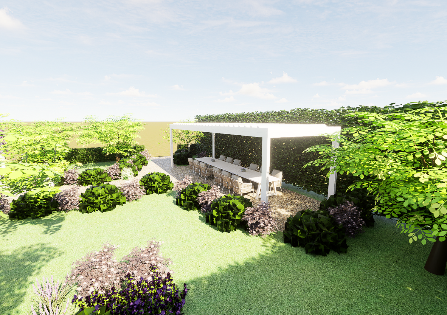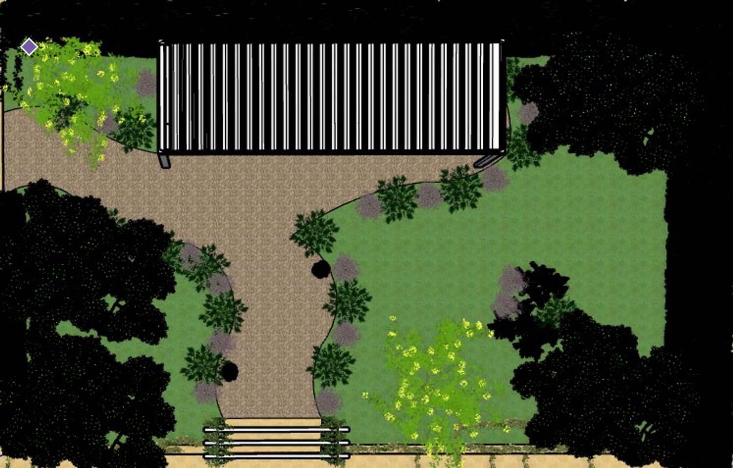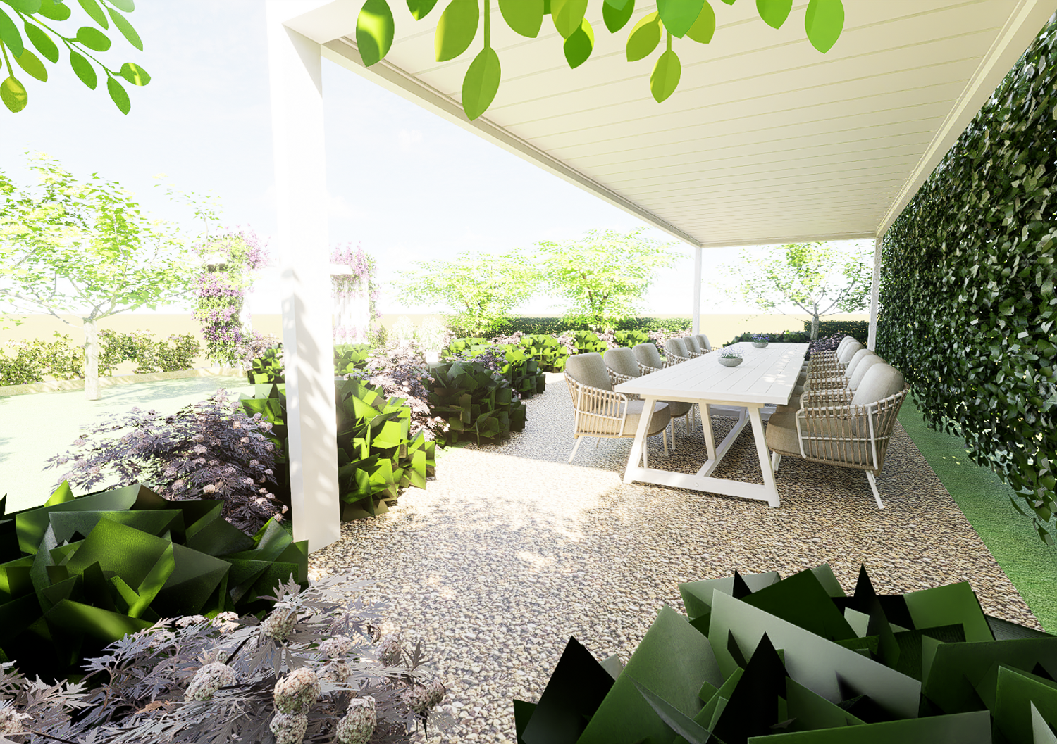 Il progetto rispetta le richieste della committenza. La scelta dello stile e delle piante arbore ha come punto cardine il contesto circostante. Infatti, il prato (tipologia Festuca), le piante, gli arbusti, i cespugli e i fiori sono stati scelti per essere in armonia con la campagna iblea. In questo giardino mediterraneo troviamo piante che si adattano bene ad una location rustica ma ricercata come ad esempio la Tulmbaghia violacea, la Bougaville, il Myrtus Communis e la Lavanda. Il ghiaino resinato dorato e il percorso con linee curve vogliono richiamare il barocco ibleo. Inoltre il nuovo percorso pavimentato sinuoso e decorato crea un effetto ottico di ampiezza. Le strutture, quali la pergola e il gazebo, sono eleganti e in armonia con la struttura già esistente accanto alla piscina.