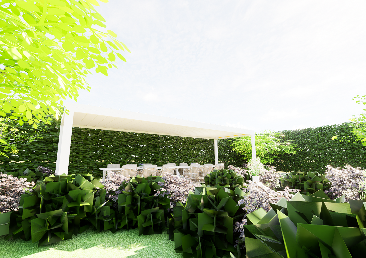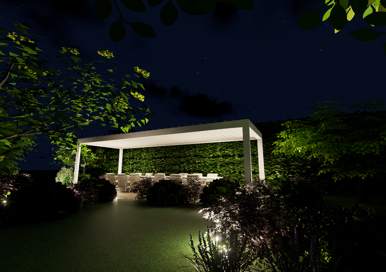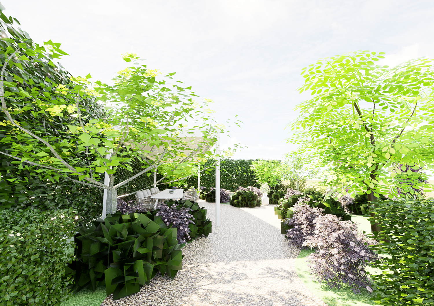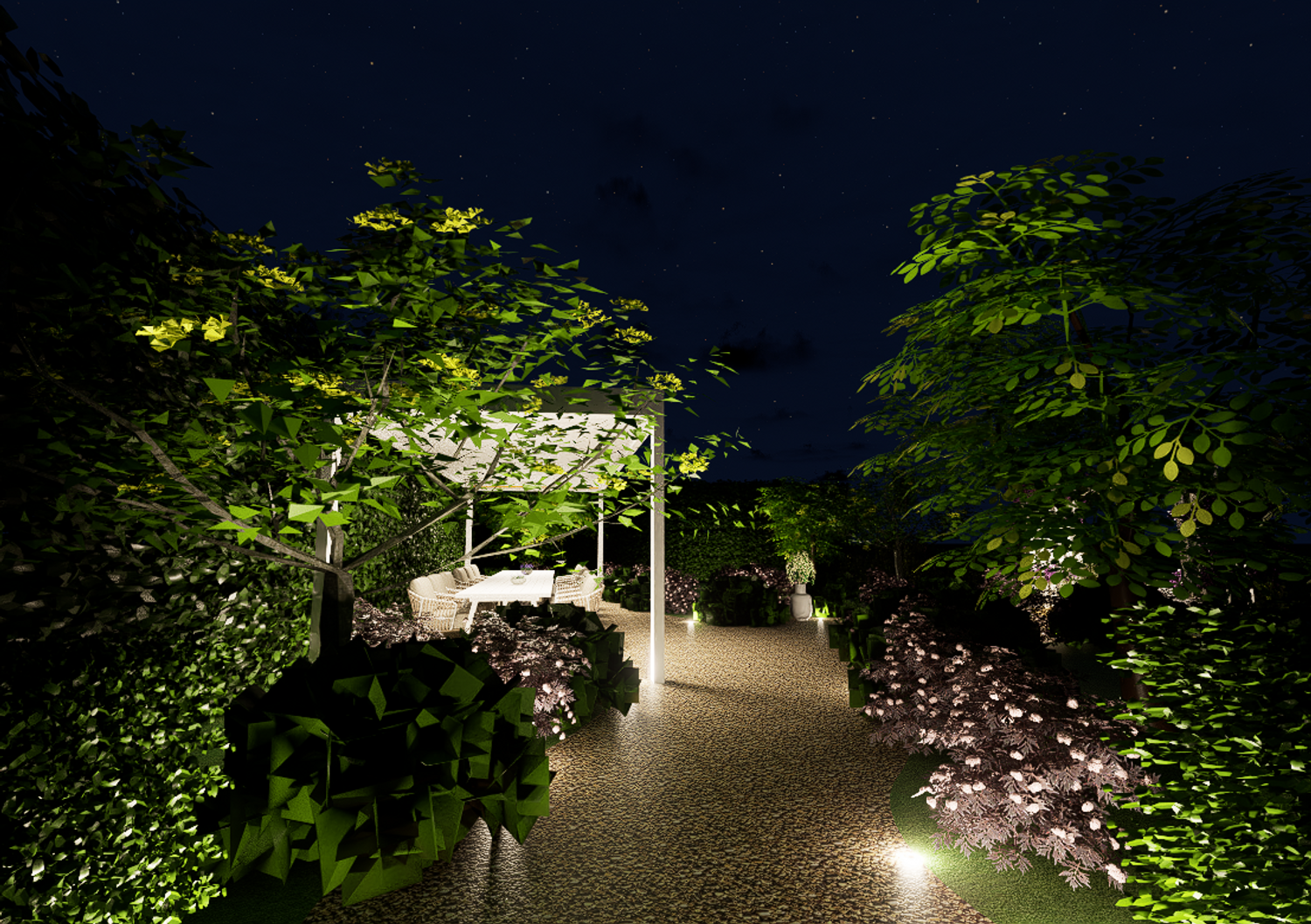 Il progetto rispetta le richieste della committenza. La scelta dello stile e delle piante arbore ha come punto cardine il contesto circostante. Infatti, il prato (tipologia Festuca), le piante, gli arbusti, i cespugli e i fiori sono stati scelti per essere in armonia con la campagna iblea. In questo giardino mediterraneo troviamo piante che si adattano bene ad una location rustica ma ricercata come ad esempio la Tulmbaghia violacea, la Bougaville, il Myrtus Communis e la Lavanda. Il ghiaino resinato dorato e il percorso con linee curve vogliono richiamare il barocco ibleo. Inoltre il nuovo percorso pavimentato sinuoso e decorato crea un effetto ottico di ampiezza. Le strutture, quali la pergola e il gazebo, sono eleganti e in armonia con la struttura già esistente accanto alla piscina.