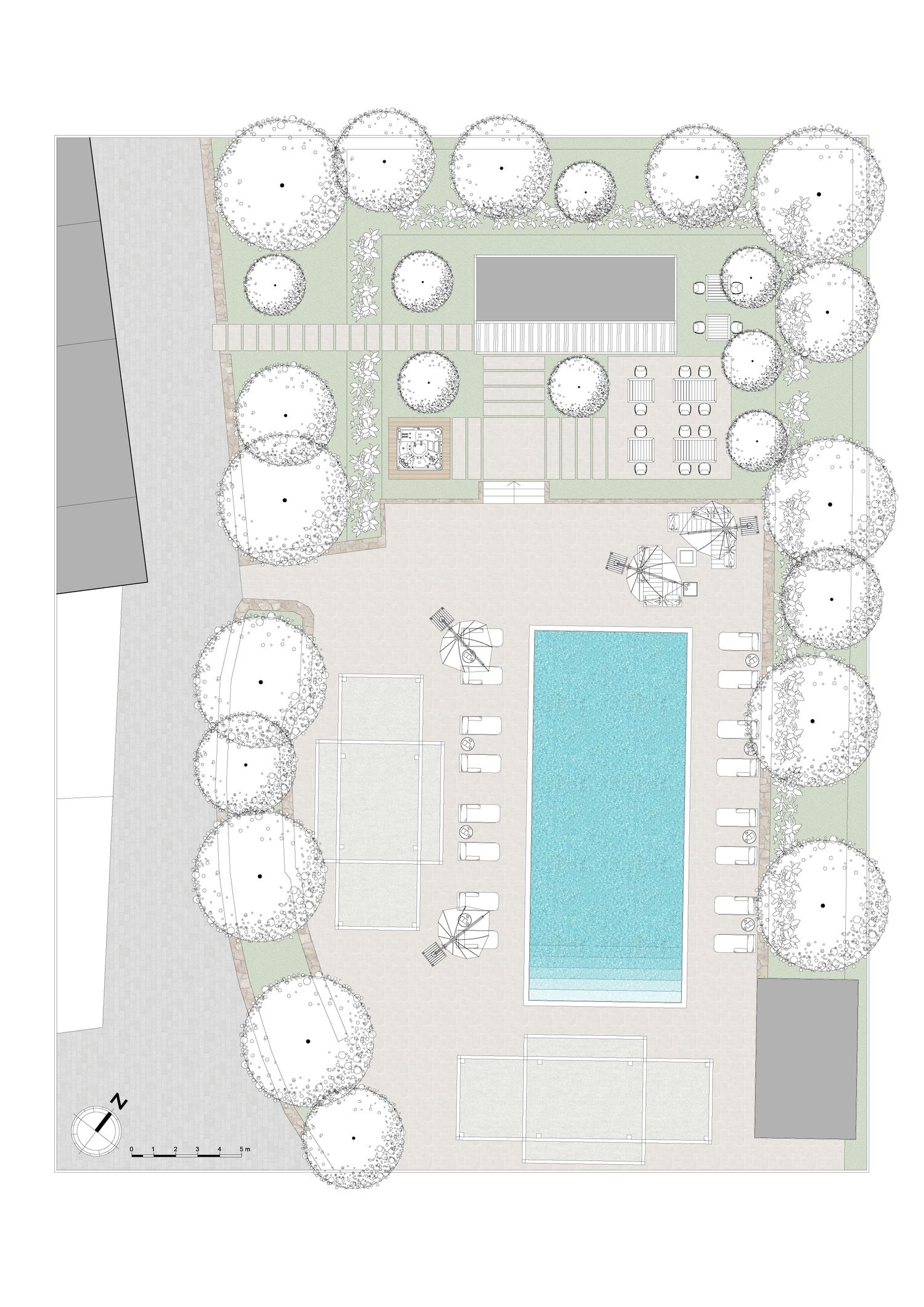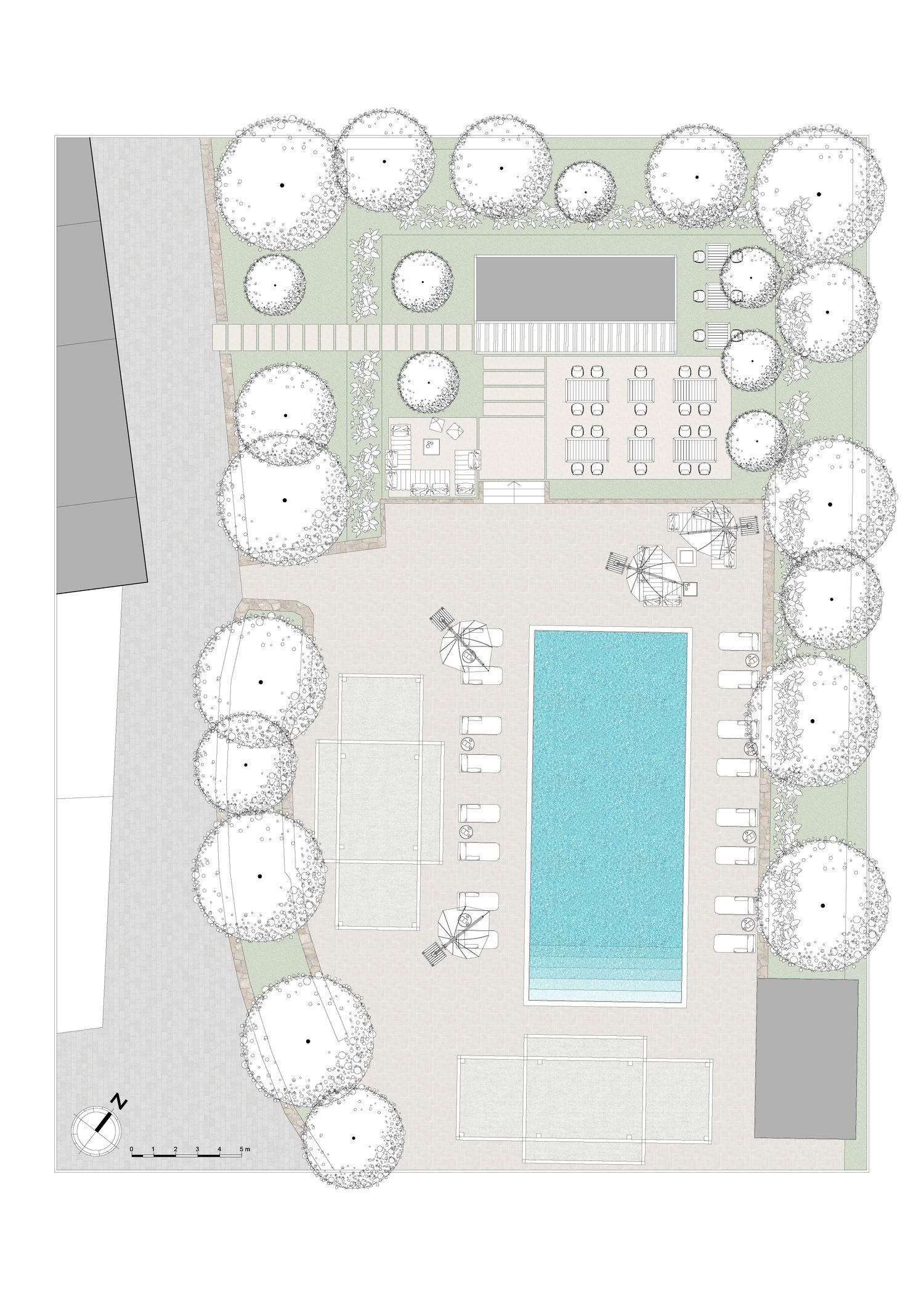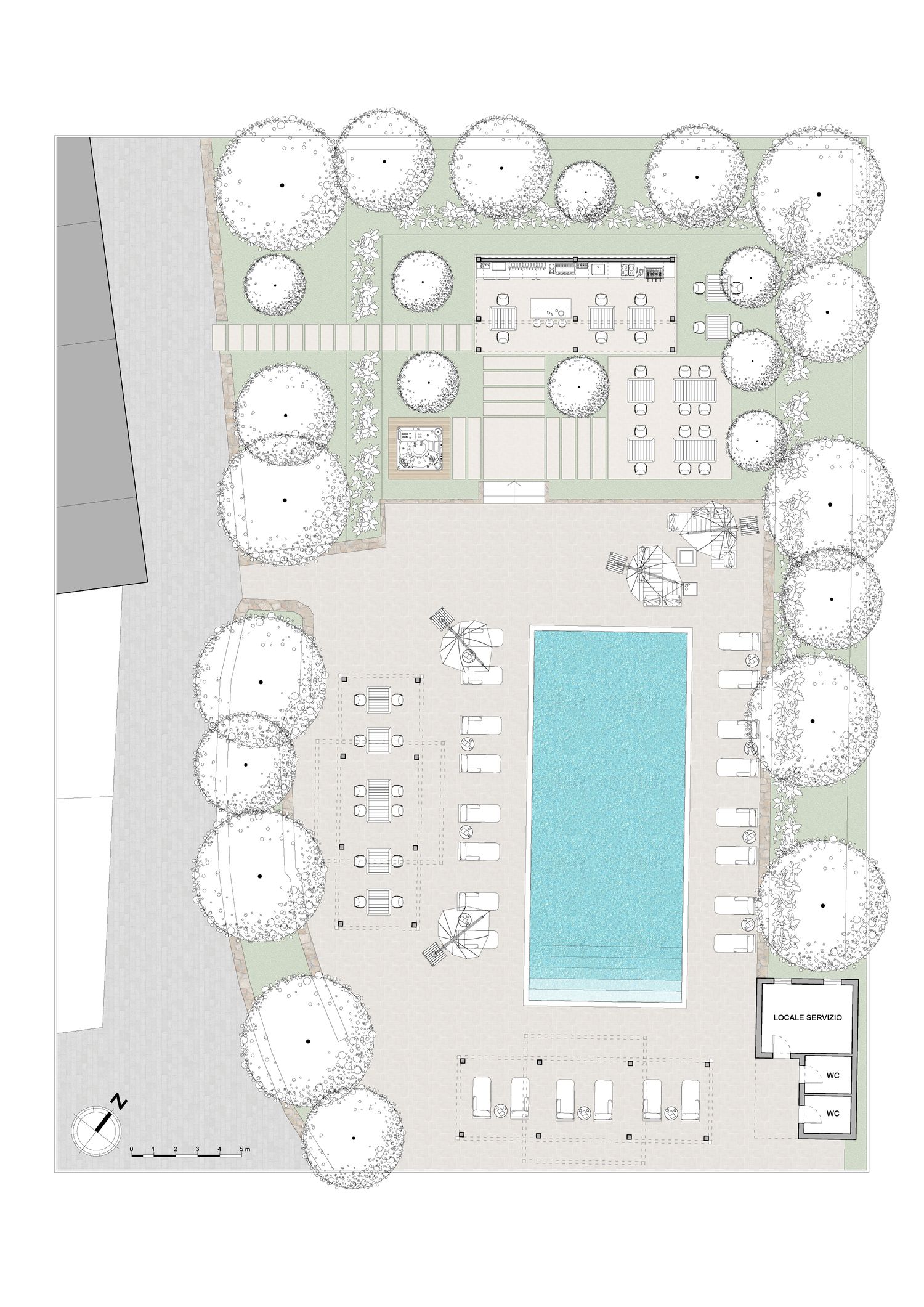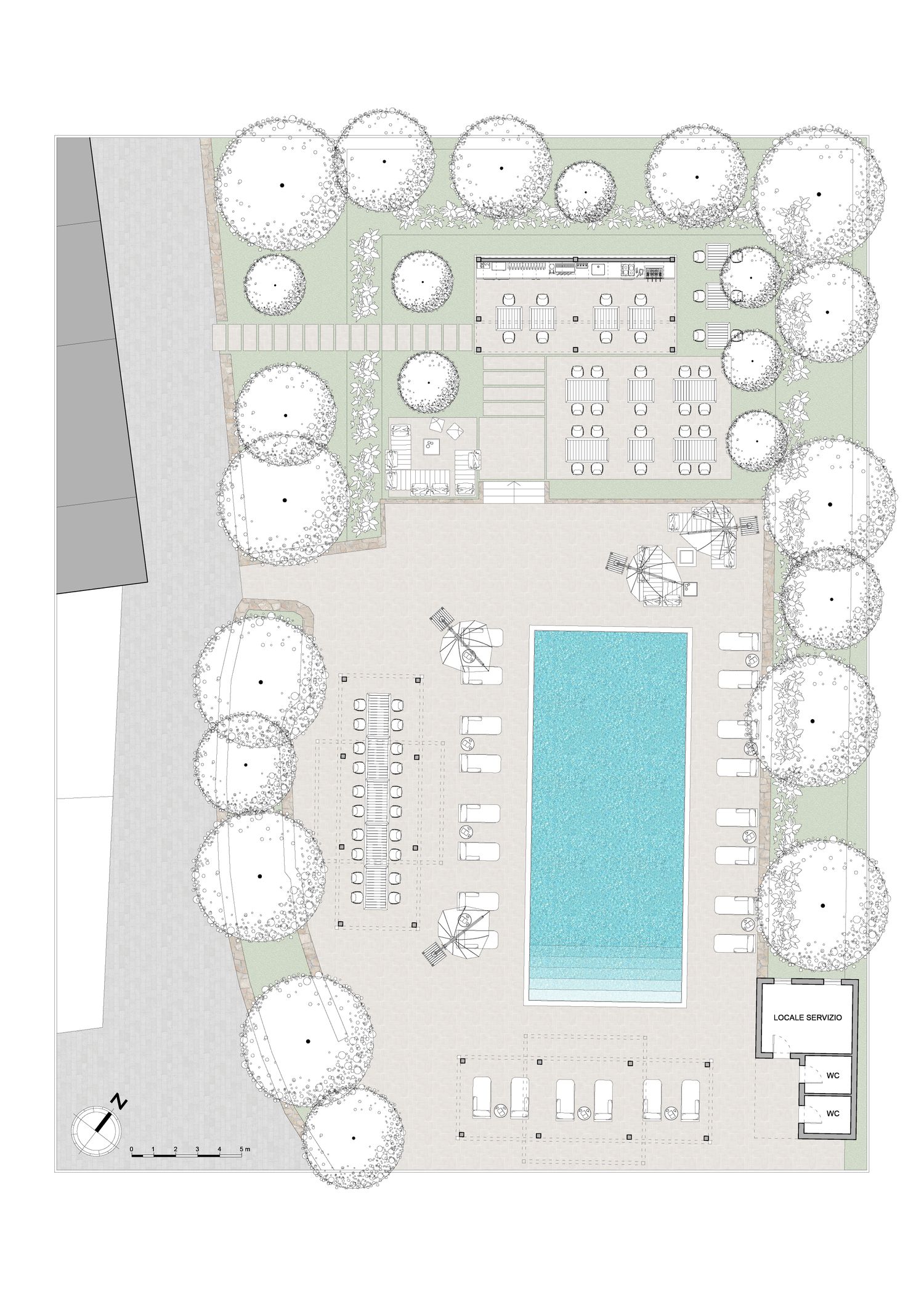 La nostra proposta intende riqualificare lo spazio verde del resort, integrandolo pienamente con la zona piscina/lounge, e progettando un insieme elegante, luminoso e piacevole in cui trascorrere momenti di relax, gioco, convivialità ed in cui organizzare cerimonie ed eventi.