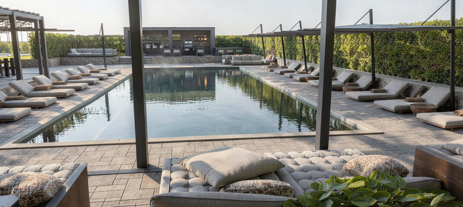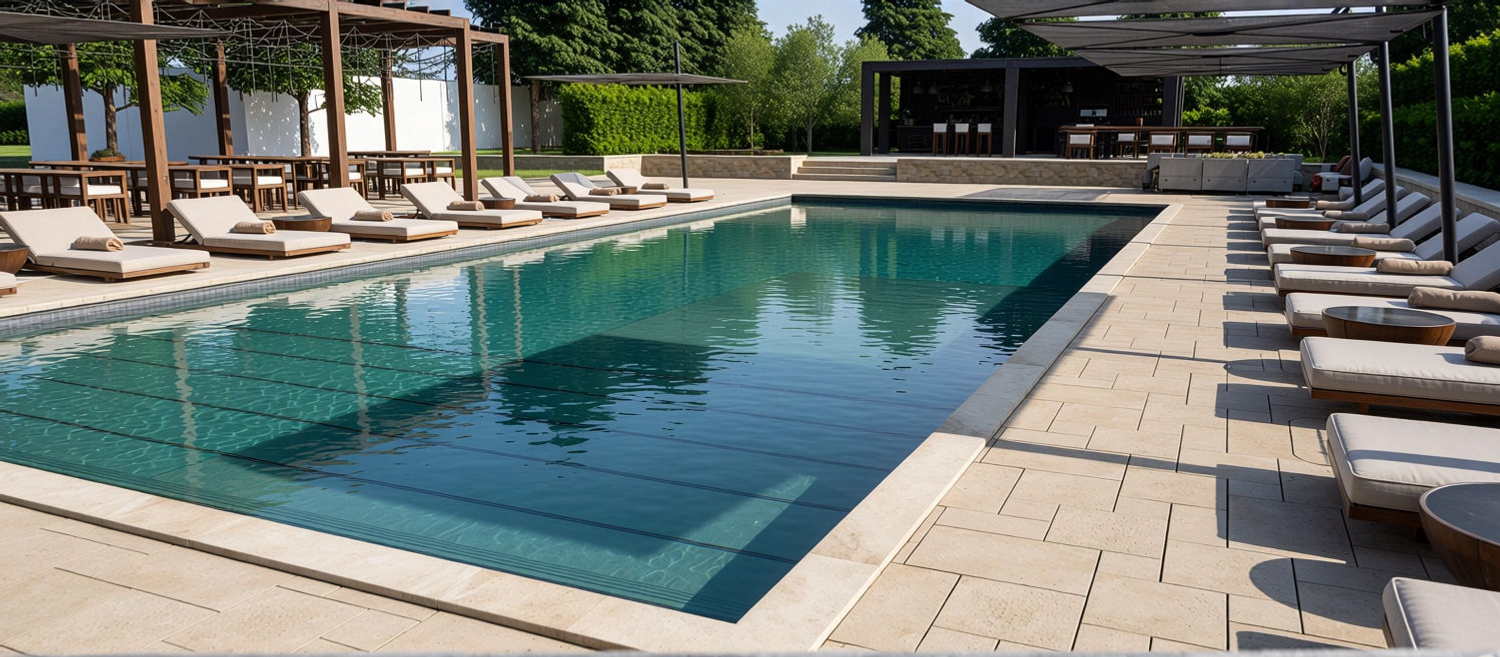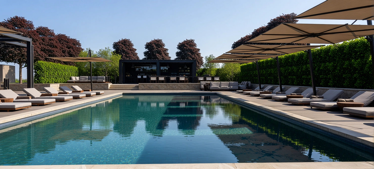 A bordo piscina, lettini con lo stesso stile delle sedute dell'area caffetteria, ombrelloni, ed una zona lounge con divani e piccolo focolare; sotto le due strutture pergolate, vengono ricavati ulteriori spazi per tavoli, poltroncine e lettini lounge.