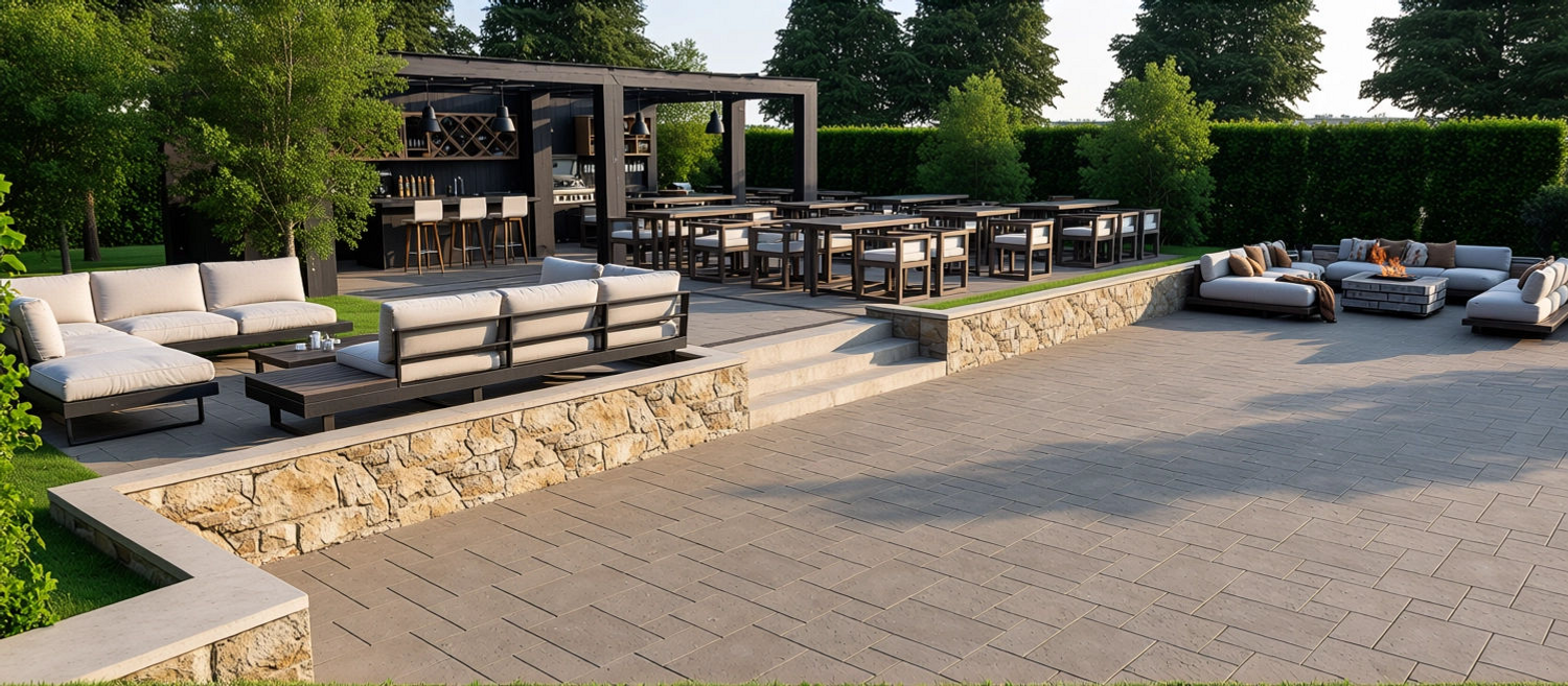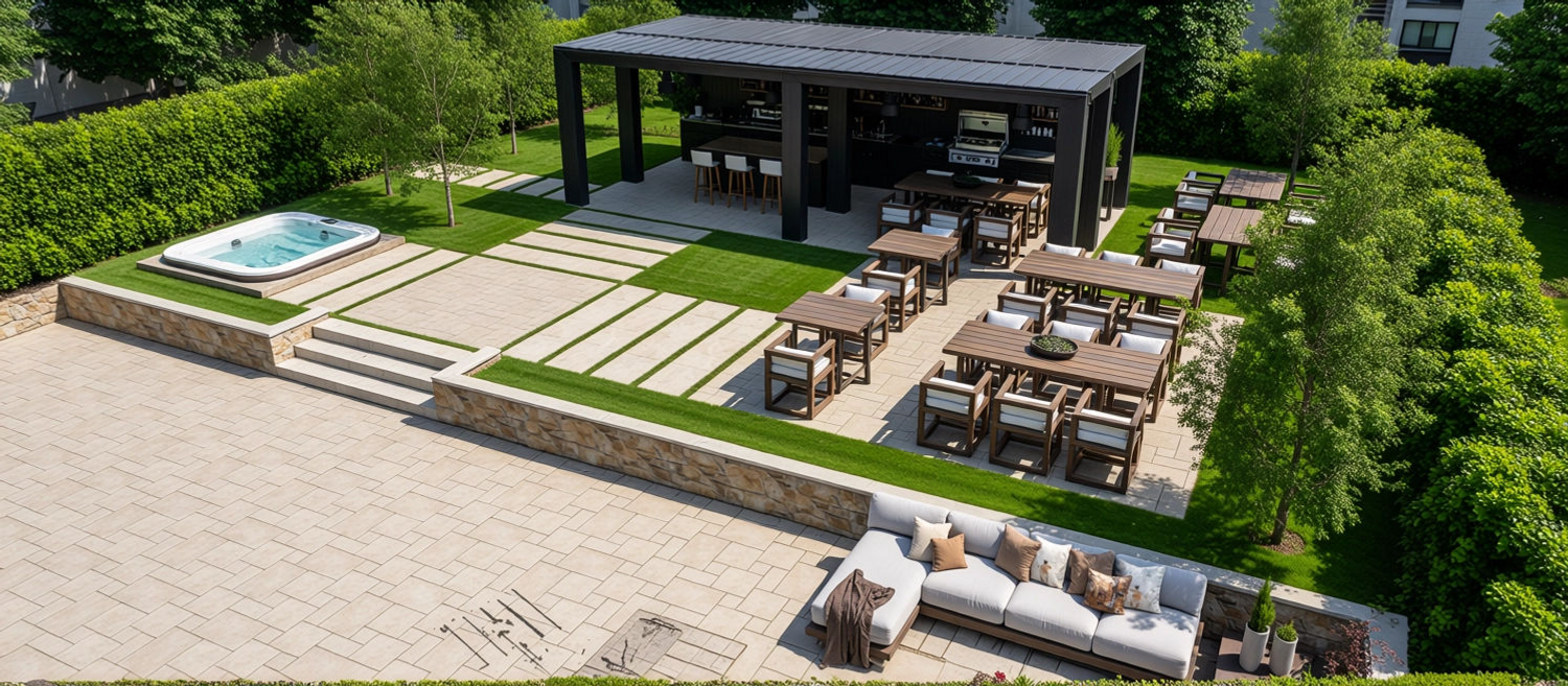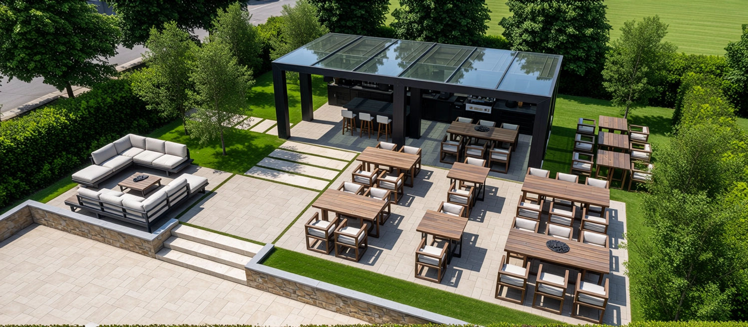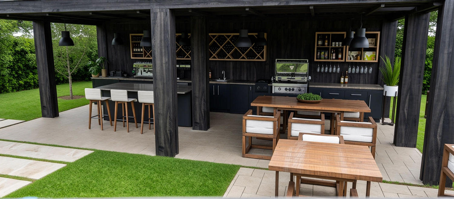 La struttura/gazebo, immersa in un terrazzamento in parte lasciato a prato e in parte disegnato da una pavimentazione in lastre ed elementi di pietra chiara, viene rinnovata ed attrezzata con un banco bar/cucina/barbecue outdoor (attrezzato con frigo sotto piano, macchina caffè professionale, piano induzione, lavello, griglia BBQ), con piccolo banco di servizio, sgabelli, e con un nuovo arredo esterno composto da: tavoli in legno, poltroncine in legno e tessuti naturali, divani lounge in legno e tessuti naturali.