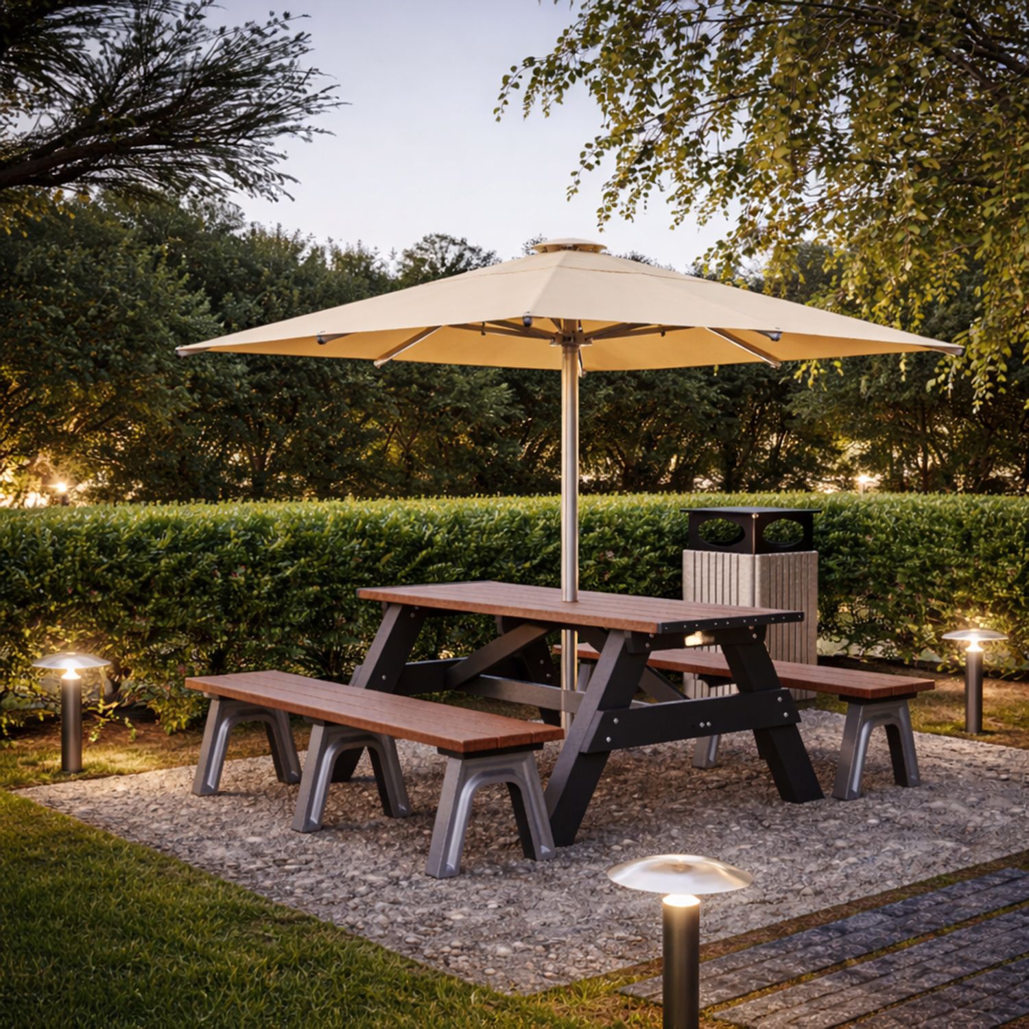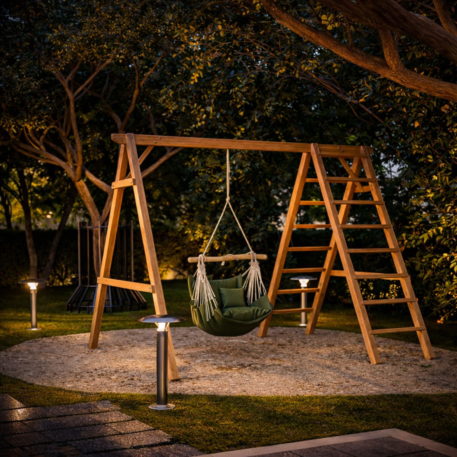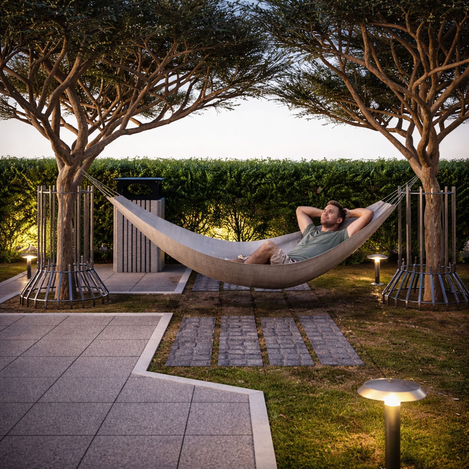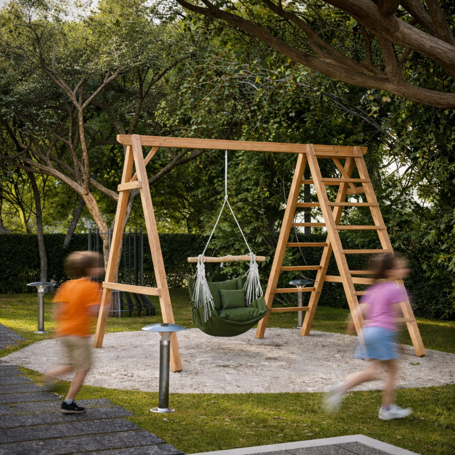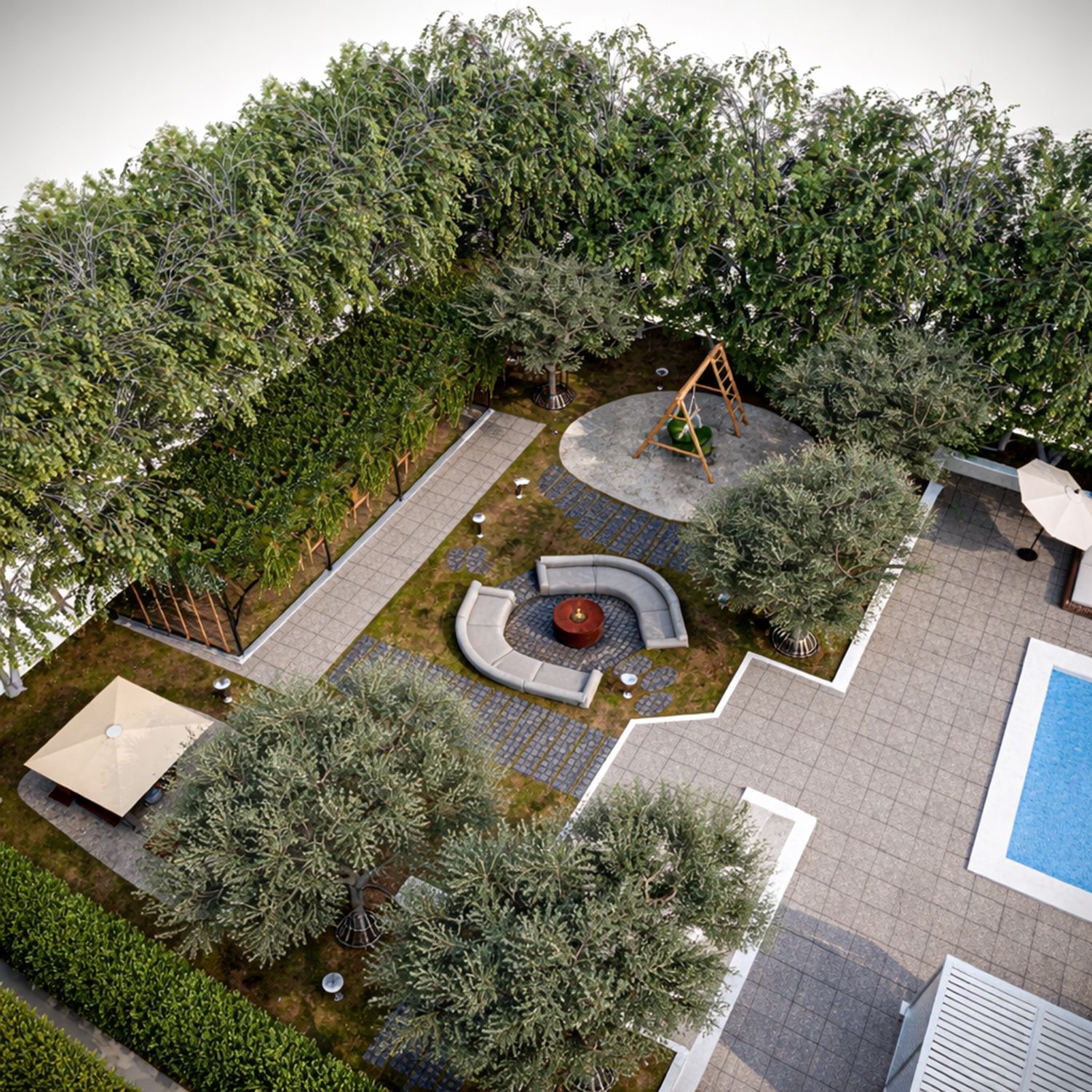 In addition to the central gathering space, the courtyard includes several complementary areas. A dedicated chill-out zone provides a more relaxed setting for rest and informal use, while a swing element introduces a playful and leisurely feature within the landscape. Another section of the courtyard is organized as a shaded seating area, equipped with a sun umbrella, offering comfort during warmer periods and extending usability throughout the day.