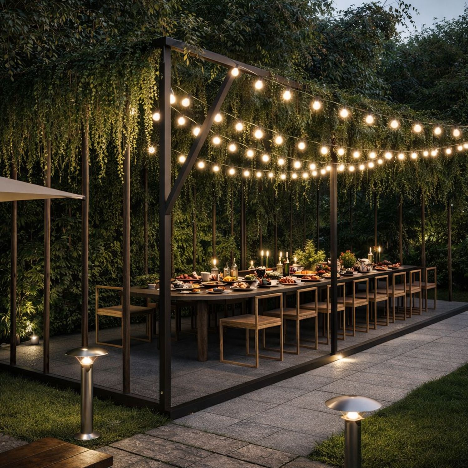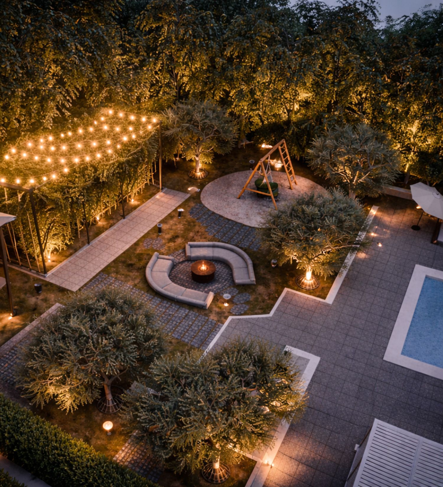 The existing pavilion retains its original position within the layout, preserving the spatial balance of the courtyard. However, it has been enhanced both functionally and aesthetically. The pavilion now accommodates a buffet-style serving area (Swedish table), making it suitable for hosting and entertaining. Its ambiance is further enriched through the integration of carefully designed lighting and lush greenery, contributing to a more inviting and refined atmosphere.