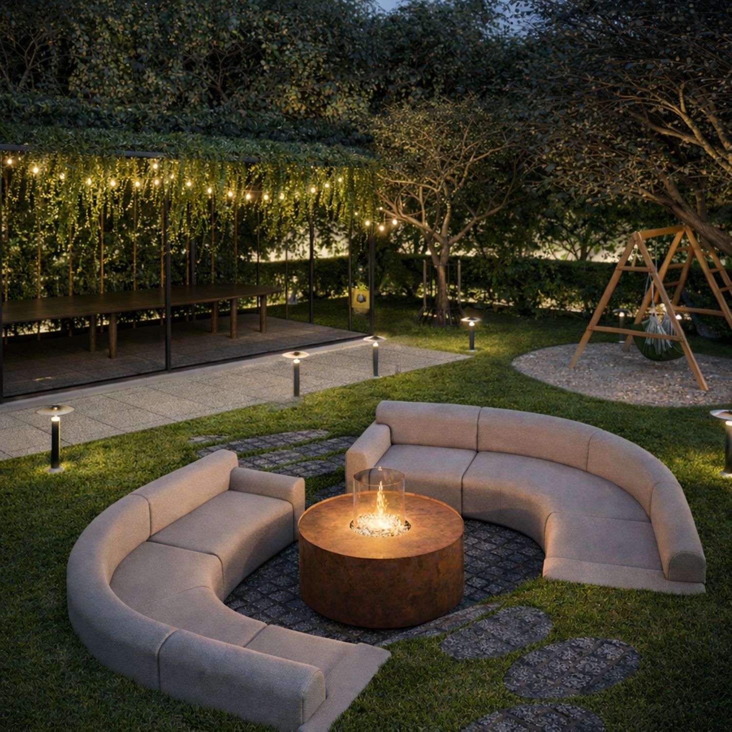The layout is structured around a network of pathways that guide movement through the space. These paths naturally lead toward a central focal point—a slightly sunken seating area designed around an outdoor fireplace. This central zone acts as the heart of the courtyard, encouraging gathering and creating an intimate atmosphere enhanced by the lowered level and surrounding elements.