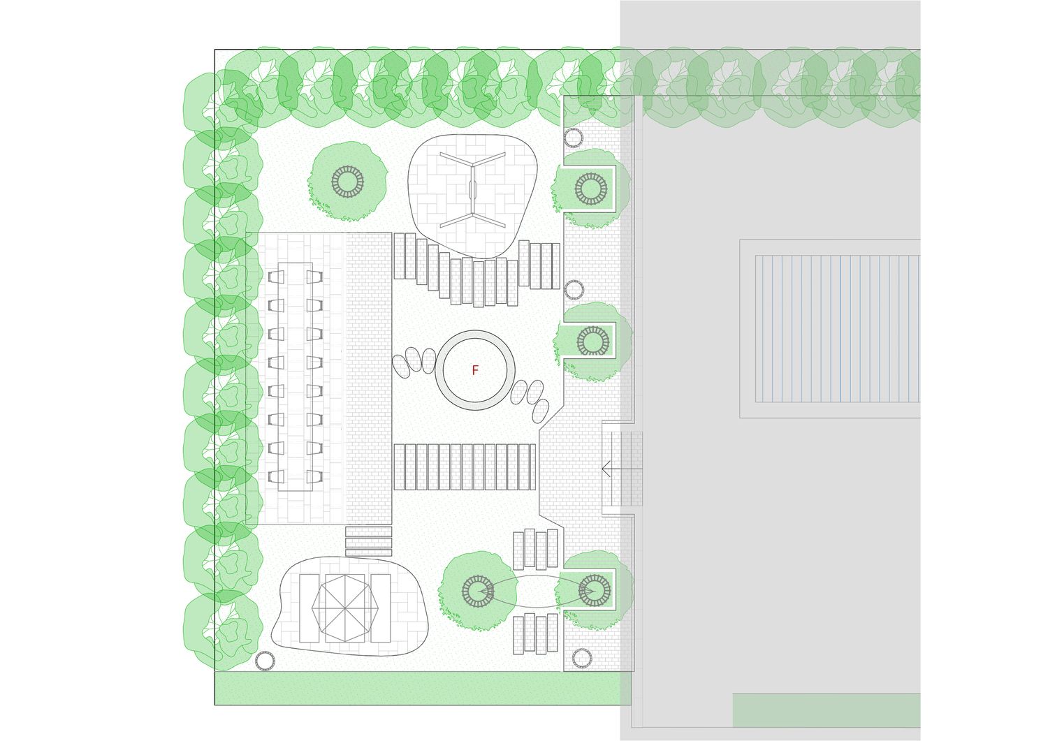 The architectural concept of the courtyard design is based on creating a dynamic and multifunctional outdoor space that offers a variety of experiences within a cohesive layout. The organization of the courtyard is carefully planned to provide multiple zones for relaxation, socializing, and movement, ensuring both functionality and visual interest.