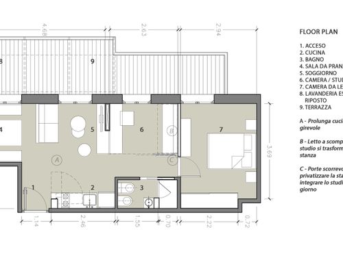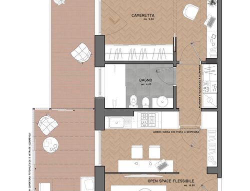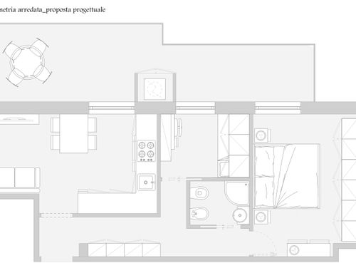 I would like to obtain a complete renovation aimed at enhancing this small Roman penthouse using brightness and panorama, taking advantage of the 110% eco-bonus, if possible I am inclined to exploit the external spaces as a covering surface with the installation of photovoltaic panels and brie soleil . Maximum attention to acoustic and thermal insulation (apartment facing north). I love light, clean lines, corten, ecological solutions, home automation, uniform flooring, hidden wardrobes and retractable furniture. I am single and it will be essential to provide the room for my daughter that can also be used as a study in the future, my bed (necessarily retractable) can be integrated into the rest of the apartment. I prefer underfloor heating and hidden air conditioning. I have always appreciated solutions that include an induction hob and integrated elements for the kitchen. Maximum budget € 60,000.00